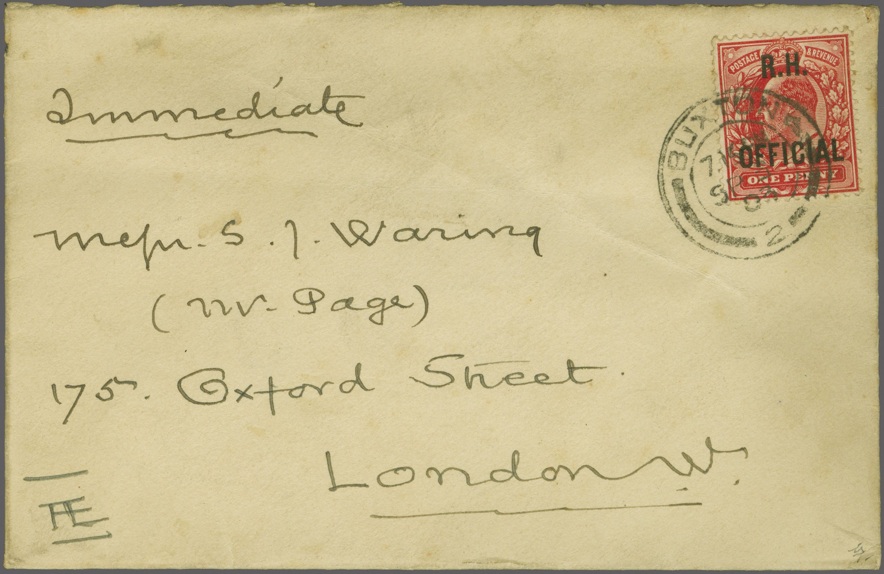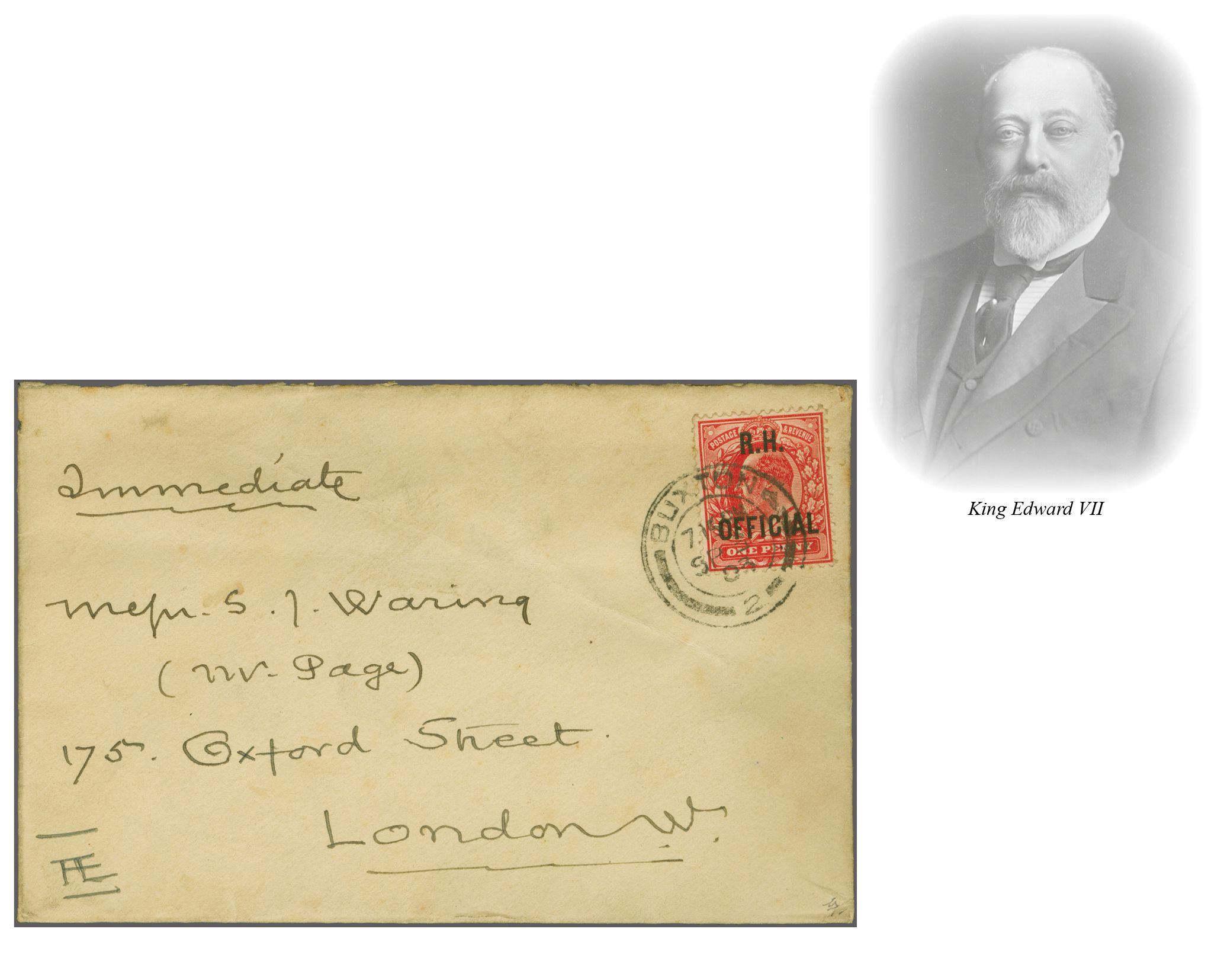 King Edward VII / R.H. Official 1902: R.H. Official 1 d. scarlet, a used example on 1903 envelope endorsed "Immediate", addressed all in the hand of King Edward VII, to Messrs. S. J. Waring of 175 Oxford Street, London tied by