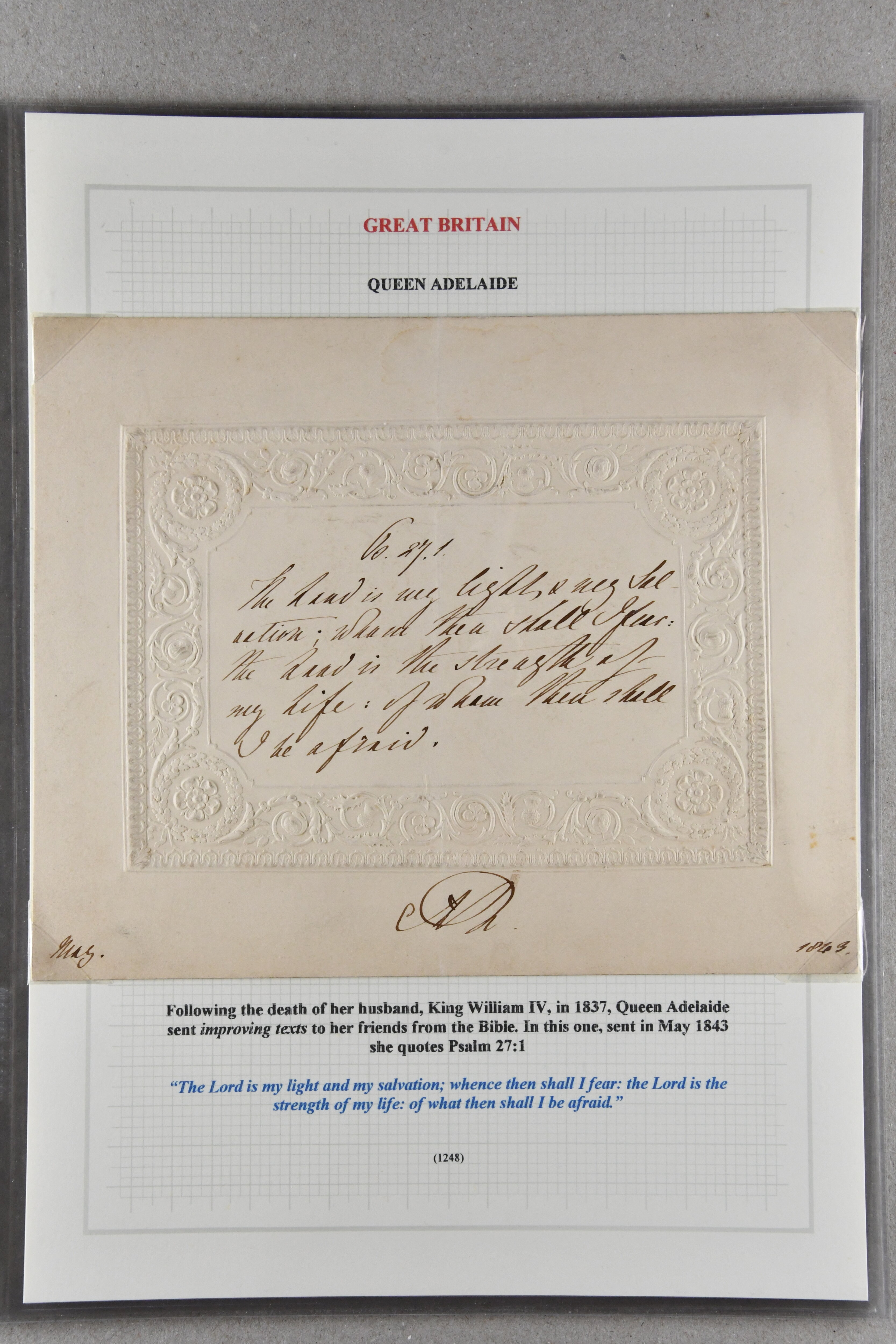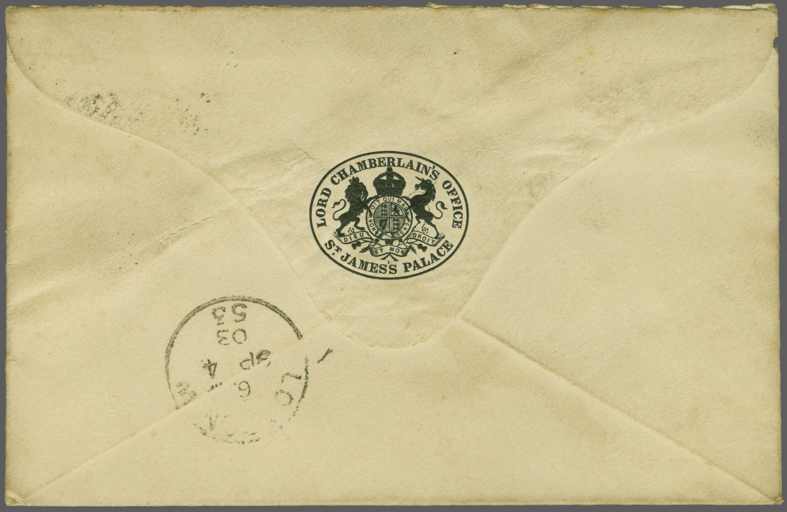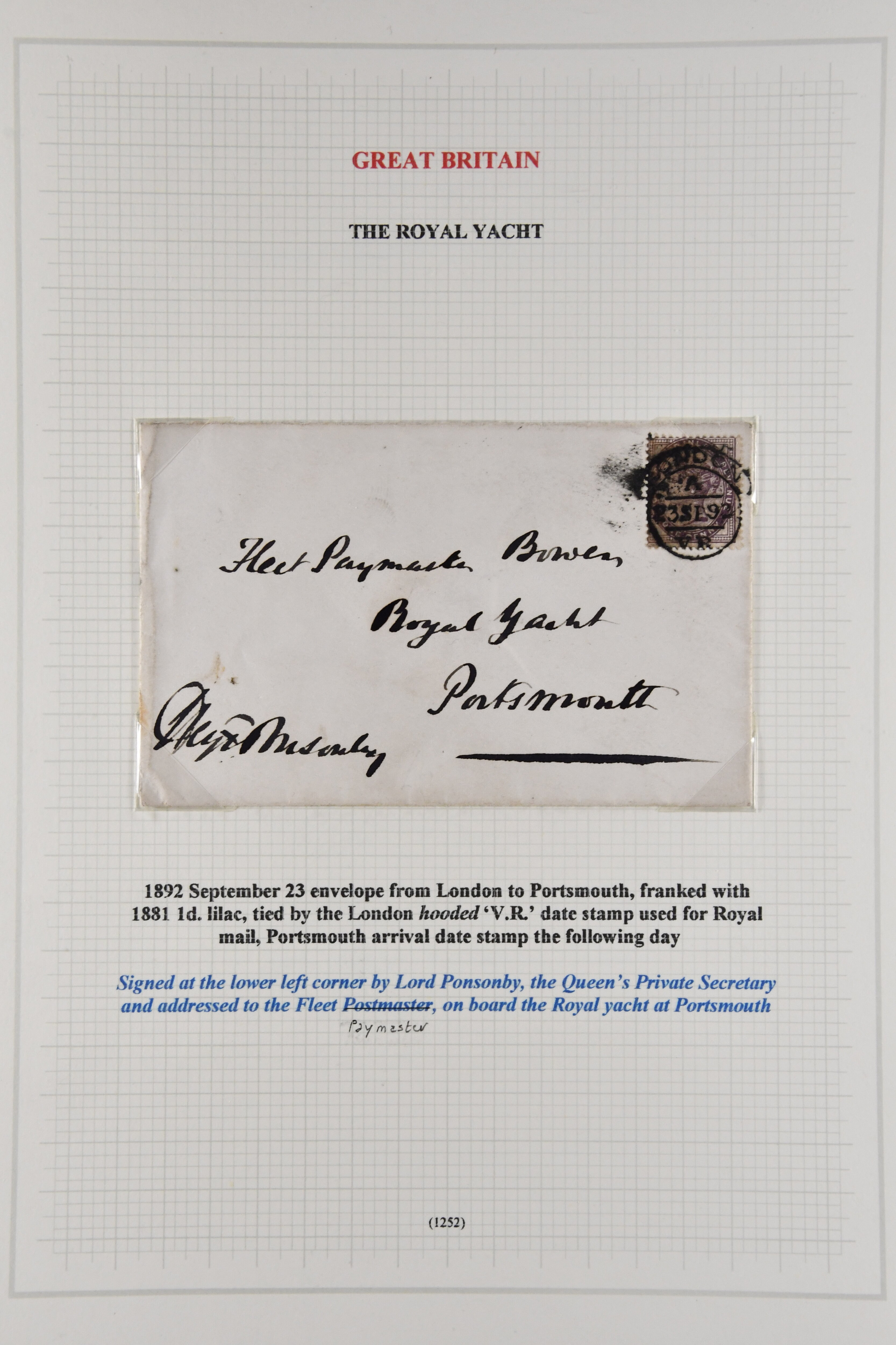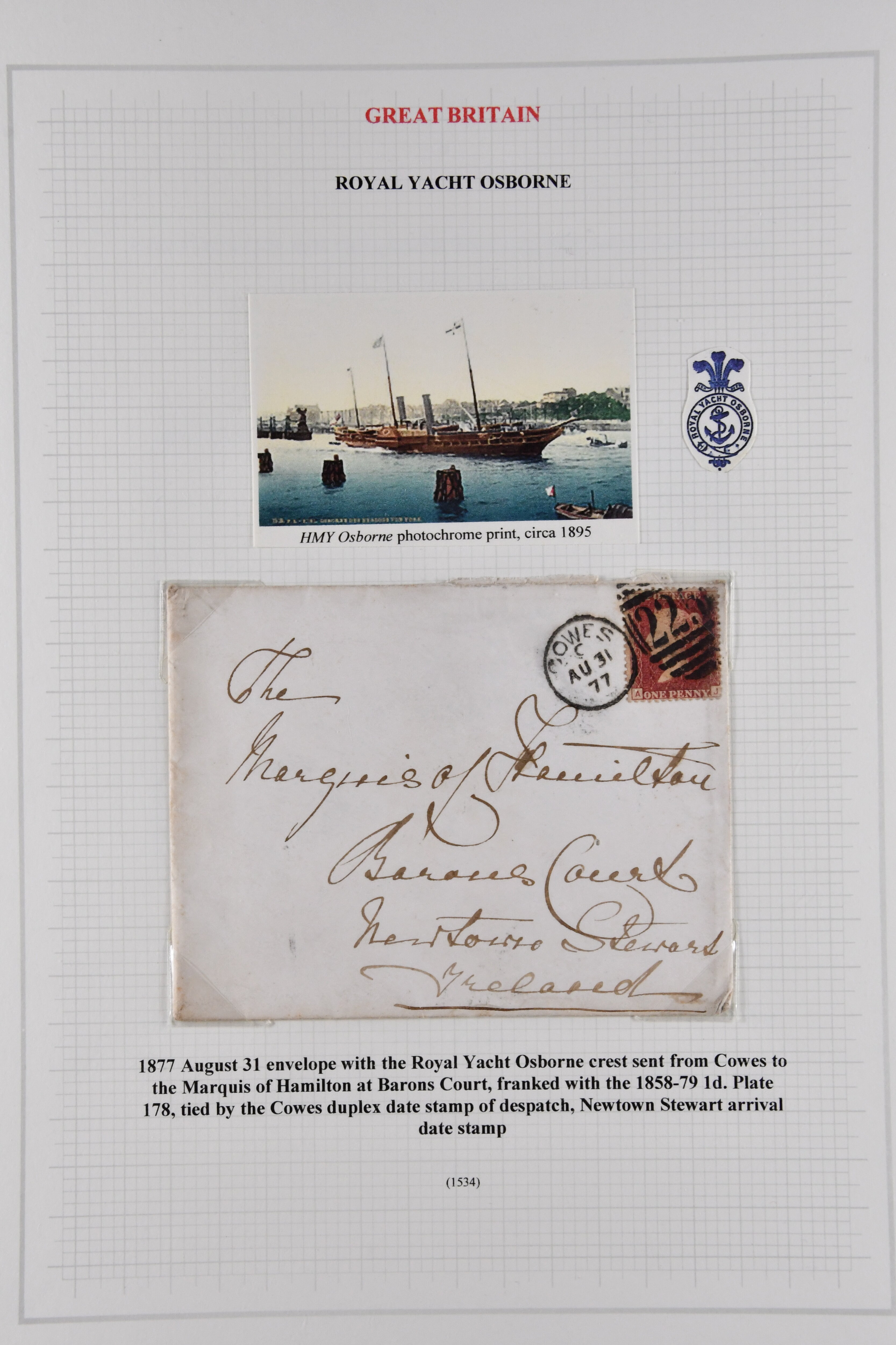 over with him"; 1843 signed card from Queen Adelaide following the death of her husband King William IV; 1877 cover with crest of the "Royal Yacht Osborne" franked 1 d. red tied by "Cowes / 225" duplex; 1888 imprinted cover from the Treasurer to the