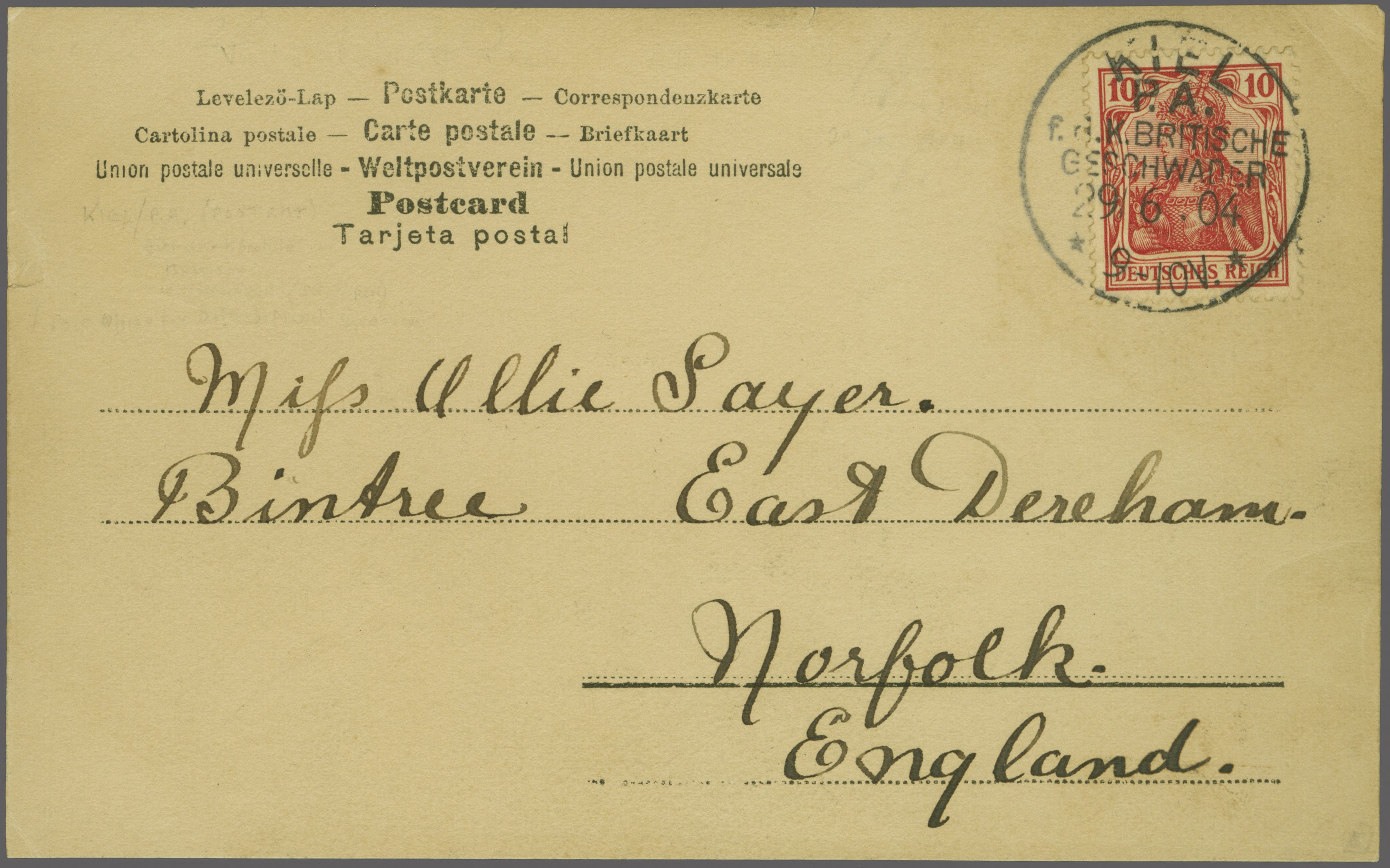King Edward VII 1904: Postcard to Norfolk, England franked by Germania 10 pf. carmine tied by bold strike of circular "KIEL / P.A. / f.a.k. BRITISCHE / GESCHWADER / 29. 6. 04" datestamp in black. Rare and very fine, this
