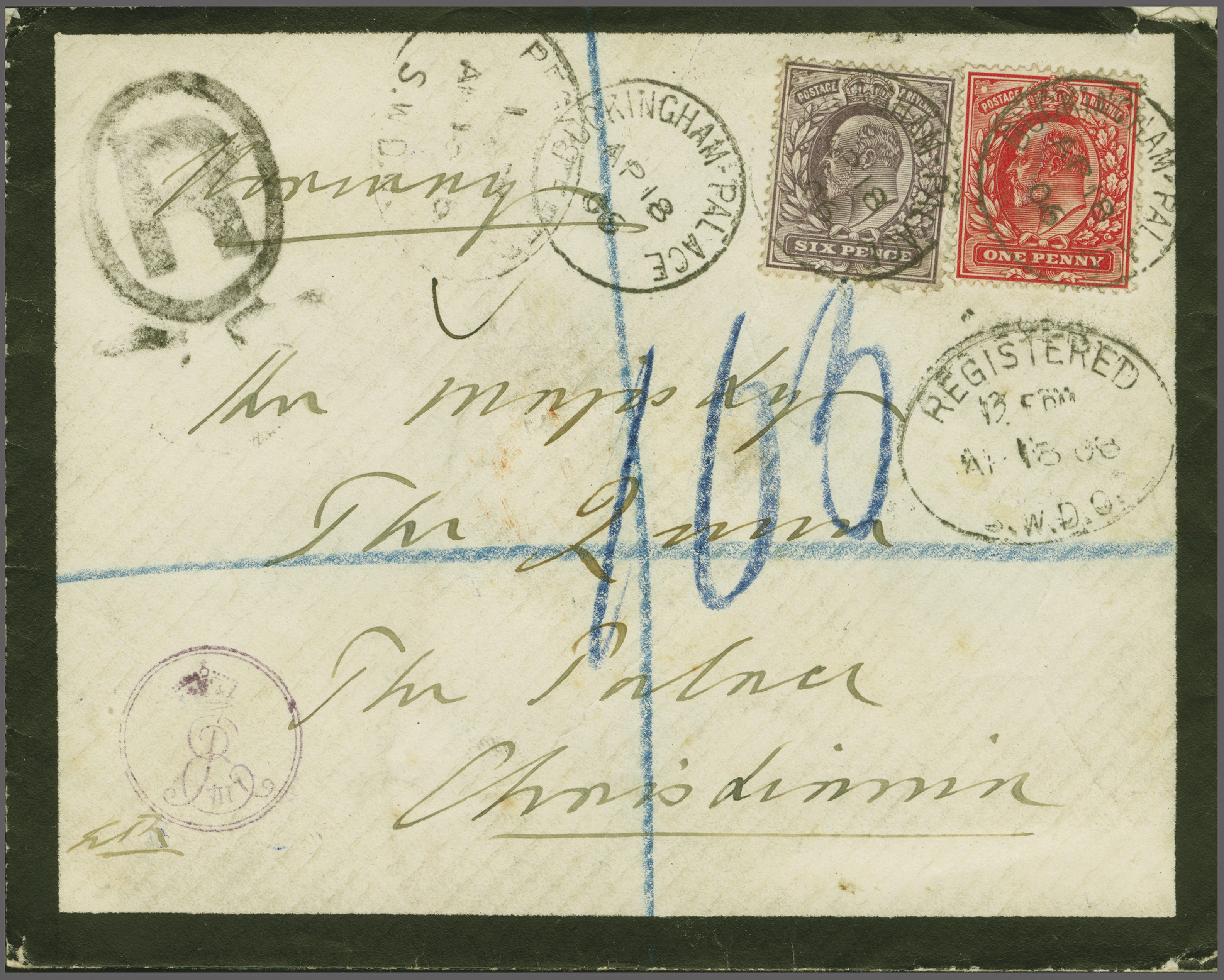 1902: 1 d. scarlet and 6 d. pale dull purple, used on 1906 registered mourning envelope to "Her Majesty the Queen, The Palace, Christiania, Norway" tied by "BUCKINGHAM PALACE" cds's (April 18) with King Edward VII's Royal