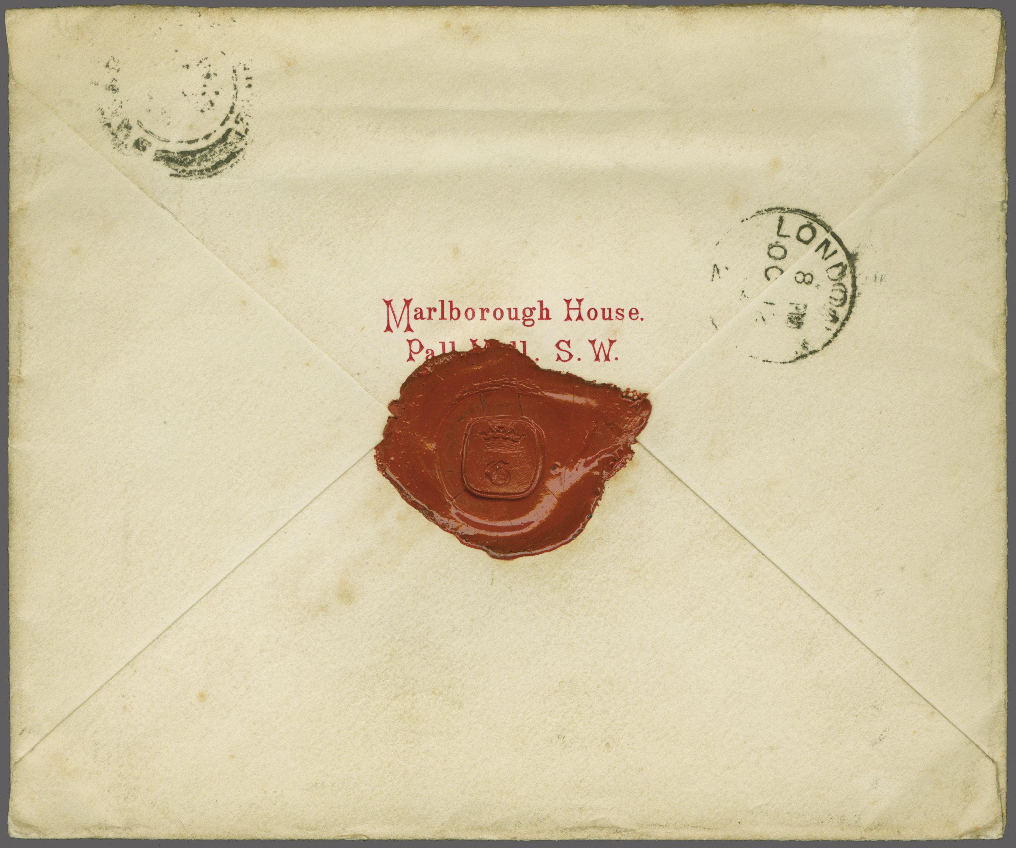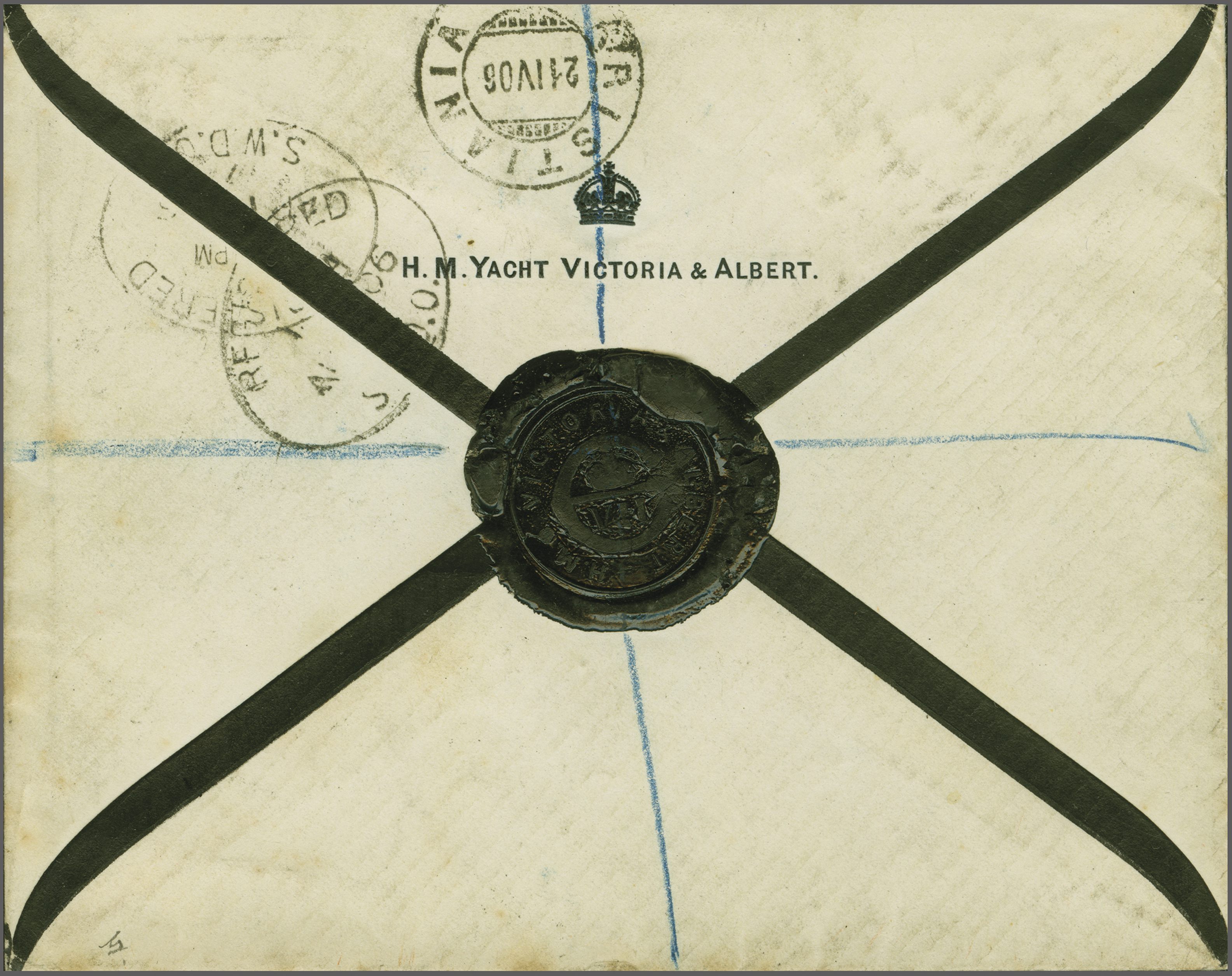 Norway and became King Haakon VII. Note: At the time of this letter King Edward VII and Queen Alexandra were setting off to cruise Greece and Italy. The envelope bears the embossed "♚ / H.M. Yacht Victoria & Albert" on reverse (Image 1)
