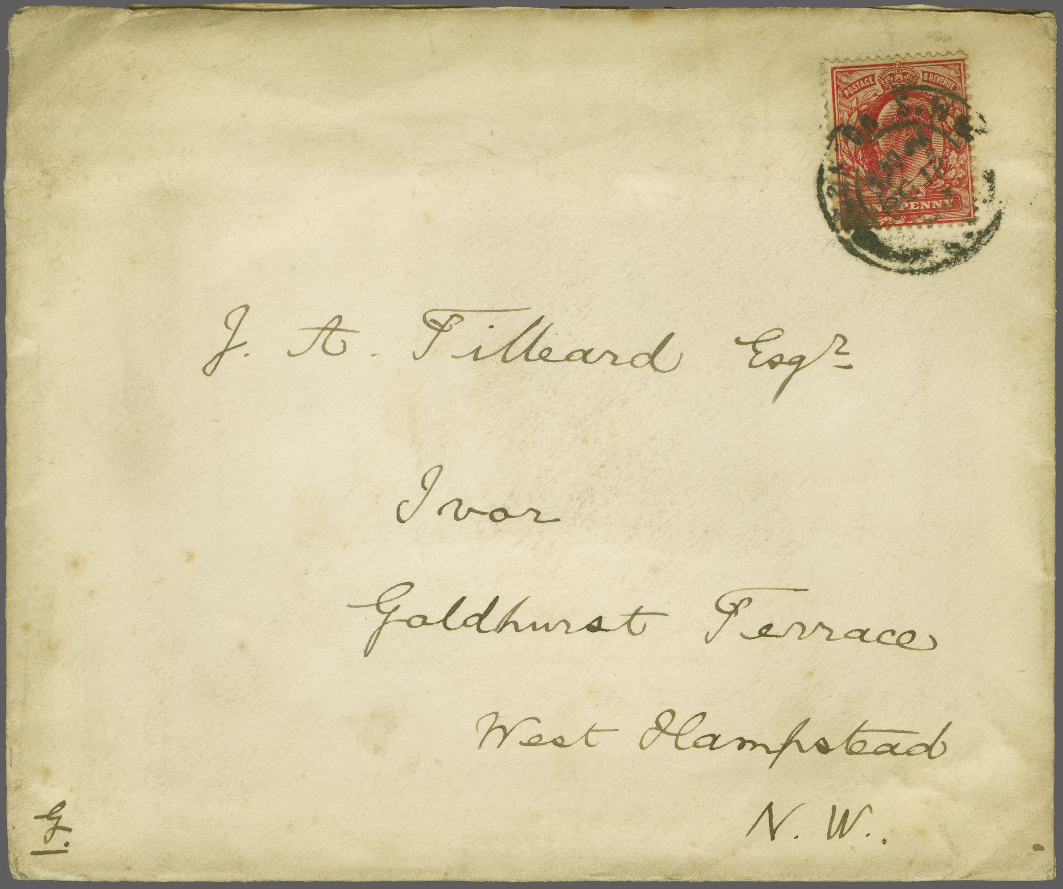 the ones you wish to keep, you might send him back the remainder if there are any. They will be a very valuable addition to my collection. I am just leaving for Sandringham. In haste, very sincerely yours, George". The envelope bears a 1902 1 d.