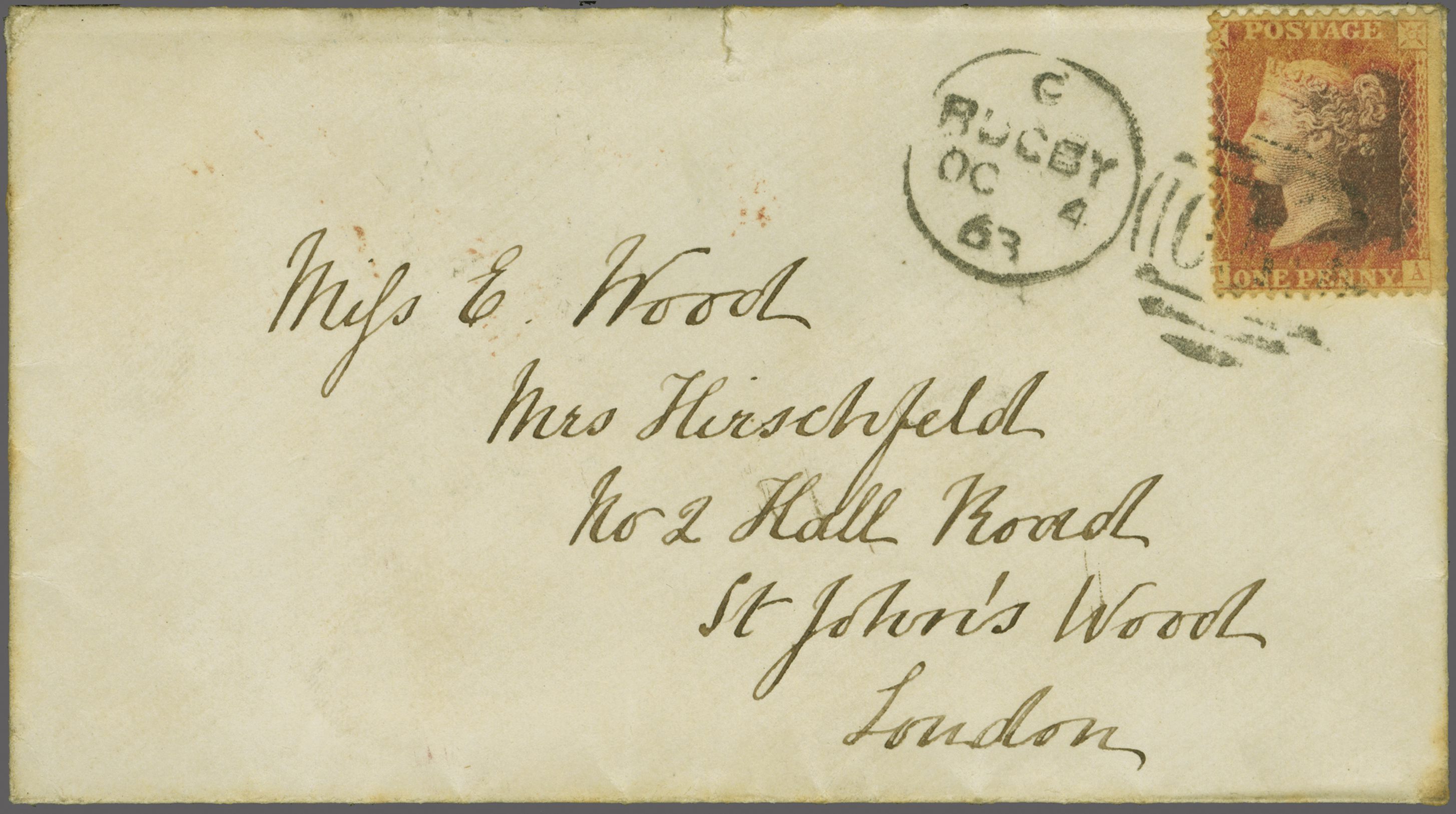 Stamp Collecting 1856/61: 1 d. red star, perf. 14, used on 1863 cover to Miss E. Wood in St. John's Wood, London tied by "Rugby / 659" duplex (Oct 4). Fine letter from the addressee's brother at private school in Rugby: "I