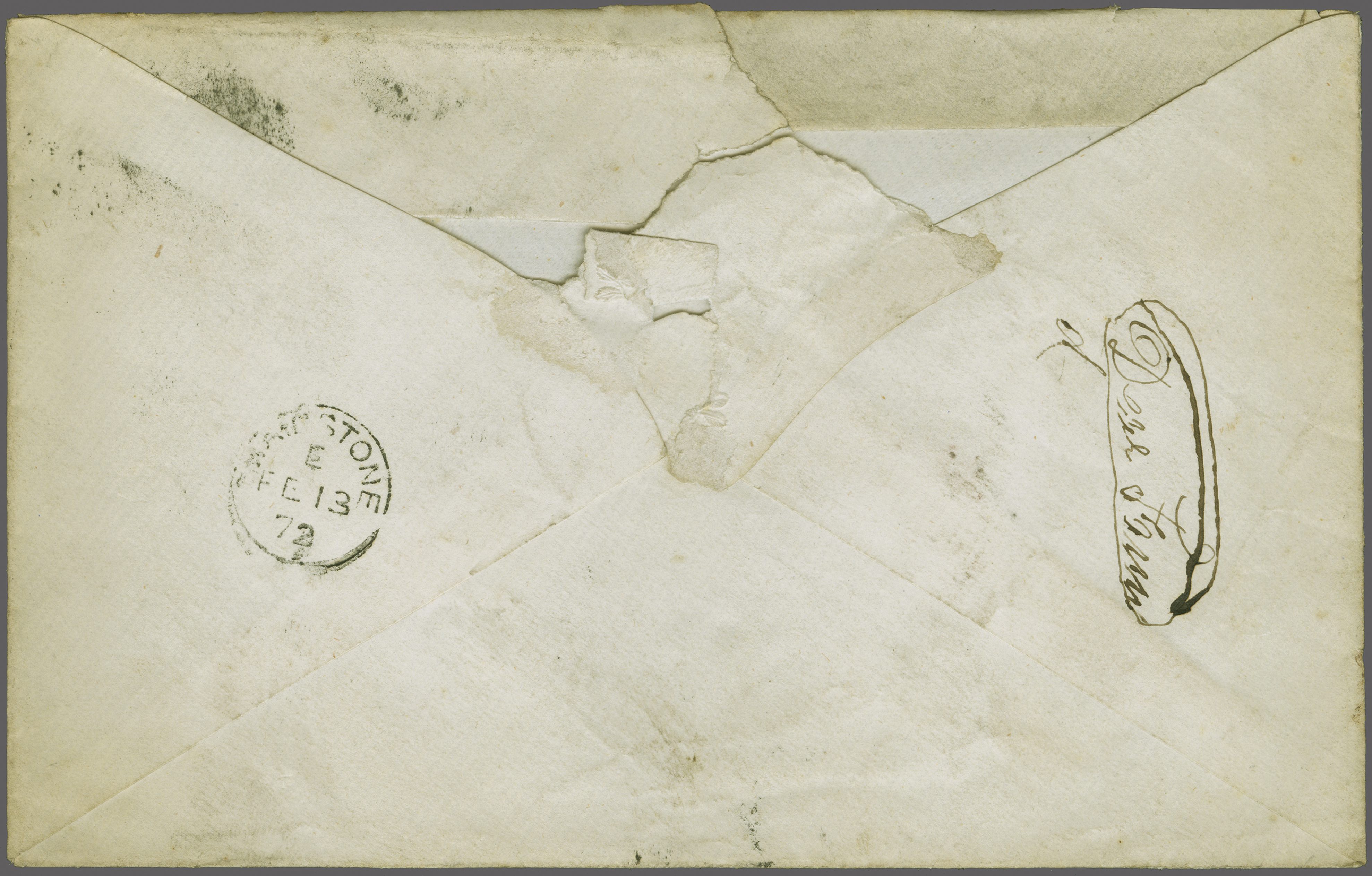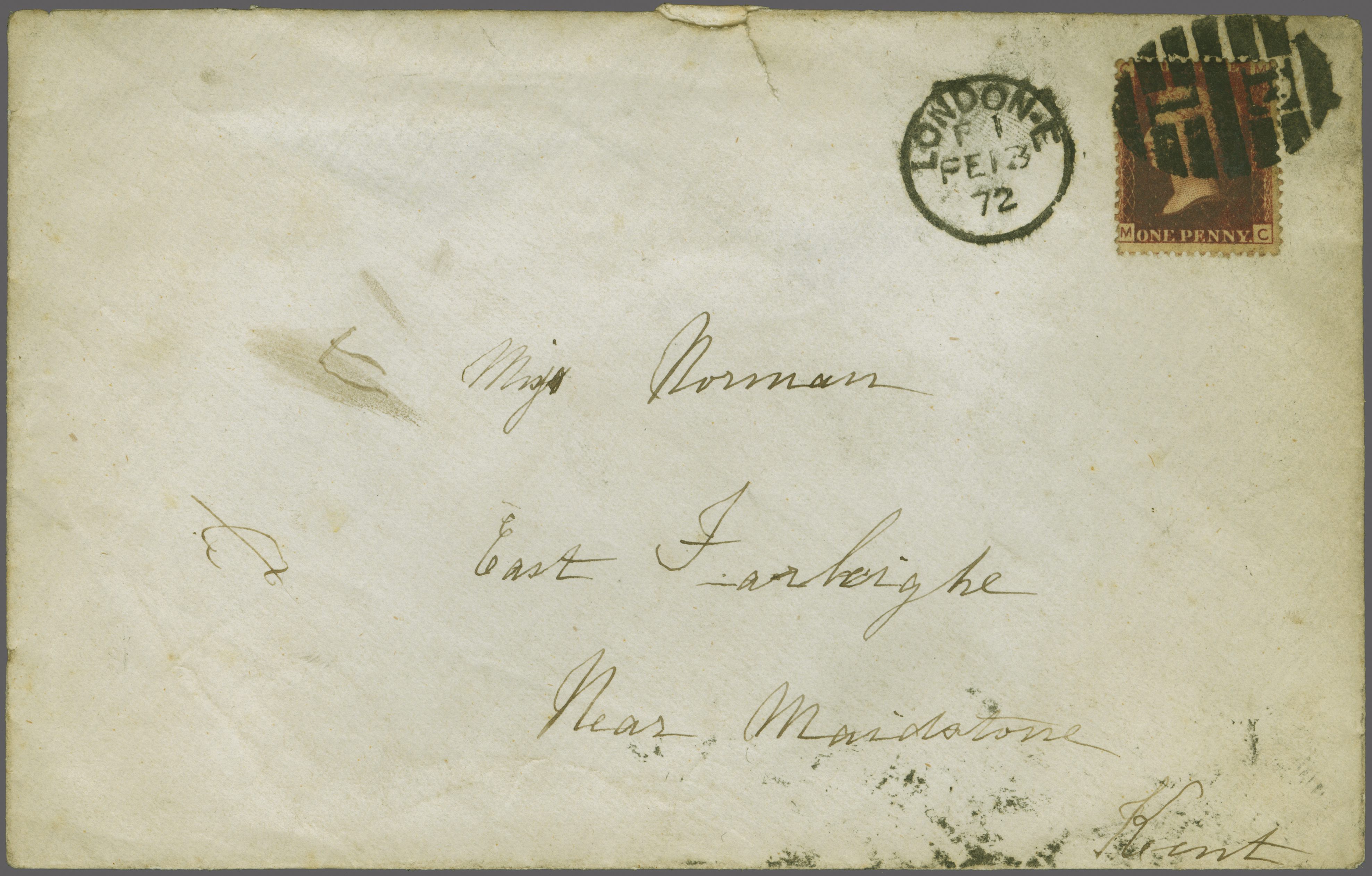 Valentine 1864/79: 1 d. red, plate 153, used on 1872 cover from London to Maidstone tied by "E1" obliterator with London cds (Feb 13) alongside, with delightful Valentine enclosure showing flowers, birds and gold decorative