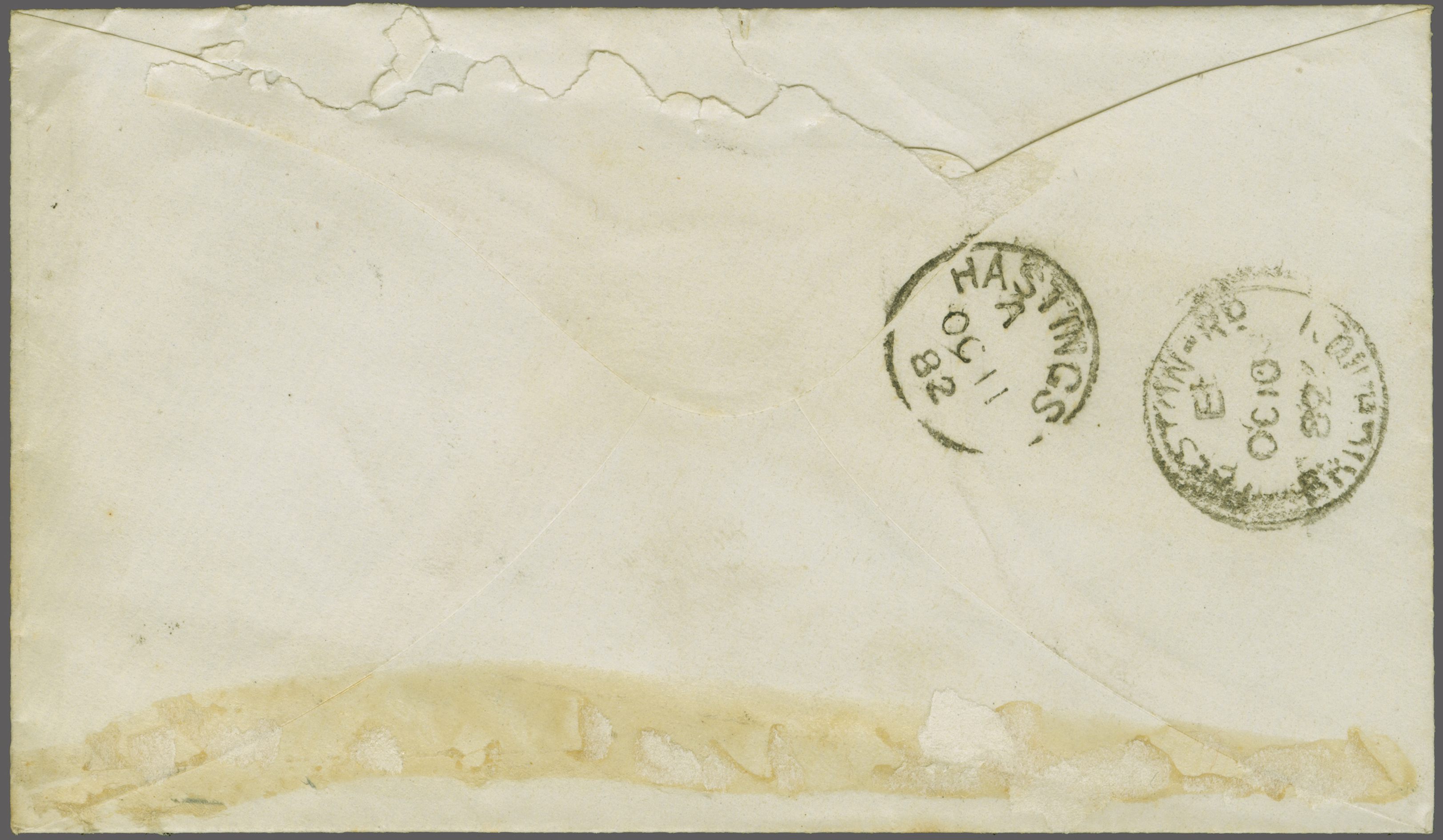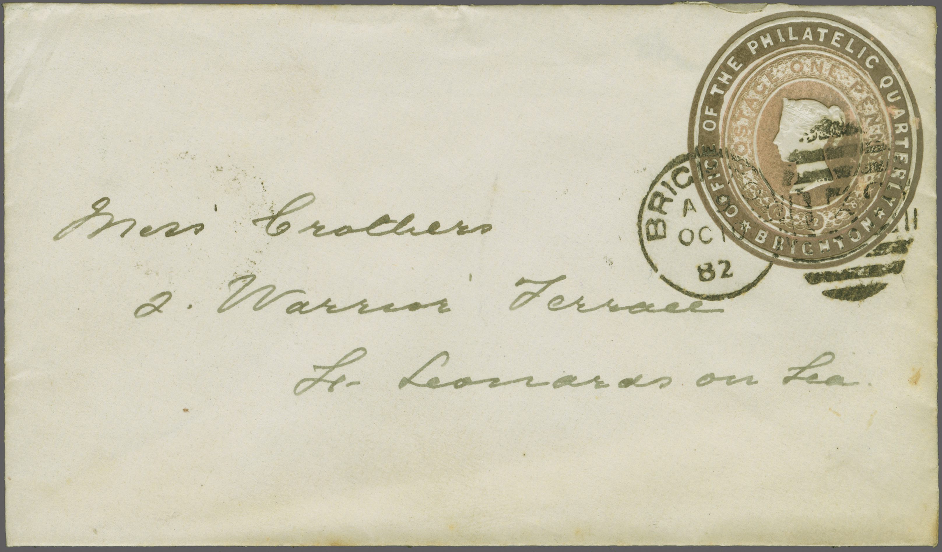 Stamp Collecting 1882: 1 d. pink envelope with embossed advertising ring in brown for "OFFICE OF THE PHILATELIC QUARTERLY / BRIGHTON", used to St. Leonards on Sea tied by neat "Brighton / 132" duplex (Oct 10) in black. Reverse