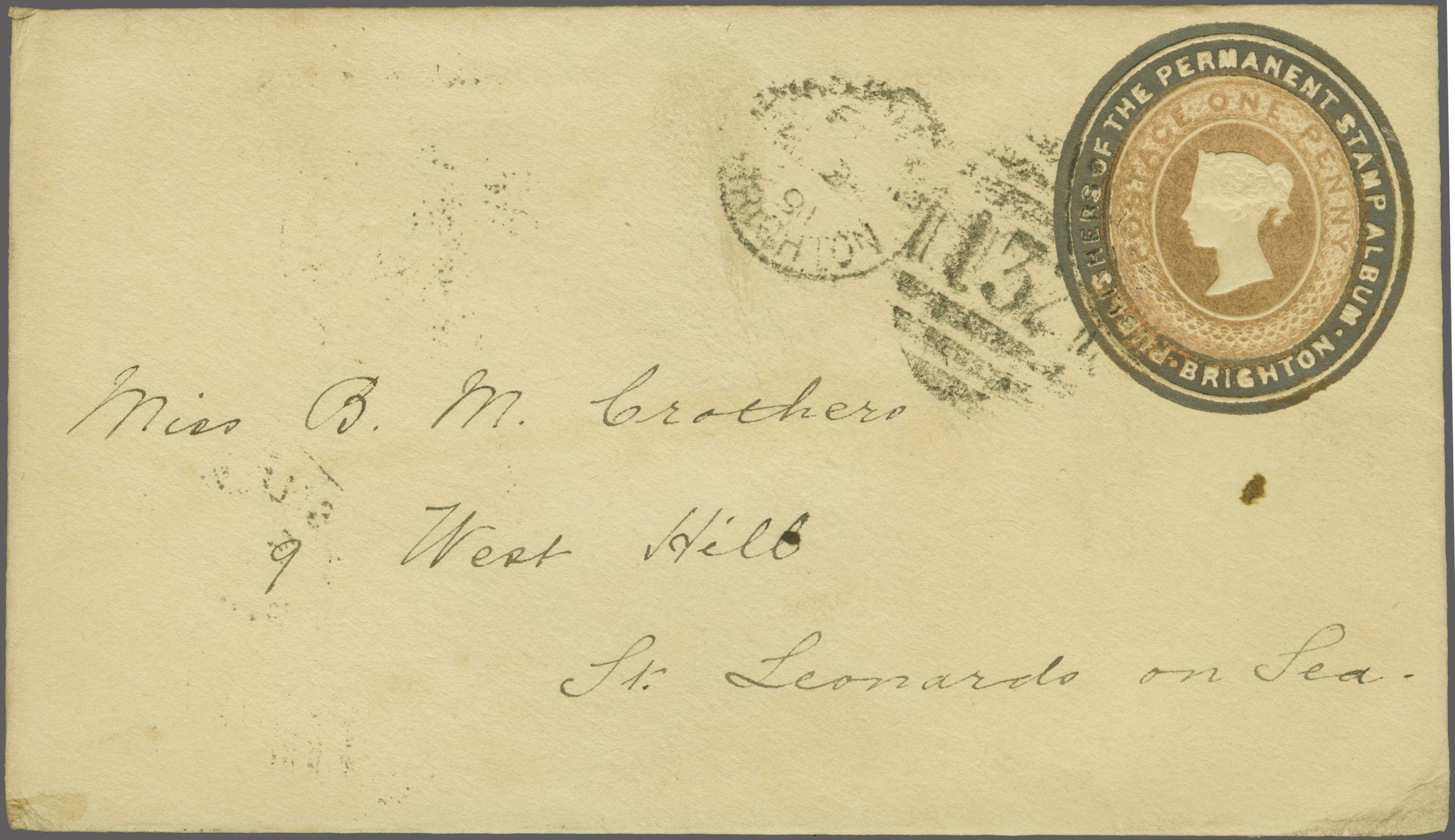 Stamp Collecting 1891: 1 d. pink envelope with embossed advertising ring in brown for "PUBLISHERS OF THE PERMANENT STAMP ALBUM / BRIGHTON", used to St. Leonards on Sea tied by "Brighton / 132" duplex (March 9) in black.