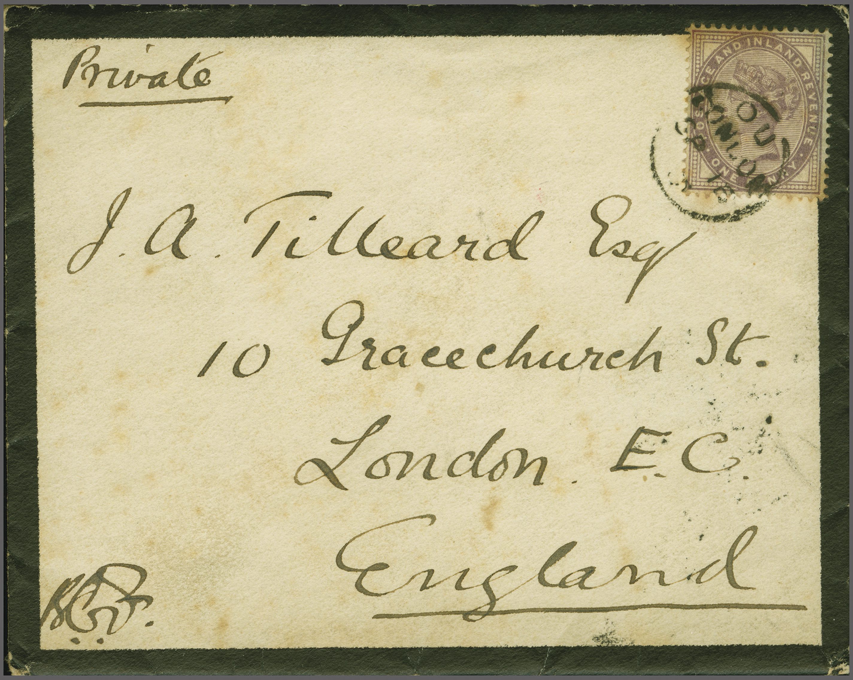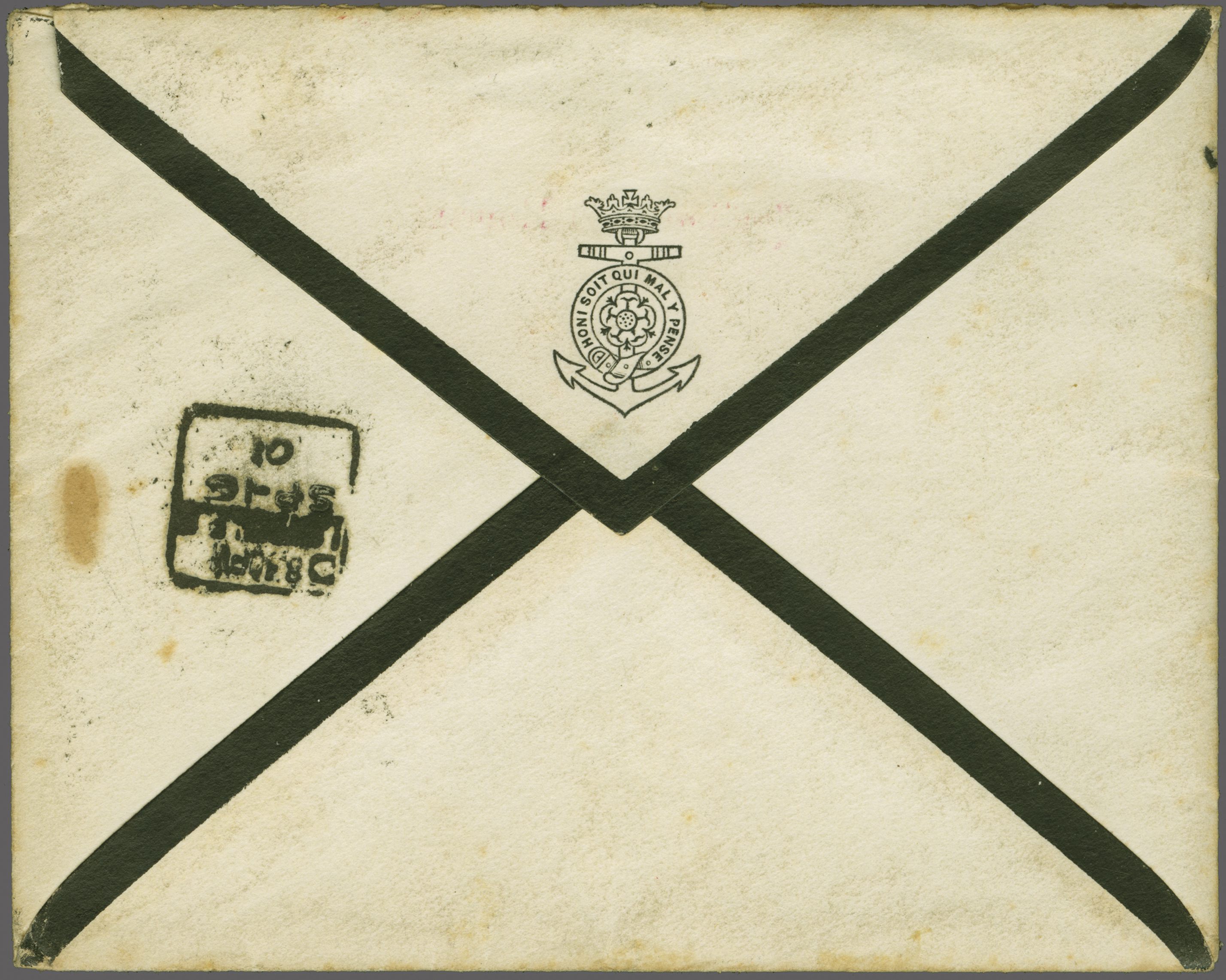 Stamp Collecting 1901 (Aug 27): Mourning envelope and letter written from "HMS Ophir" headed "Cape Town to St. Vincent", written by B. Godfrey-Faussee, ADC to His Royal Highness the Duke of Cornwall and York (later George V),