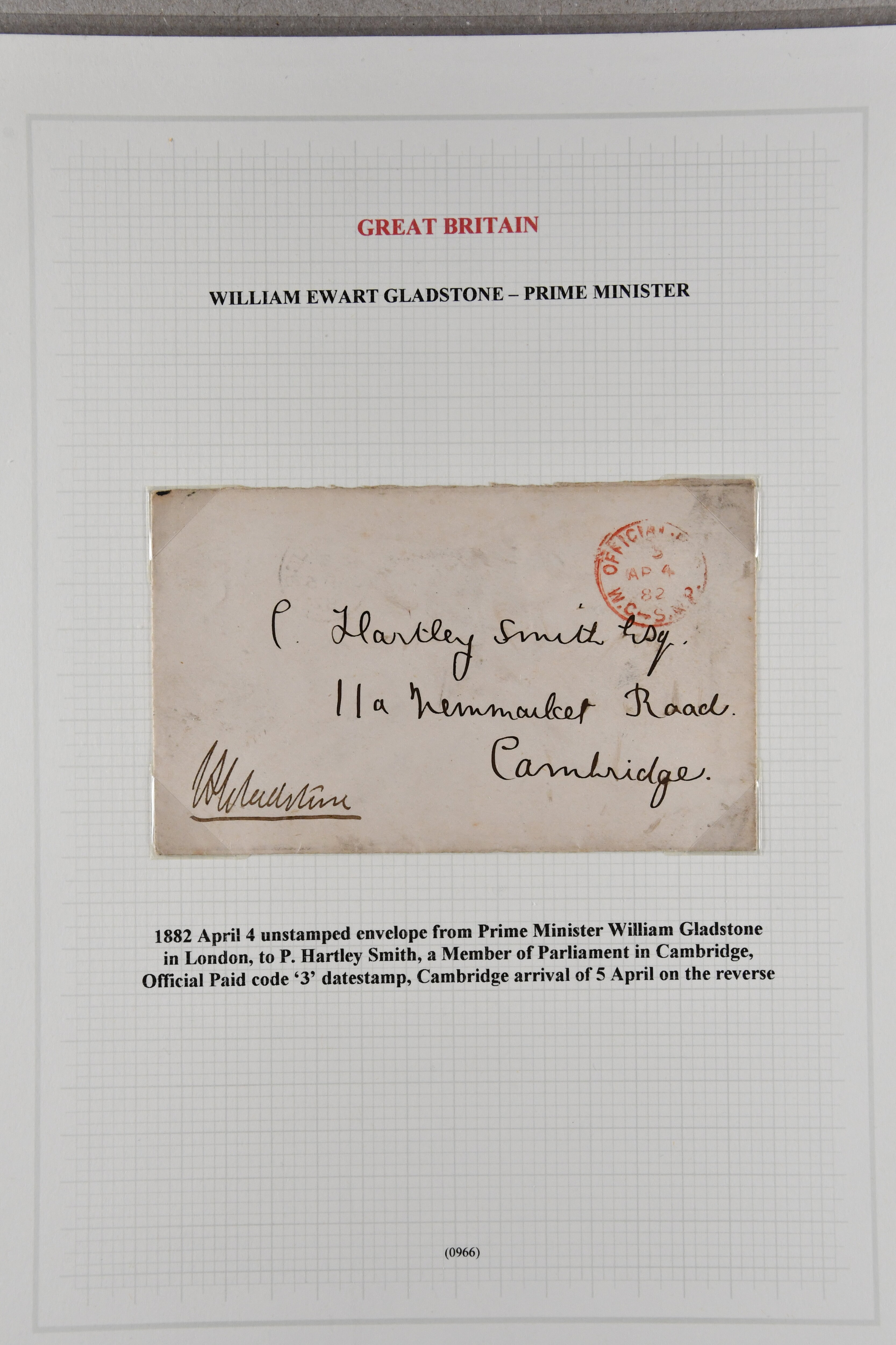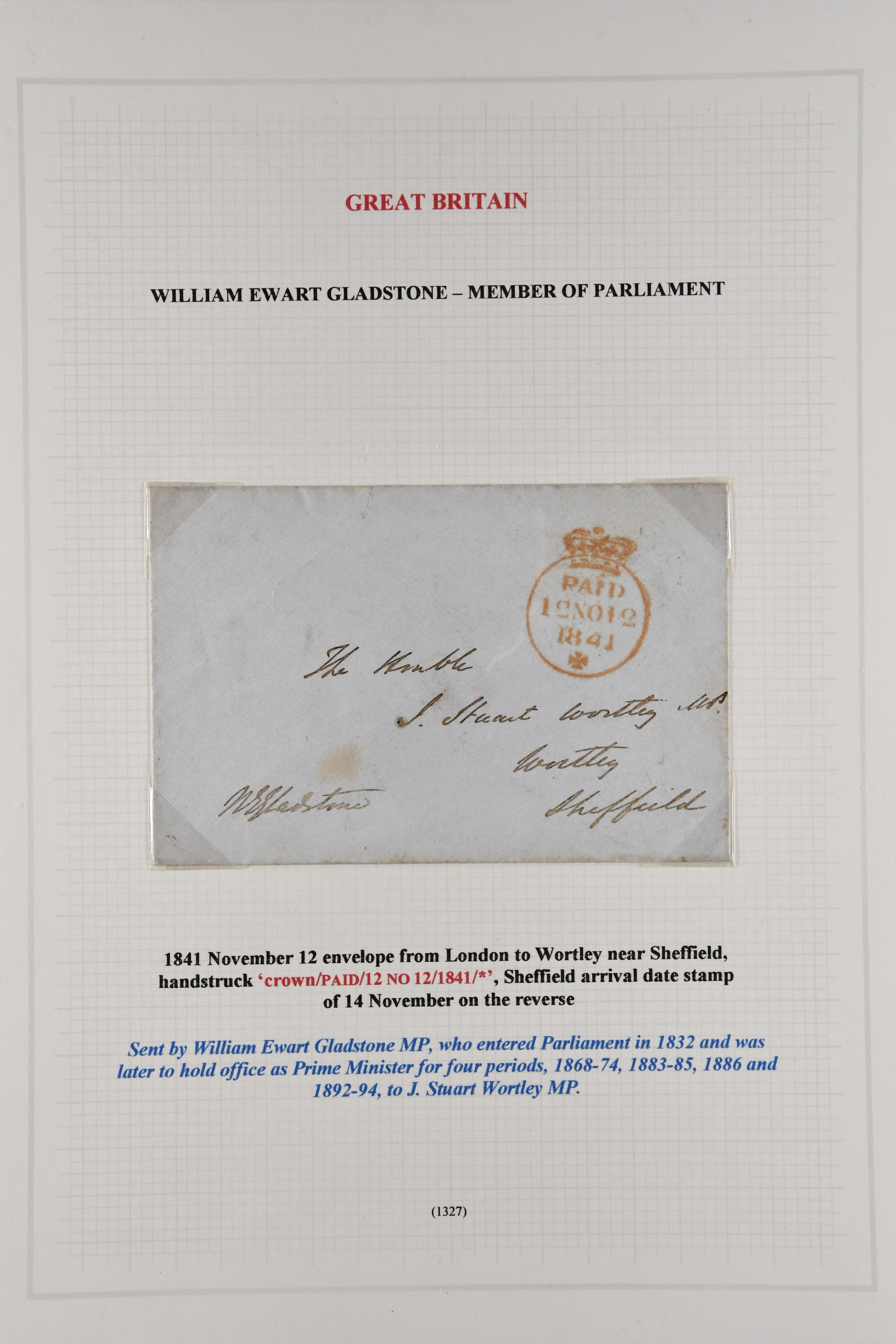 Prime Minister's 1841/82: Covers (3) from William Ewart Gladstone (1809-1898) with 1841 cover prior to Offfice mailed to J. Stuart Wortley MP in Sheffield with "♚ / Paid" in red; mourning envelope and contents to