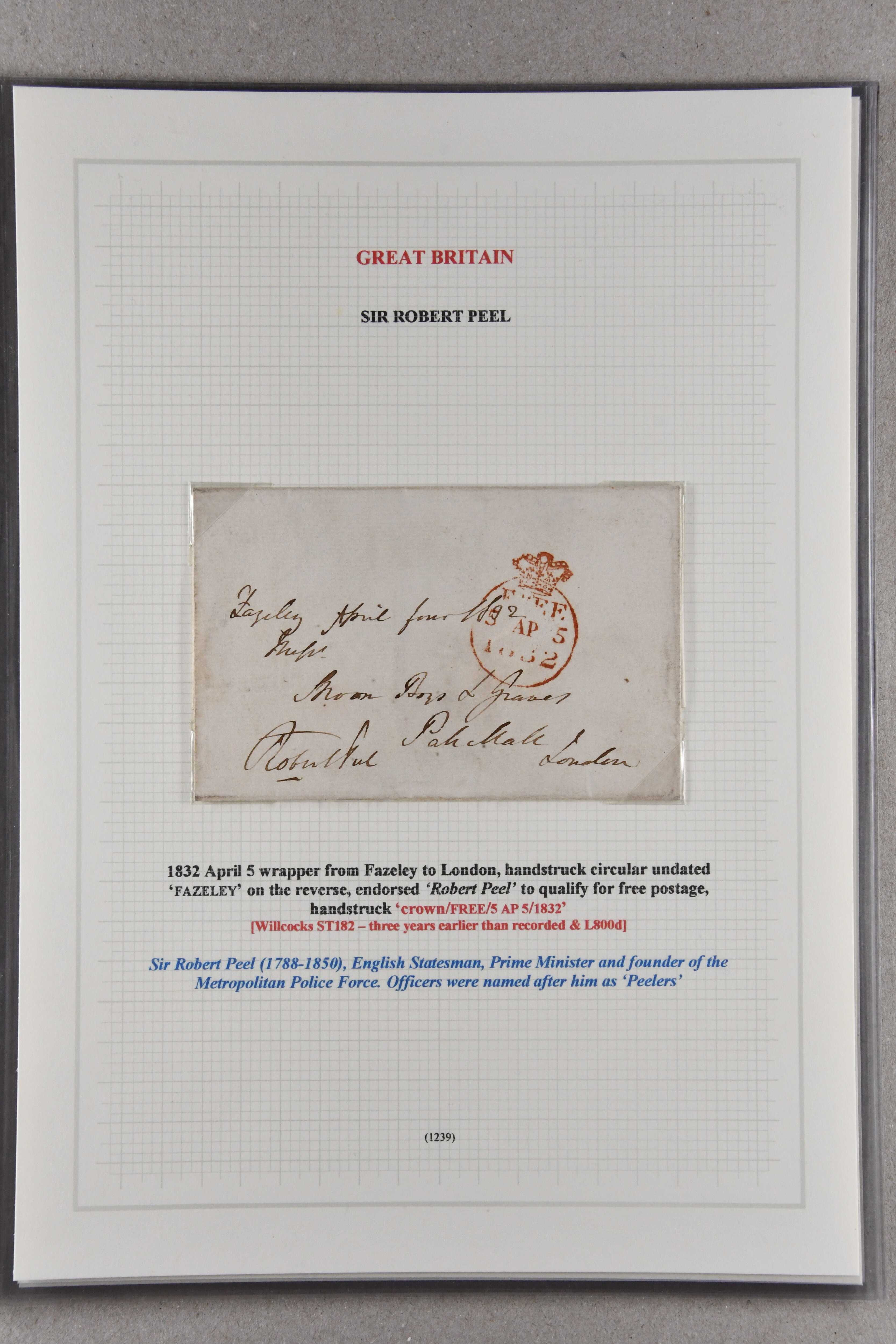 Prime Ministers 1832/57: Small group (4 items) with 1832 cover to Pall Mall signed "Robert Peel" with fine "♚ / FREE" datestamp in red (April 5) and reverse with FAZELEY undated circle of despatch in black; 1835