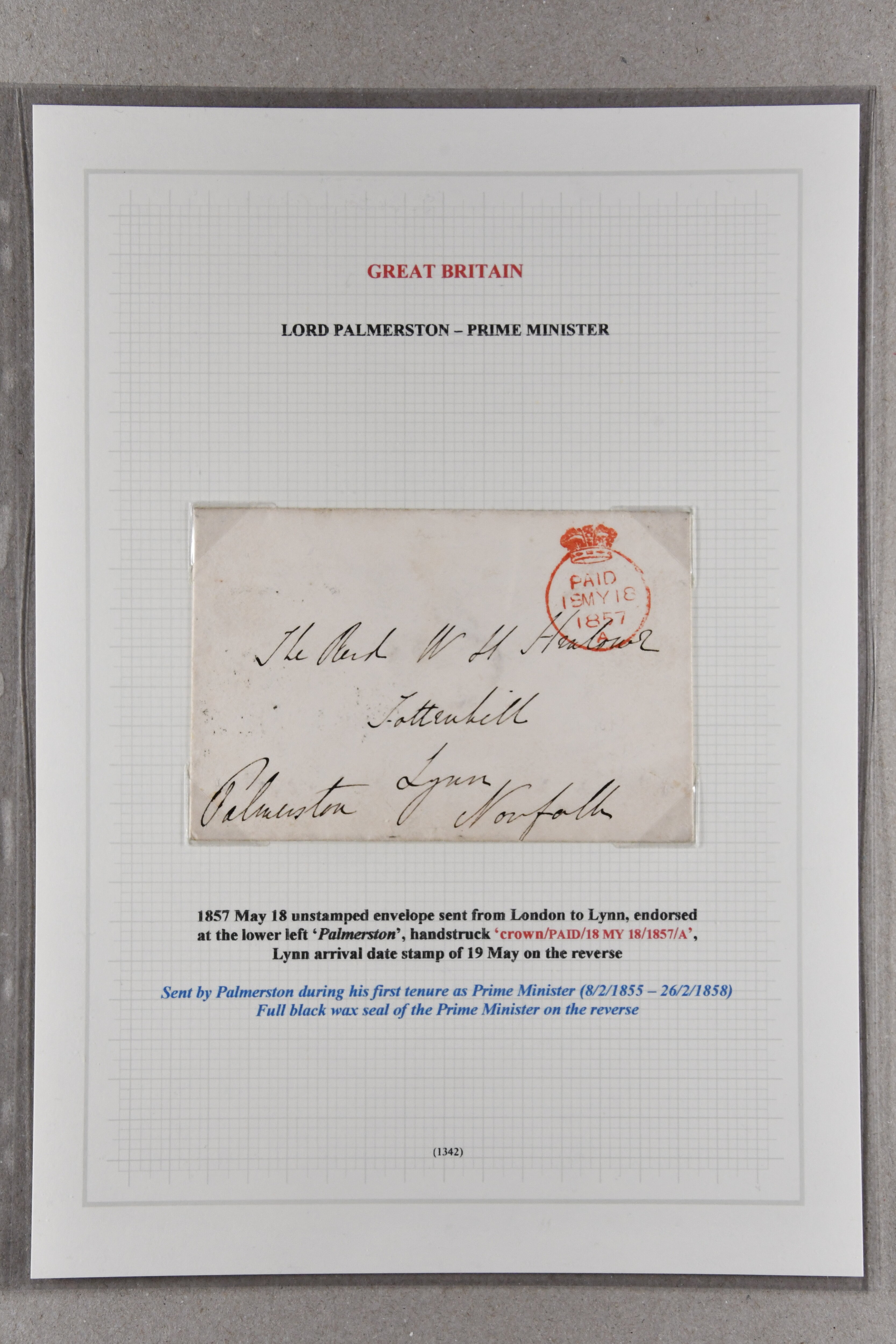 and 1838 covers both from the Duke of Wellington at Stratfield Saye, each endorsed "Hartford Bridge" and "Free Wellington" with "♚ / FREE" datestamps in red and 1857 cover mailed during Lord Palmerston's first tenure as PM to Norfolk, signed at lower