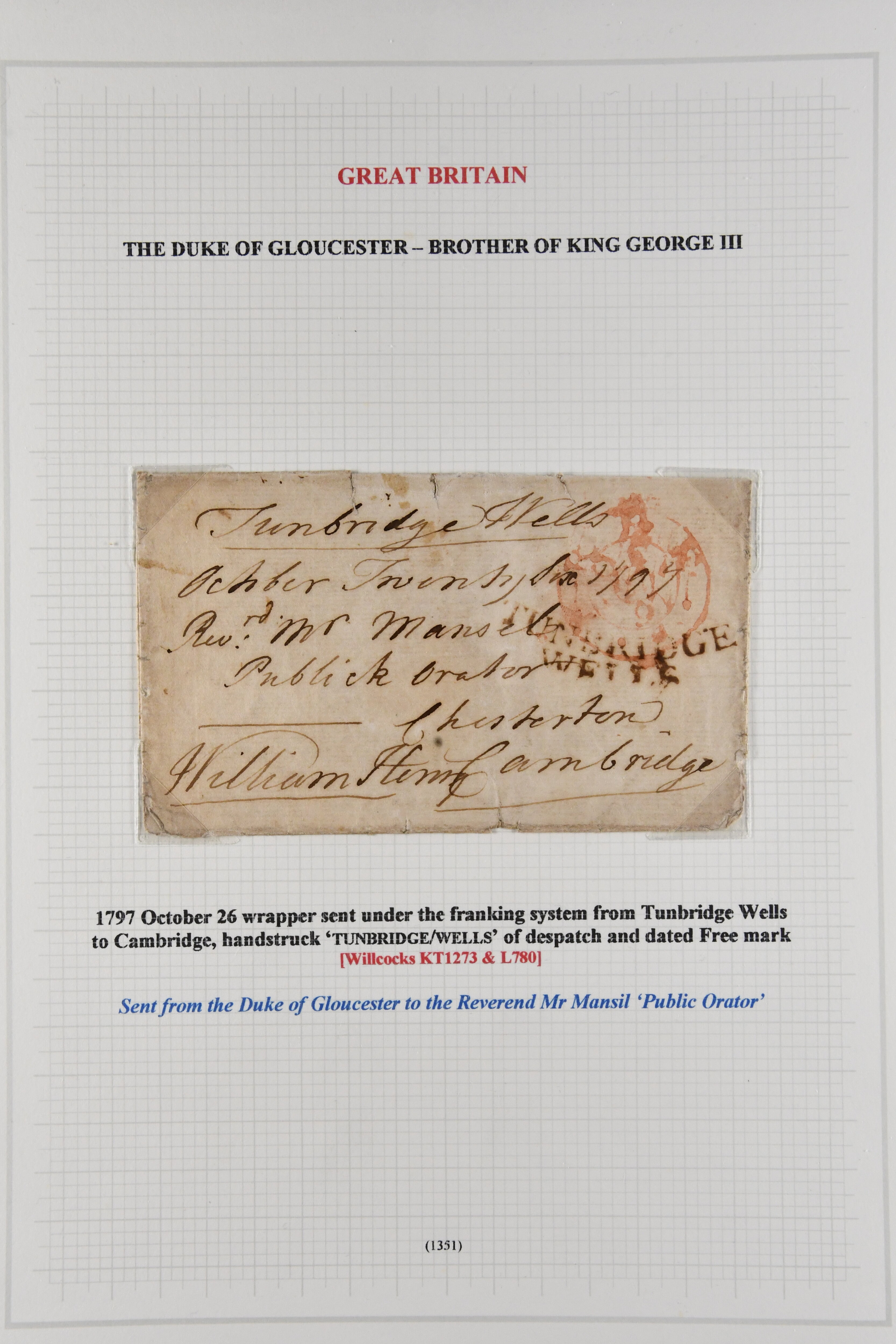 Royal Family Mail 1797/1941c.: Collection on leaves with entire letters/covers/documents/ephemera (18 items) incl. 1797 cover under the Free Frank system sent from the Duke of Gloucester (brother of George III) to