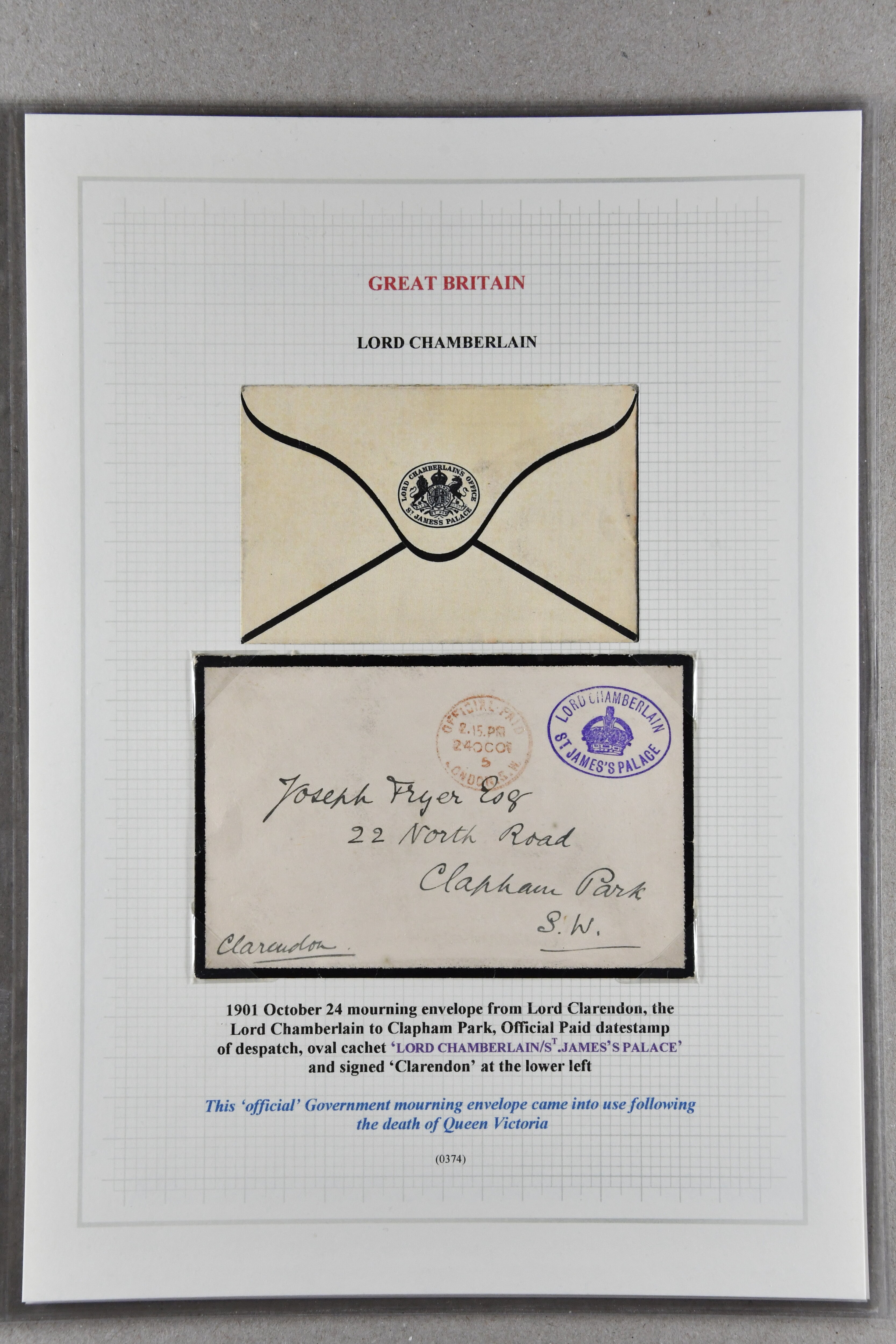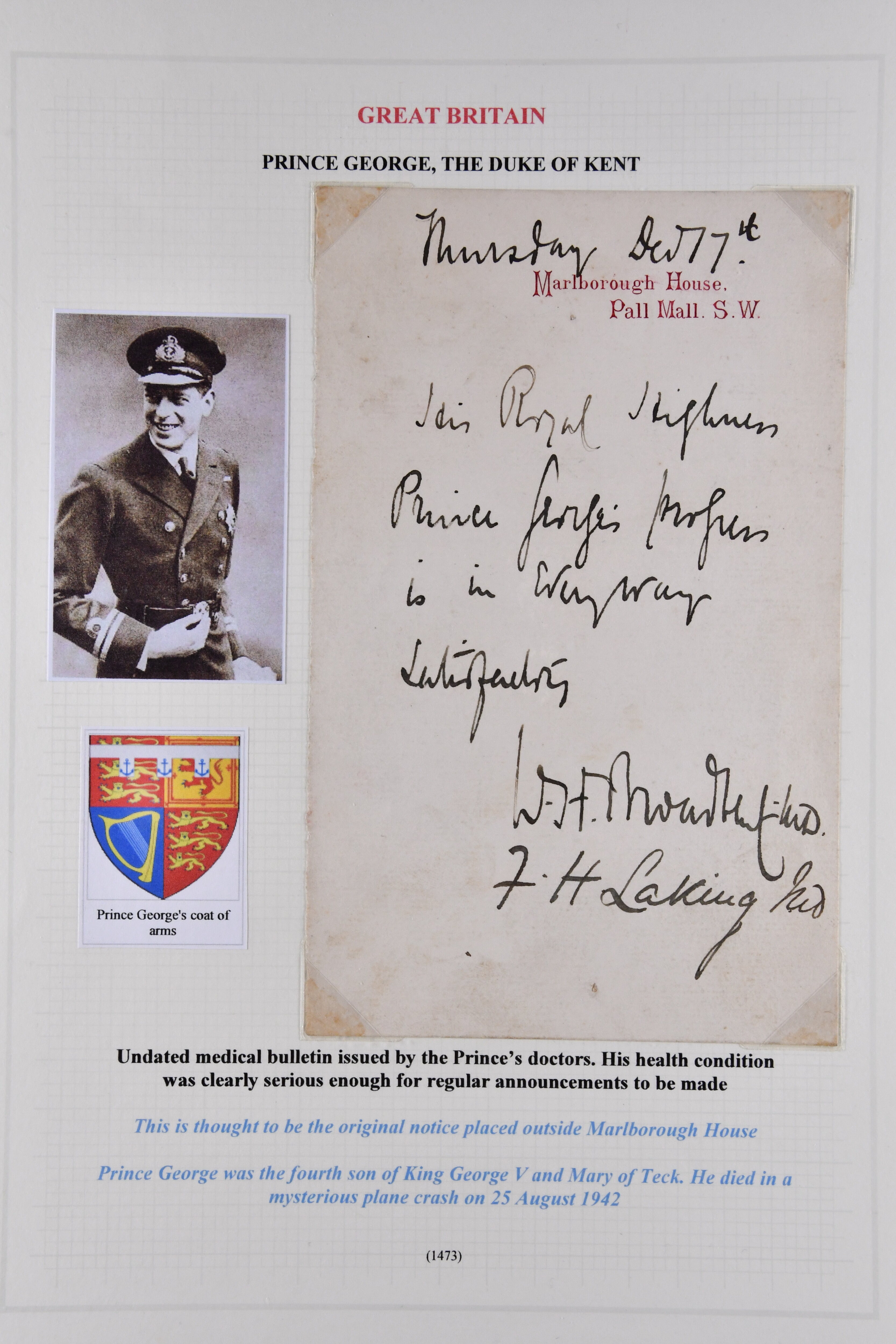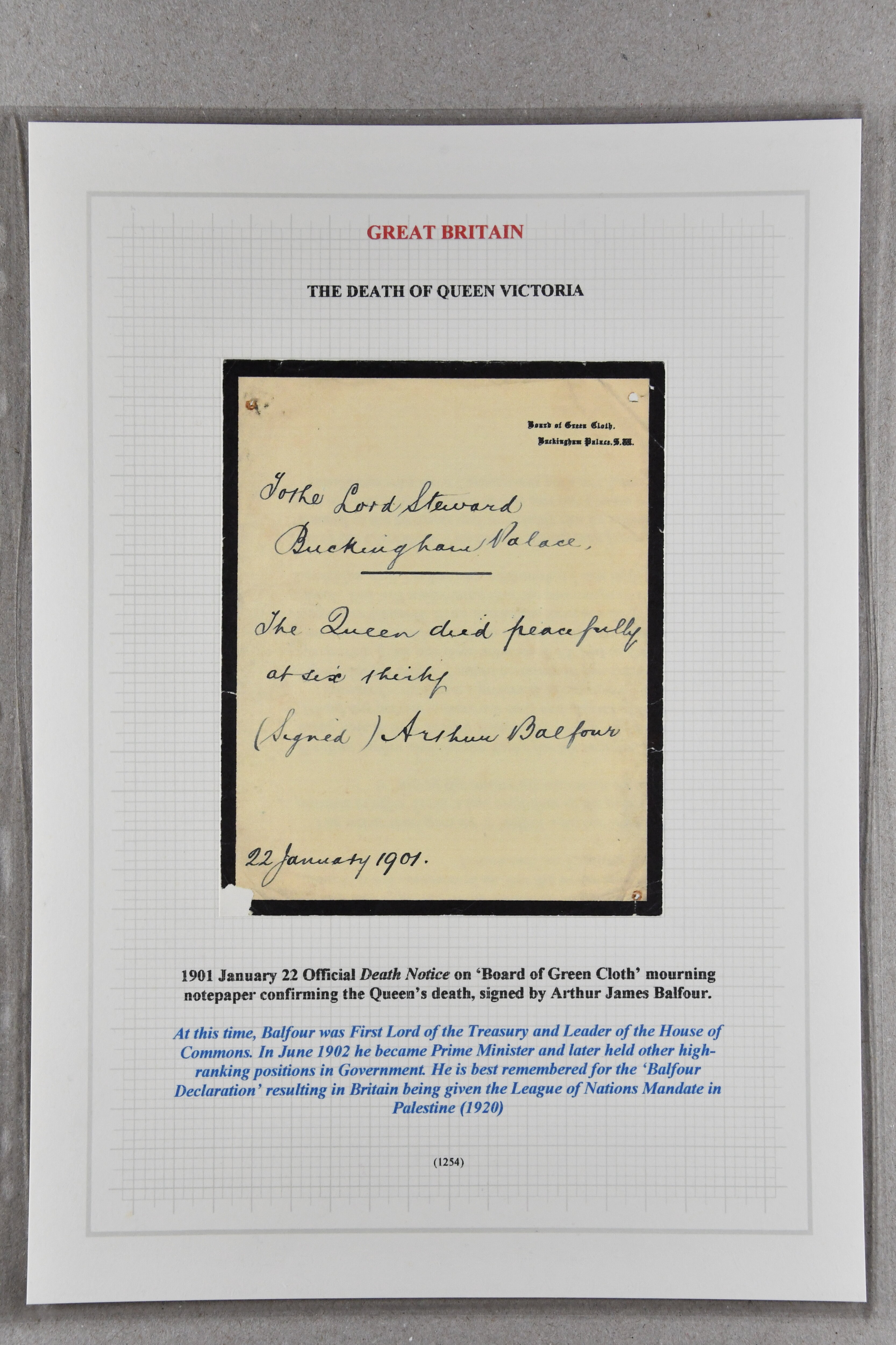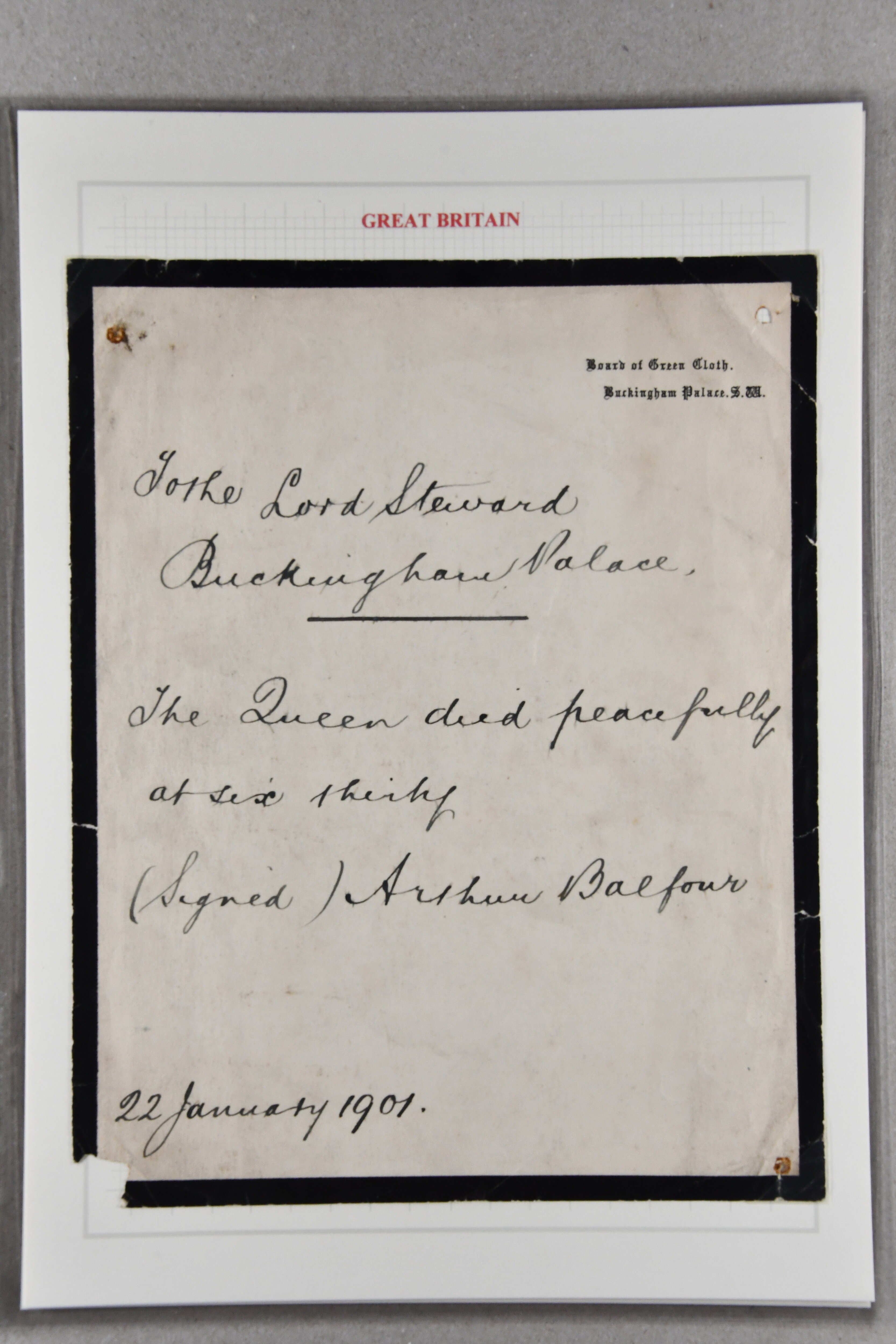 January 1901 stating "The Queen died peacefully at six thirty" signed by Arthur Balfour on "Board of Green Cloth, Buckingham Palace" notepaper and Notice (circa 1941) placed outside Marlborough House stating "His Royal Highness Prince George's