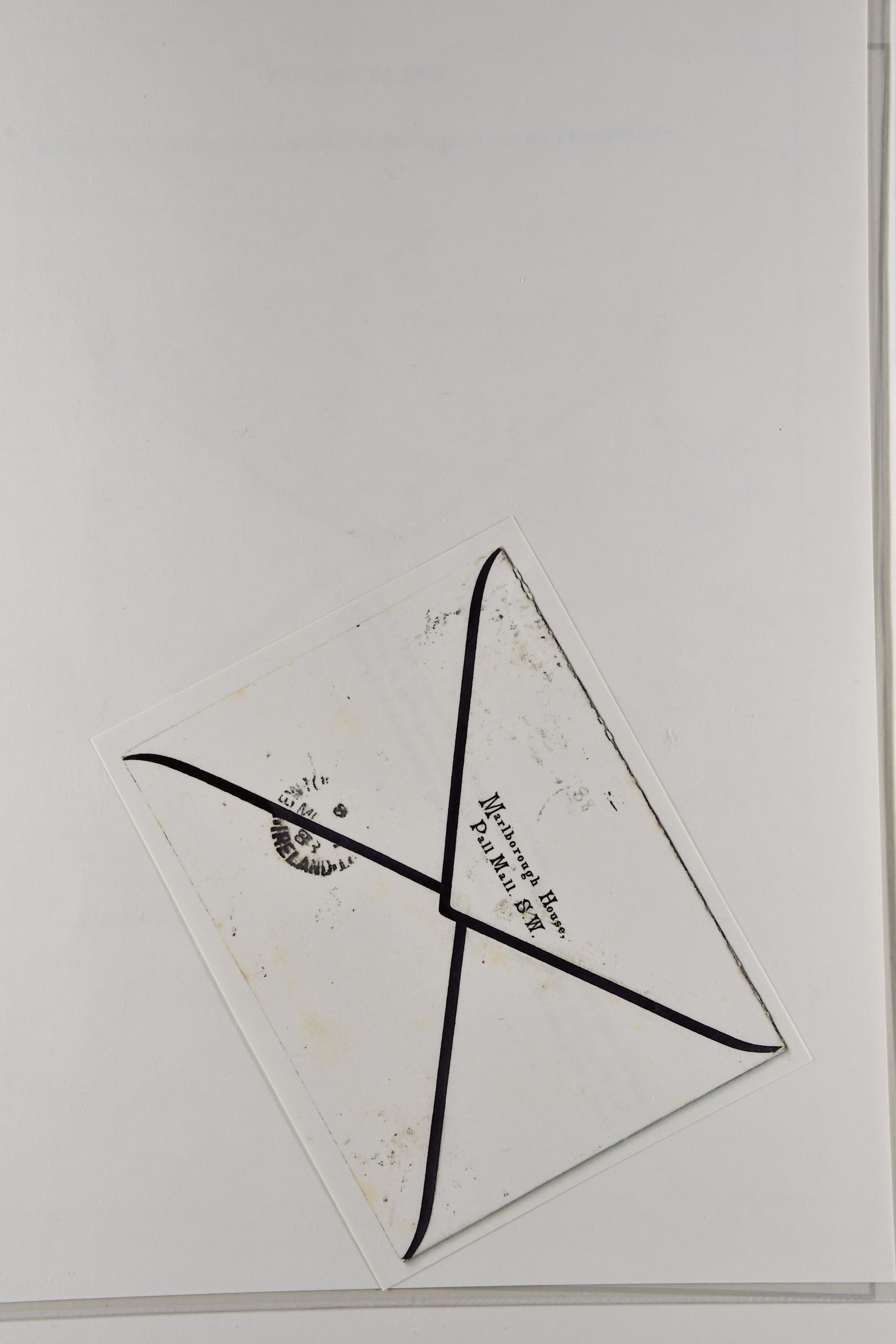 "285" obliterator with Cowes cds (Dec 8), London transit and Esher arrival cds of the same day. Sold together with a piece addressed to "Her Royal Highness The Duchess of Gloucester" signed "Albert" at base. A rare pair. Note: The Duke de Nemours,