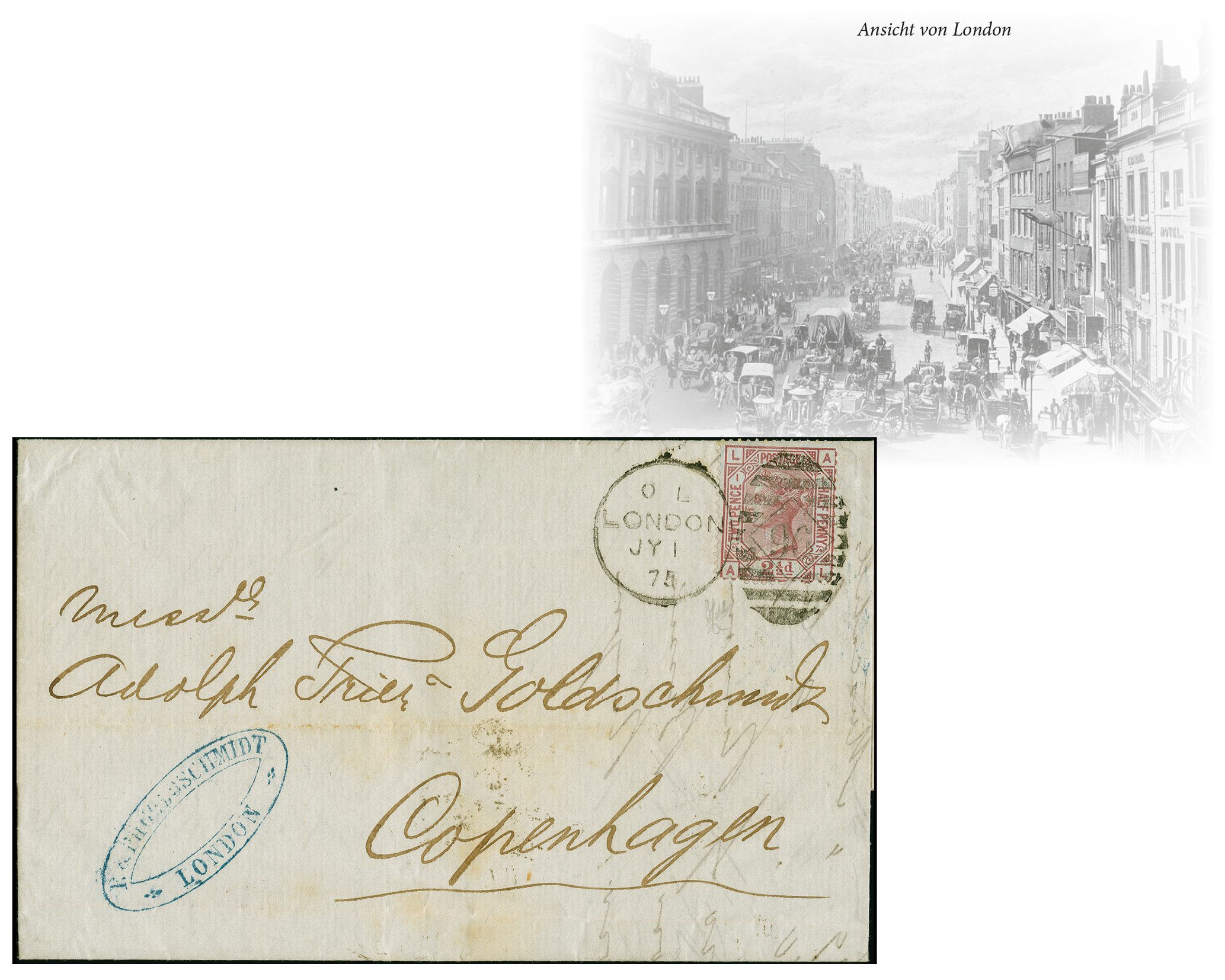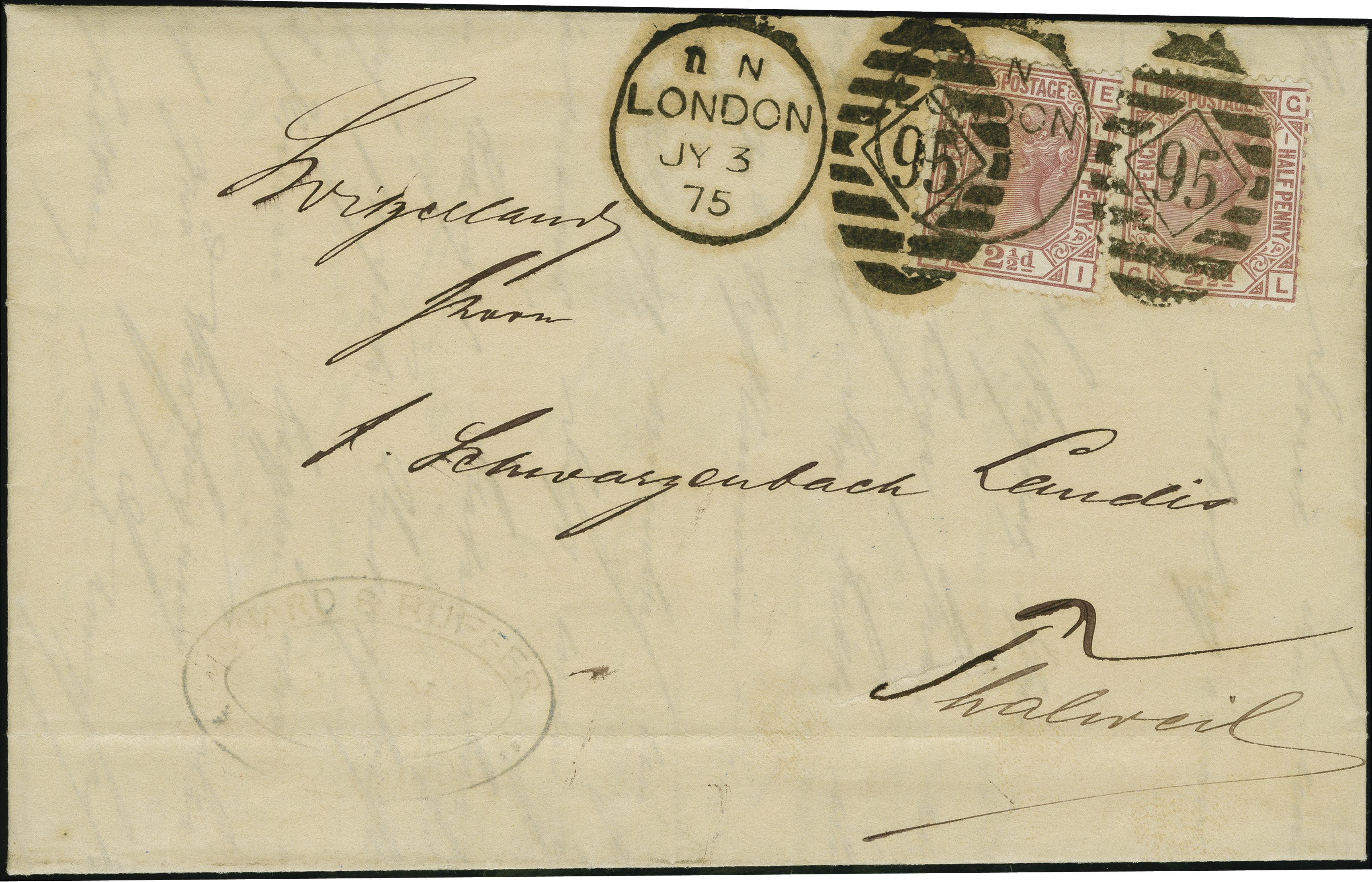 90036 cover image1875: Surface-Printed 2½ pence rosy mauve, plate 1, two singles, lettered EI and GL, white paper, Anchor wmk., perf 14, vibrant colour and perforations mostly fine, tied by a barred duplex “95 LONDON JY 3 75” to an entire sent to Thalweil, Switzerland. Reverse, transit “ZURICH 5 VII 75” in black and arrival “THALWEIL 5 VII 75” in blue. Stamp EI has some short perforations at top. A scarce 30-days-rate, sent on the third day of issue and of the GPU (Image 1) (Image 2)