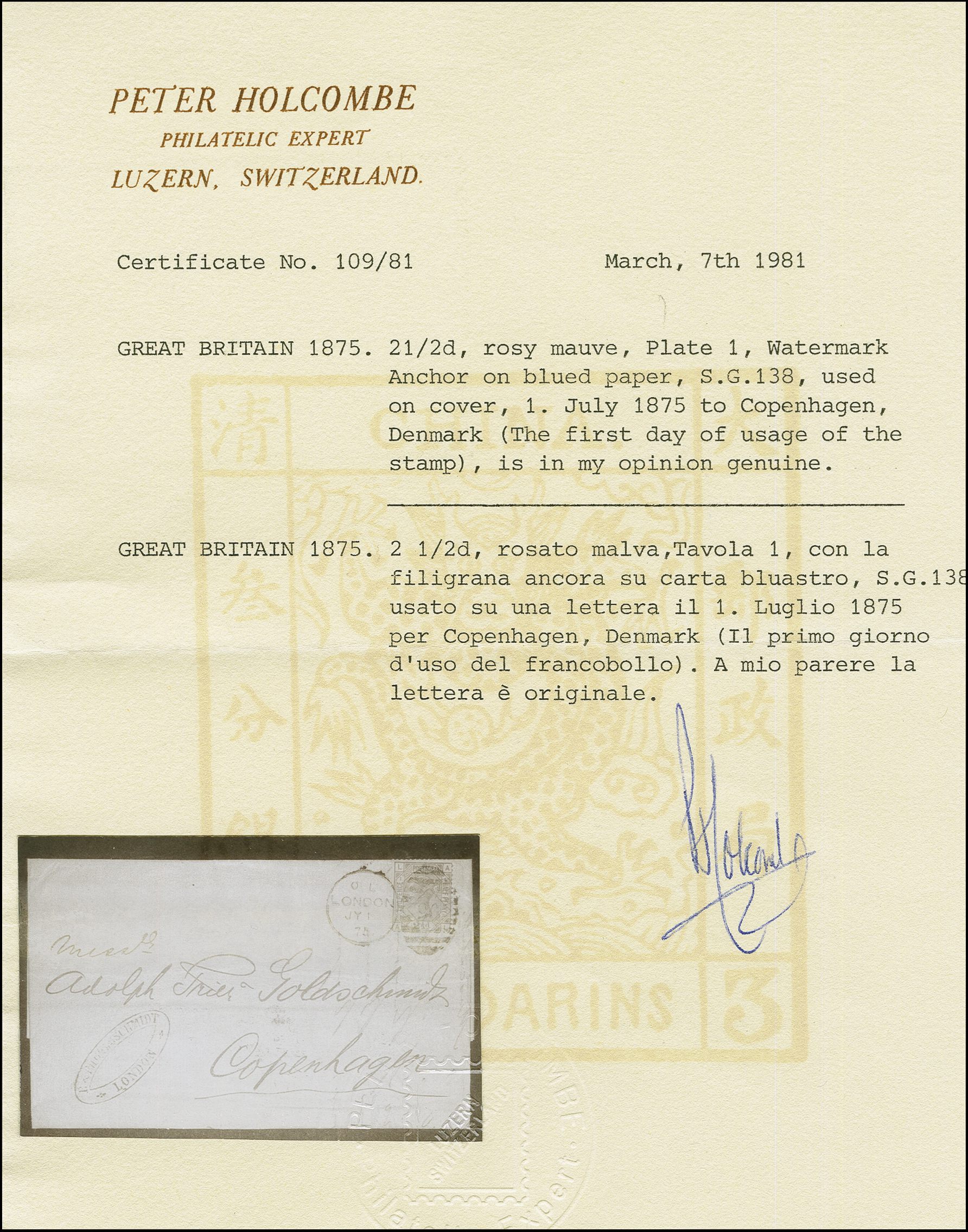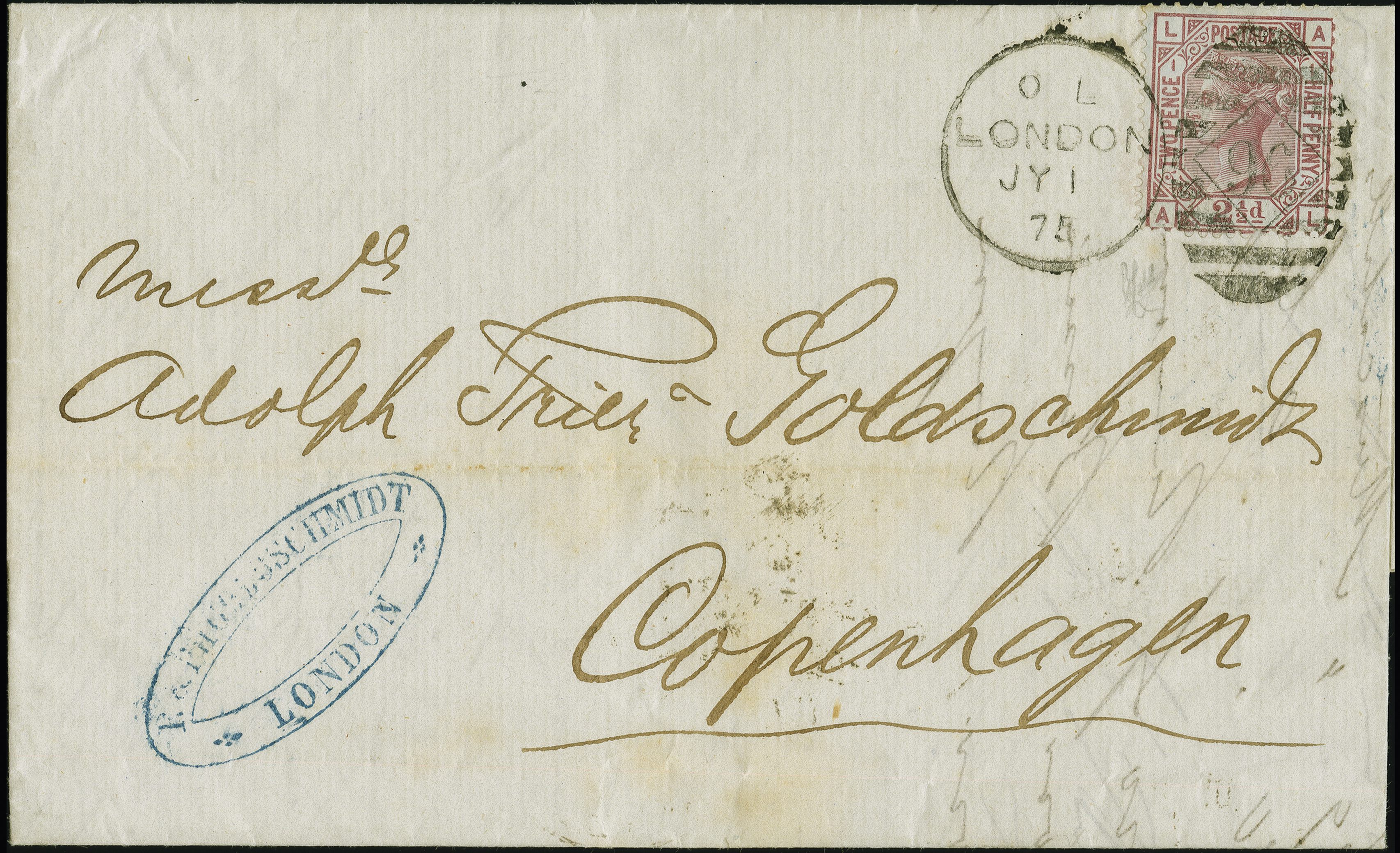 90033 cover image1875: Surface-Printed 2½ pence rosy mauve, plate 1, lettered AL, blued paper, Anchor wmk., perf. 14, fresh colour, perforations mainly good, tied by barred duplex First Day cancel “96 LONDON JY 1 75” sent to Copenhagen, Denmark, with commercial cachet in blue alongside and an arrival to reverse “KOBENHAVN 3 7 75” in black. Minor imperfections along top perforations. A rare example of a first day of Issue and of first day of the GPU; one of three currently recorded. Cert. Holcombe (1981).Note: There are no first day usages reported for any other member's GPU Base Rate stamp issued on the First Day of the GPU (Image 1) (Image 2) (Image 3) (Image 4)