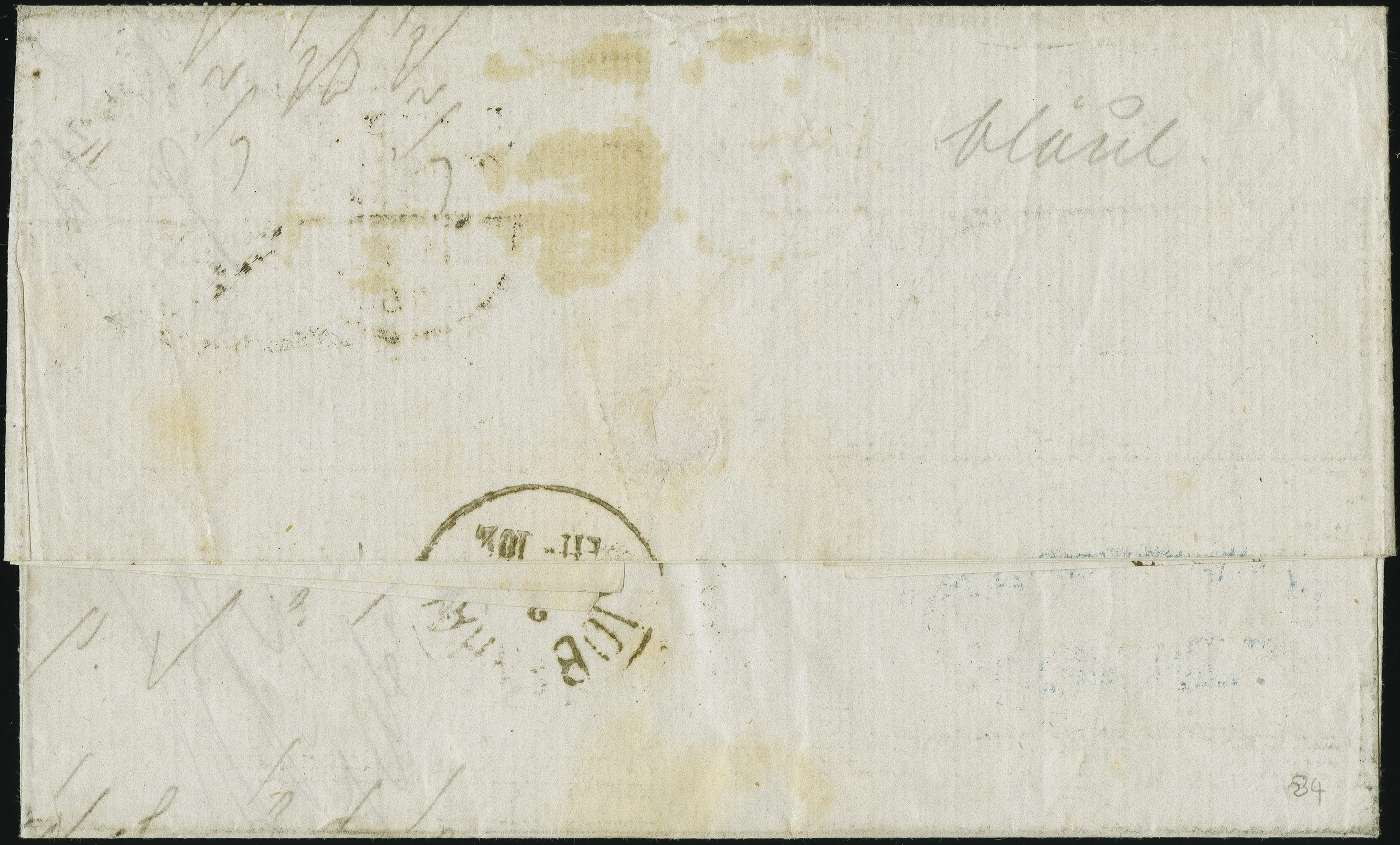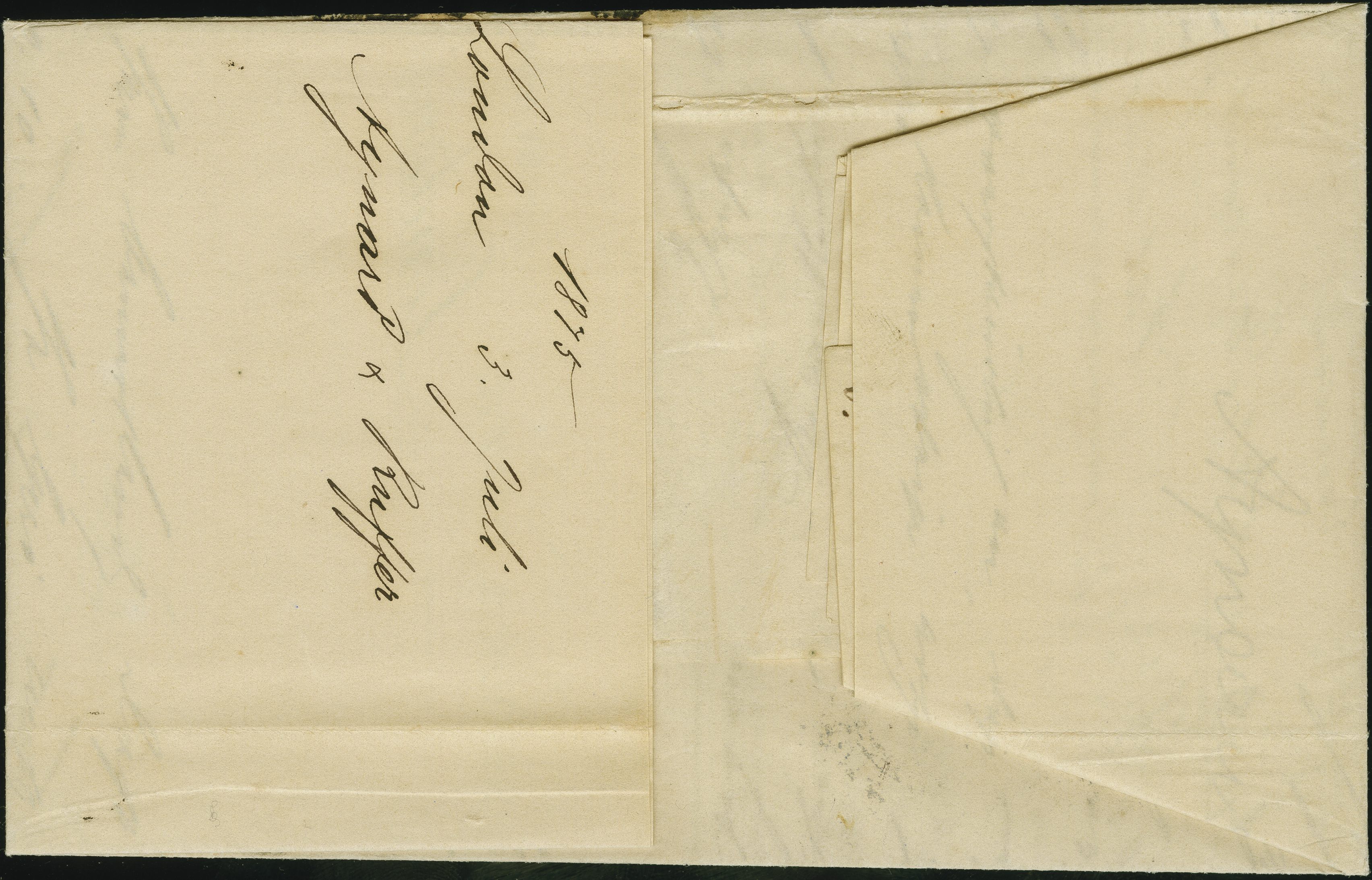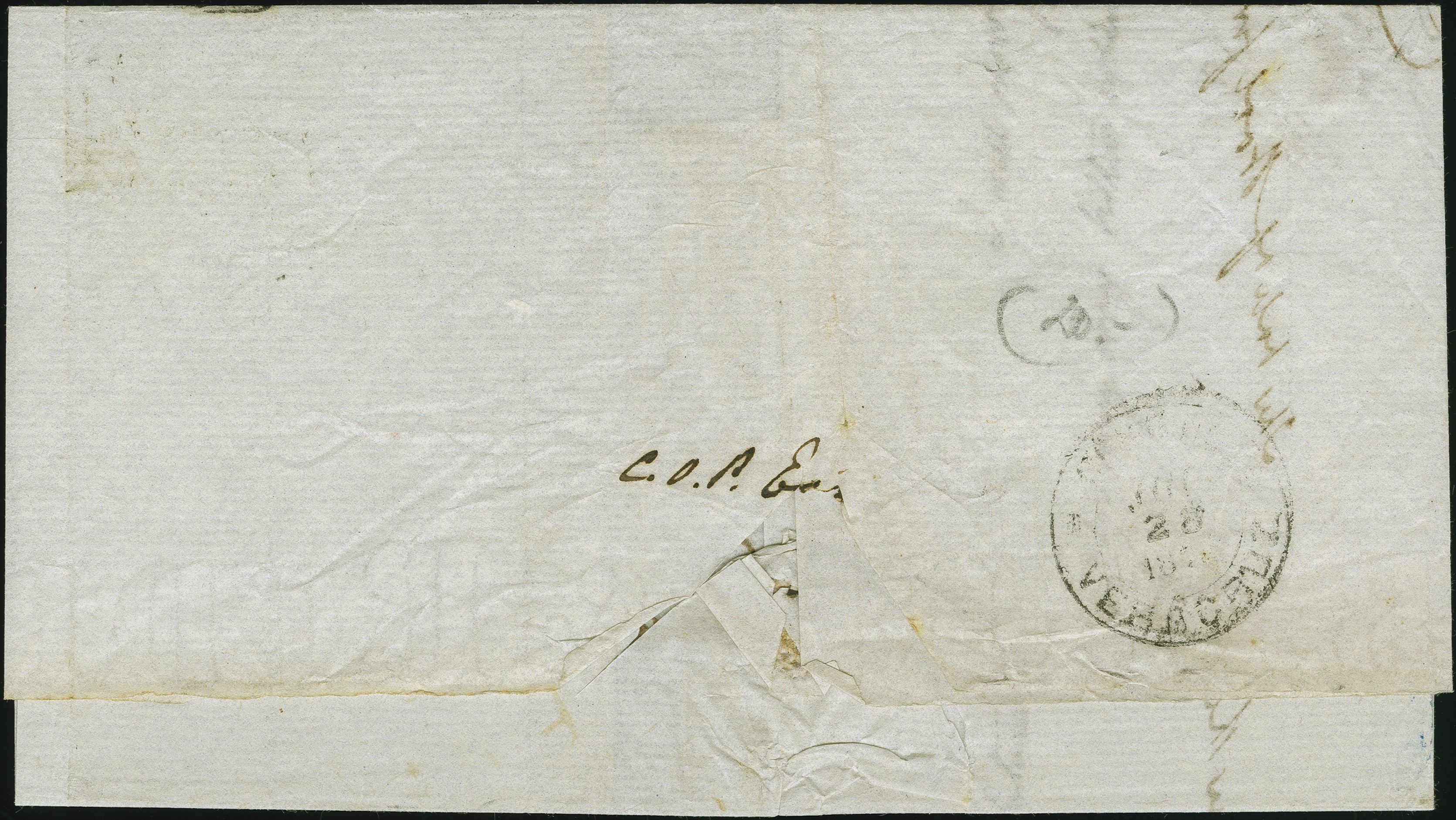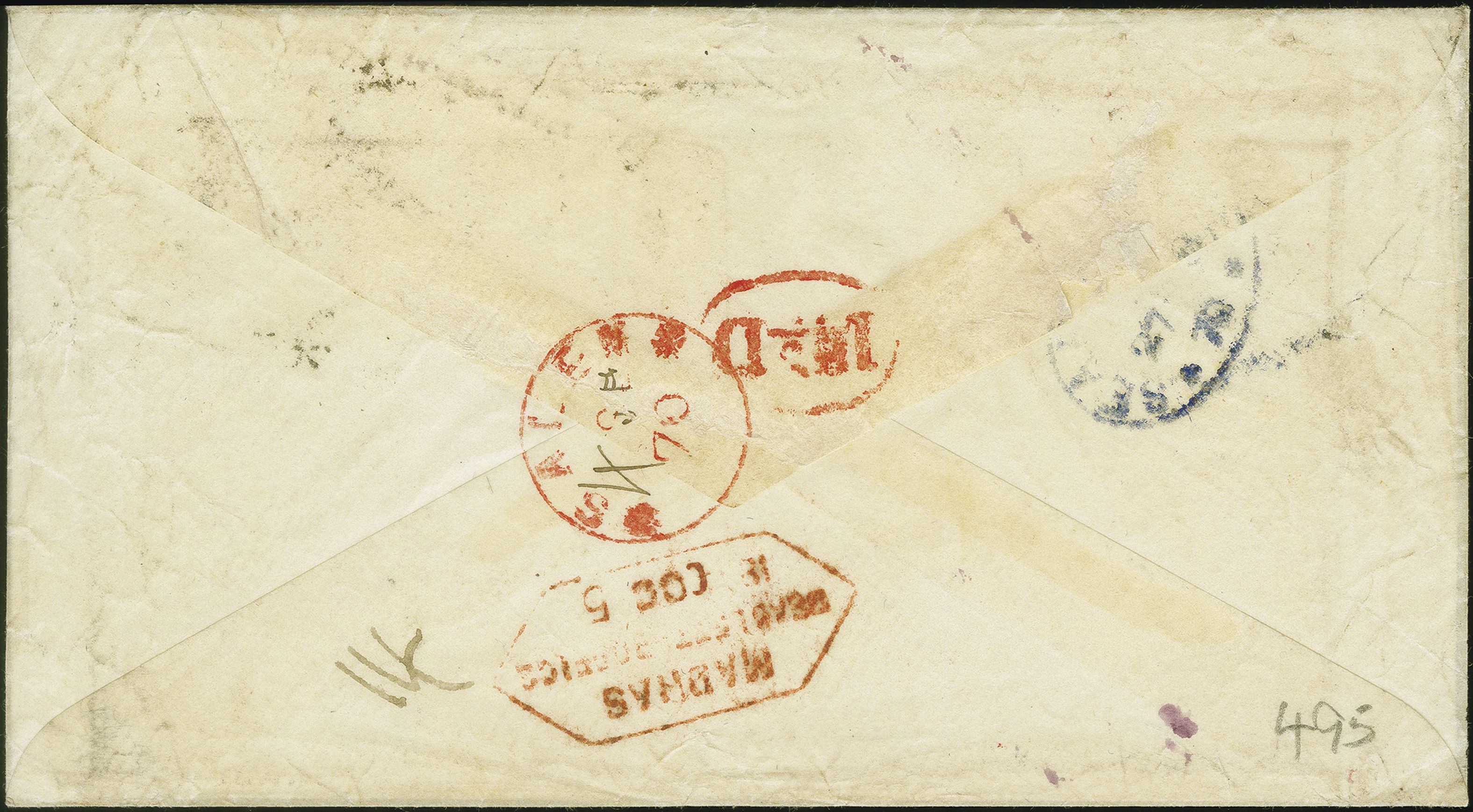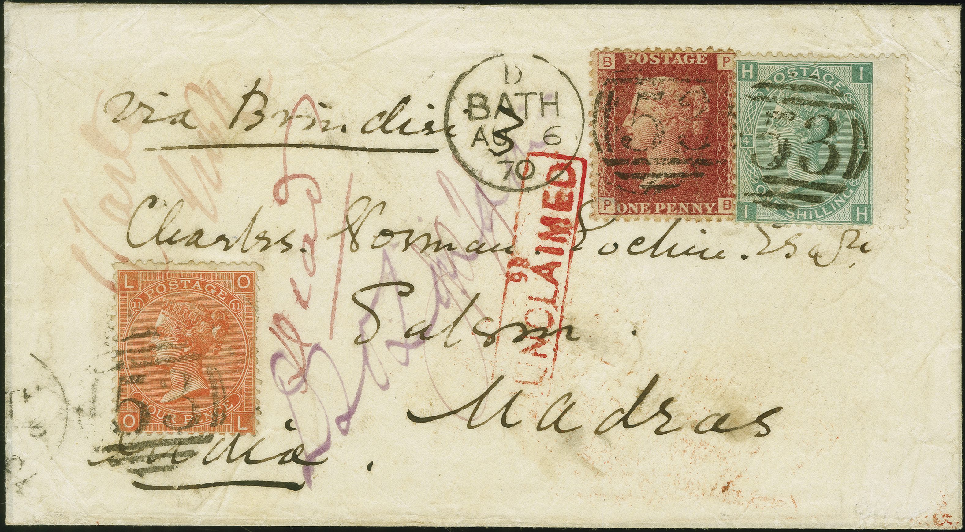 90031 cover image1864: Line-Engraved 1 penny red, plate 117, in combination with Surface-Printed 1865, 4 pence vermilion, plate 11 and 1867, 1 shilling green, plate 4, all of fresh colour, perforations mostly fine, tied by a duplex “53 BATH 6 AU 70” to an envelope sent to Salem, Madras, India, endorsed “via Brindisi”, with rectangular “UNCLAIMED” in red alongside a manuscript "Dead” in red ink. Reverse, indistinct sea post oval, red arrival cds “SALEM” (date blurred) and a “MADRAS DEAD LETTER OFFICE” mark. Fine tri-colour combination, sent via a faster routing at a higher rate which was a short-lived, and a not well known option. As a result, there were low volumes of mail sent at these high charges. Few known. Note: The faster routing was over Mont Cenis (Alps), using the Fell Railway Express. The accelerated conveyance of mail via Brindisi, which was faster than the direct ship route from Southampton or Falmouth (9d rate), was planned as a temporary measure, starting 2 October 1869 and projected to end October 1871, upon completion of the tunnel under Mount Cenis. The service terminated after 11 months due to the Franco-Prussian War (Image 1) (Image 2)