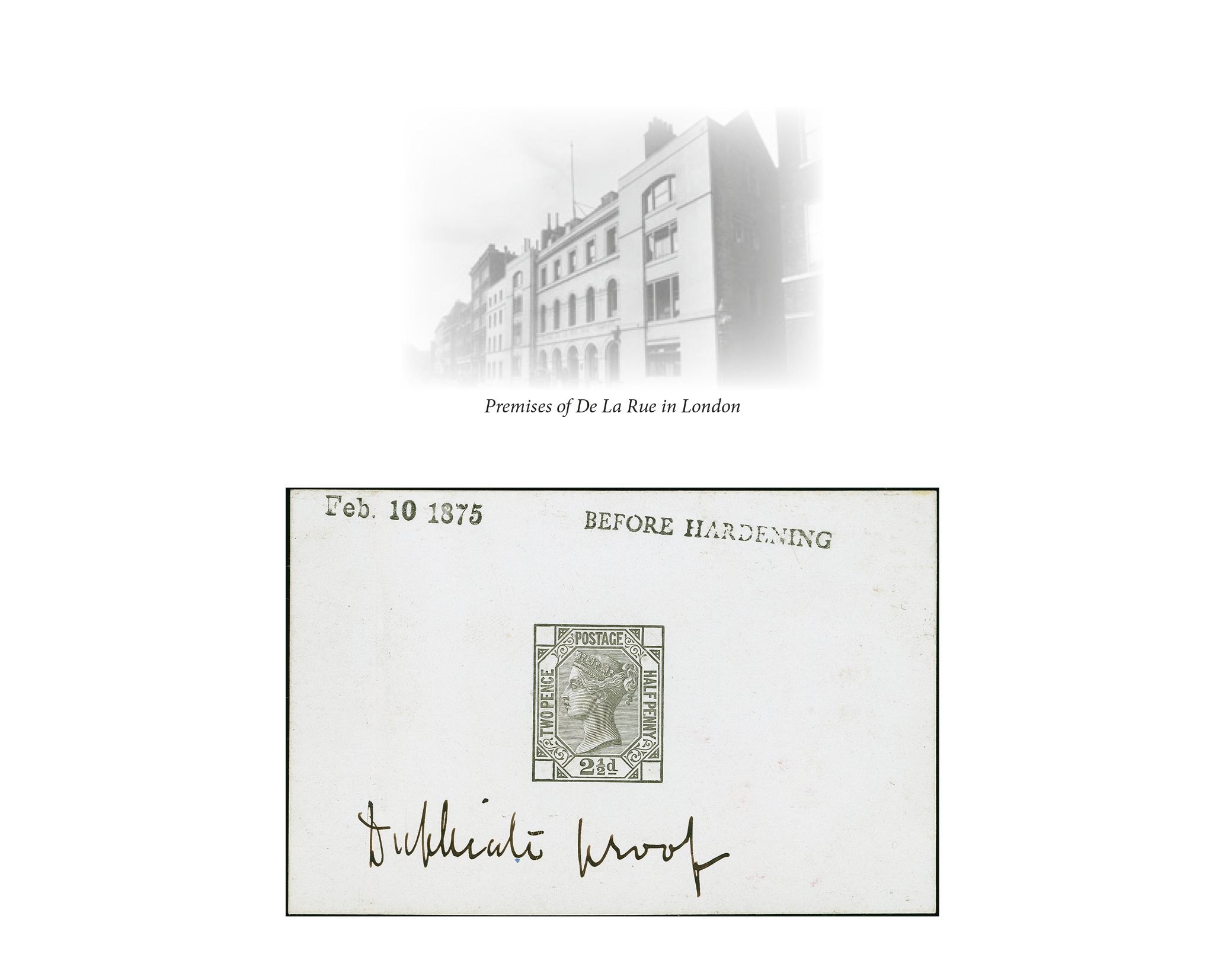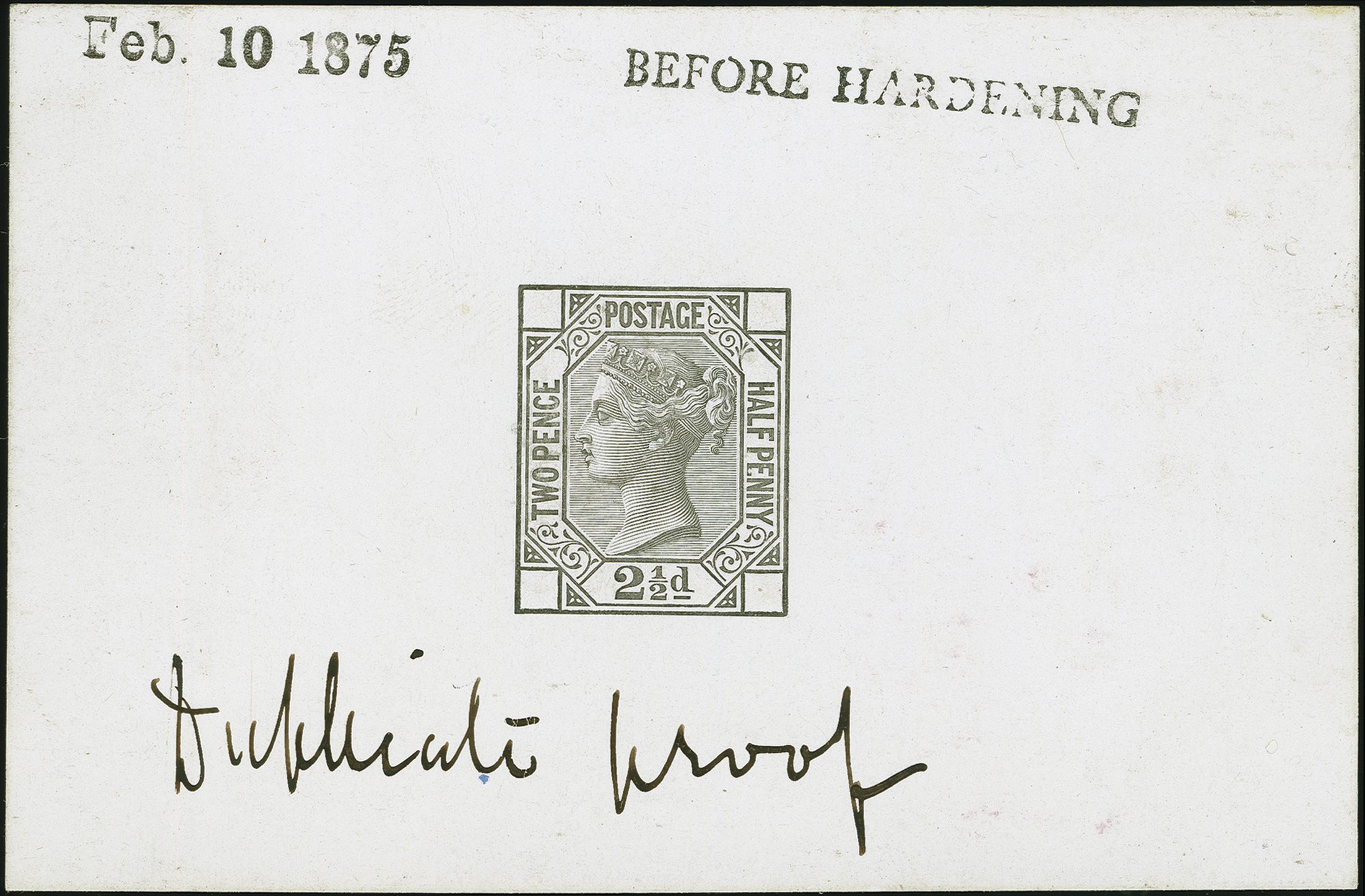 90035 (*) image1875: Surface-Printed 2½ pence, Master Die Proof, printed in black on glazed card (92 x 60 mm.), with plate number and position blank, endorsed ‘BEFORE HARDENING’, dated ‘Feb. 10 1875’ and with printer's note ‘Duplicate Proof’ in black ink. Minor vertical kink left side. Fine and impressive. Provenance: ‘CHARTWELL’ Collection, Spink, 4 June 2012, lot 7 (Image 1) (Image 2) (Image 3)