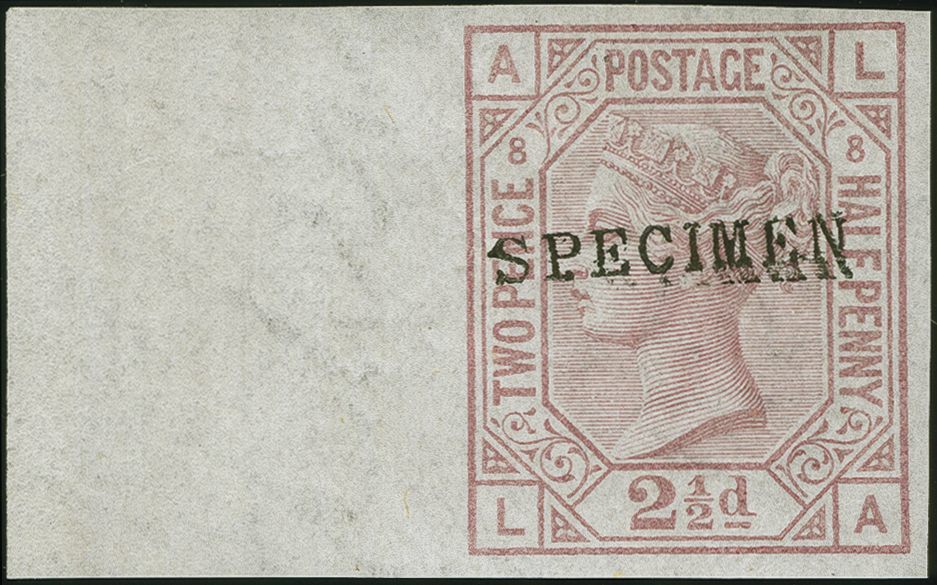 90038 (*) image1877: Surface-Printed 2½ pence rosy mauve, plate 8, lettered LA, Orb wmk., imperforate, fresh colour, left marginal single with good margins all around, unused, overprinted SPECIMEN (Type 9) in black. Scarce and fine.Remark: All imperforate 2½d. from plate 8 overprinted SPECIMEN originate from an unique sheet AA/PL of which the upper two rows AA/BL are in the N.P.M. London, vol. XXXIII, page 36.Provenance: (as part of a block of four, KA/LB) Beresford Collection, Sotheby's, 24 Nov. 1987, lot 458; Wade Collection, Phillips, 20 March 1997, lot 227 (Image 1) (Image 2)