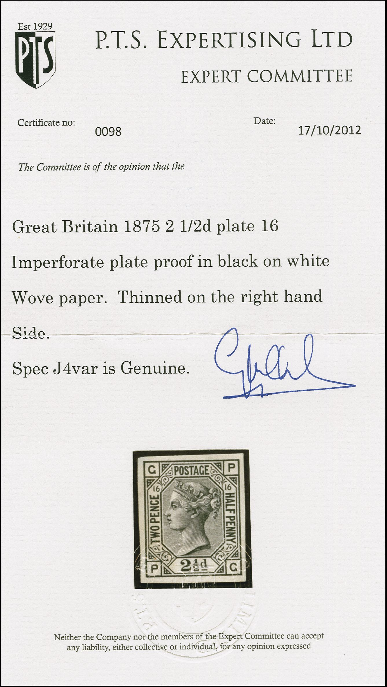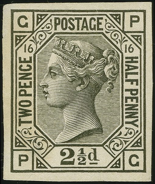 90037 (*) image1877: Surface-Printed 2½ pence, plate 16, lettered PG, imperforate Plate Proof, printed in black on wove paper, strong colour, four margins all around. Thin to reverse on right side, of fine appearance. Rare example from the Inland Revenue's reference archives. Very few in private hands. Cert. PTS (2012). Remark: A very rare plate proof in black, only three singles from plate 16 lettered PG, PH and OI (Royal Collection!) are recorded in the Karl Louis Card Index.Provenance: Dr. Douglas Latto Collection, Phillips, October 1992, lot 379 (Image 1) (Image 2) (Image 3)