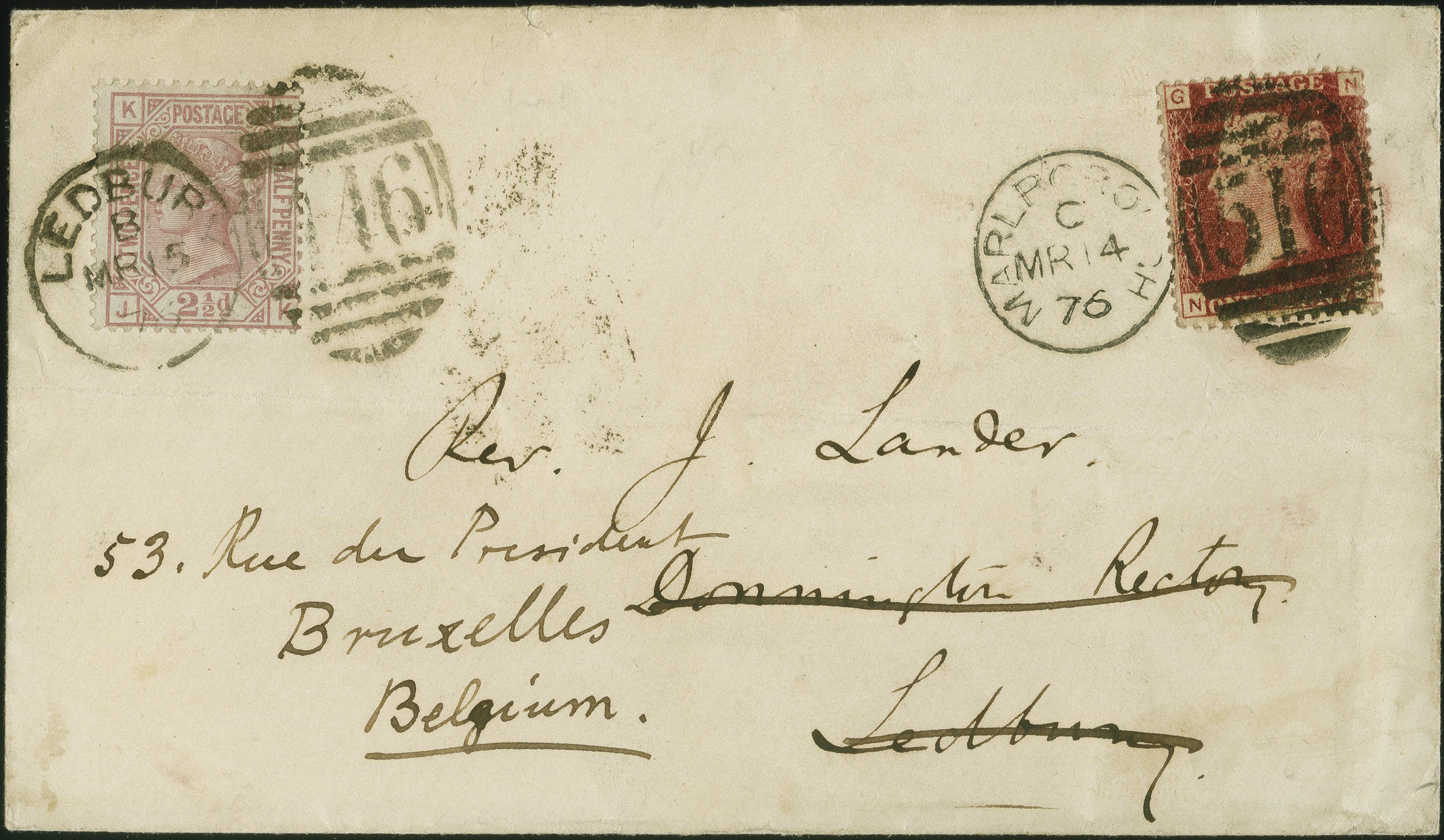 90032 cover image1874: Line-Engraved 1 penny red, plate 176, lettered NG, large Crown wmk., perf 14, in combination with Surface-Printed 1875 2½ pence rose mauve, plate 2, lettered JK, Anchor wmk., perf.14 , both stamps of fresh colour and good perforations, the former tied by barred duplex “516 MARLBOROUGH MR 14 76”, the latter tied by barred duplex “446 LEDBURY MR 15 76” to an envelope sent to Ledbury, England and redirected to Brussels, Belgium. Reverse, arrival cds “LEDBURY MR 15 76” together with French transit “ANGLETERRE OUEST 16 MARS 76” and arrival cds “BRUXELLES EST 16 MAR 1876”. Horizontal filing fold well clear of adhesives. Minor soiling and creasing. A scarce example of a properly prepaid domestic letter forwarded abroad. Fresh and fine, scarce usage. Note: GPU rules required that credit be given for the original one penny paid and that only an additional one and a half penny should be added to the cover for forwarding abroad to Belgium. However, the full GPU letter rate of two and a half pence was added (Image 1) (Image 2)