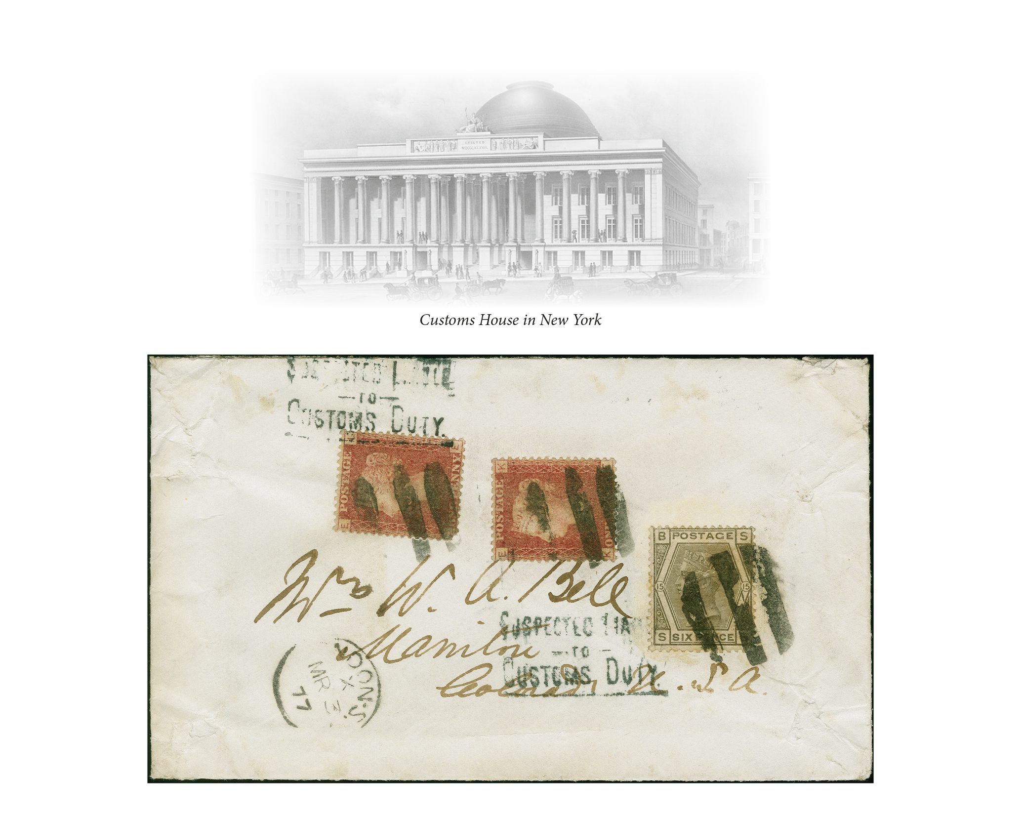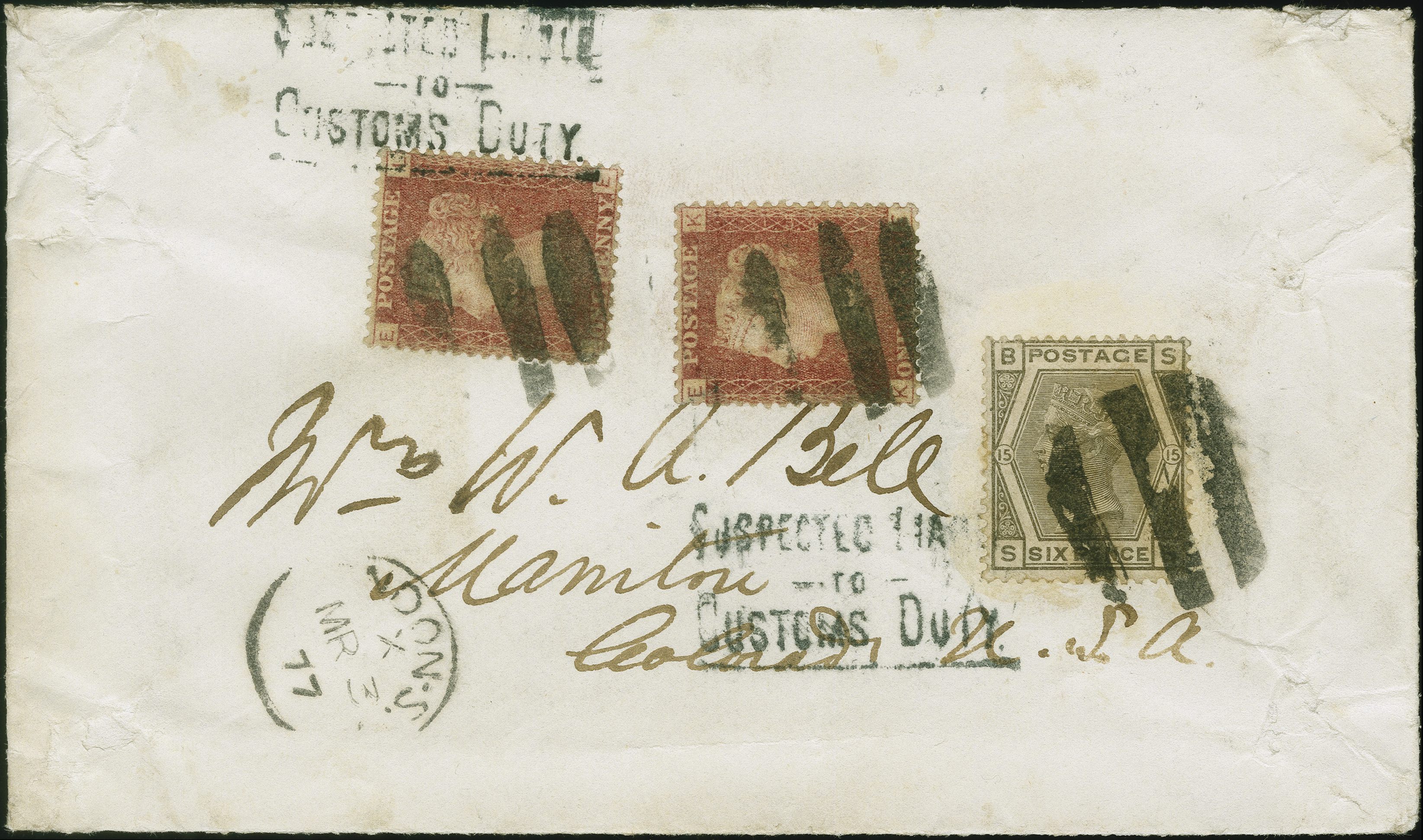90026 cover image1869: Line-Engraved 1 penny red, plate 134, two singles, used in combination with Surface-Printed 1874, 6 pence grey, plate 15, good colour and perforations mostly fine, tied by dumb cancel to envelope, originally pasted up to Book-Parcel from London to the United States, with cds “LONDON 3 MR 77” and two strikes of an instructional handstamp “SUSPECTED LIABLE / TO / CUSTOMS DUTY” in black. Corner fault to first 1d red and some creasing. A very interesting item with the only recorded strike of the American instructional marking.Note: The UK had long subsidized “book post” mail. However, the USA did not treat such as “printed matter” and imposed customs duties on “books”. The USA's, so called, “Tax on Knowledge” was a subject of several diplomatic exchanges and noted within British PO notices to the public from 1876 through to the 1890's. Berne'74 had not anticipated a customs duty problem (Image 1) (Image 2) (Image 3)