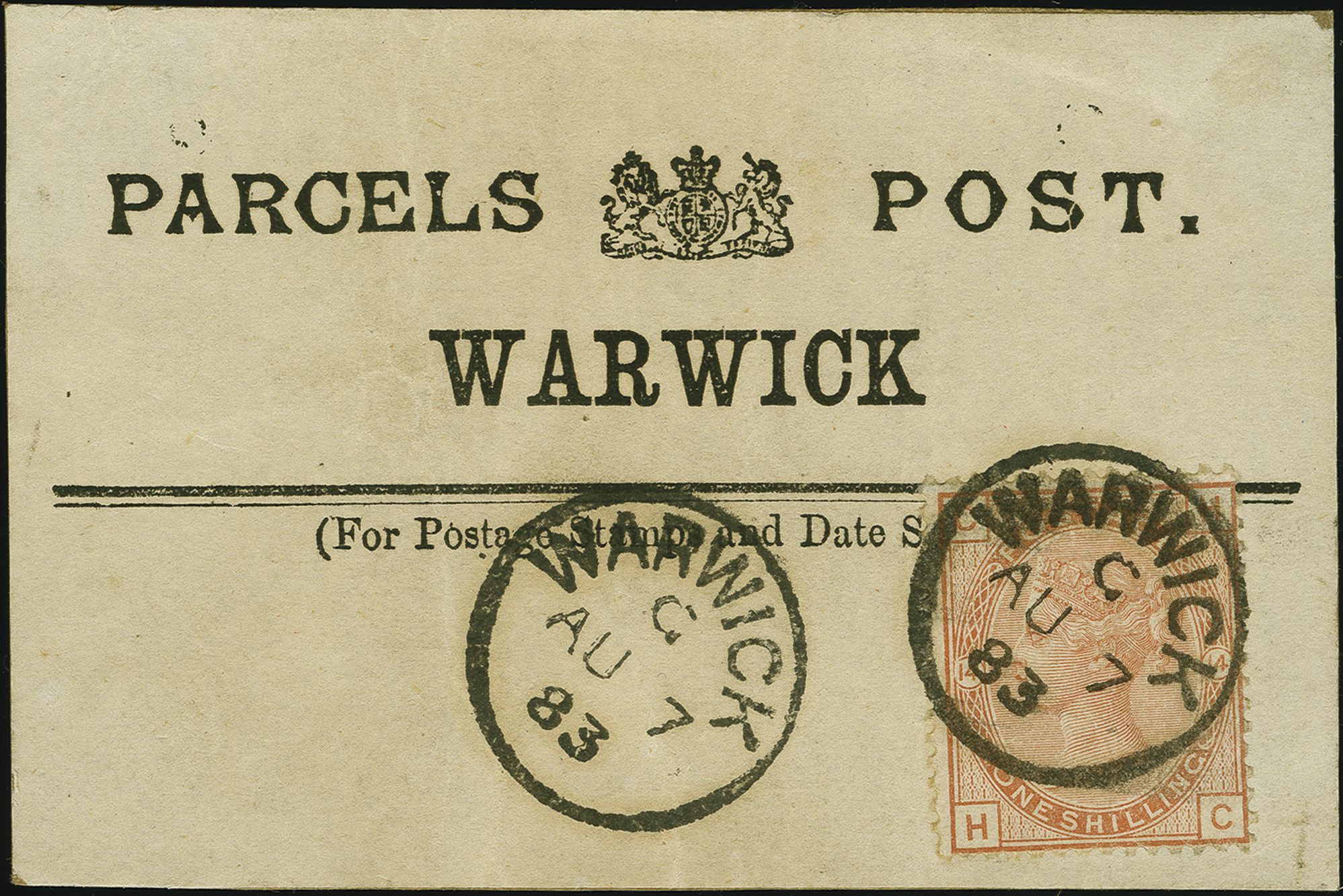 90045 piece imageParcel Post 1881: Surface-Printed 1 shilling orange-brown, plate 14, lettered HC, Crown wmk., perf. 14, of fresh colour and good perforations, tied by a clear cds “WARWICK 7 AU 83” to a “PARCELS POST WARWICK” label, with additional strike alongside. Label has been slightly reduced as is often the case and is still affixed to parcel wrapper. Rare “PARCELS” (instead of the more common “PARCEL”) Post label used within the first week of the parcel post in the UK. Second-earliest recorded example. Note: 1 shilling was the highest rate possible on domestic parcels weighing 5-7 lbs (Image 1) (Image 2)