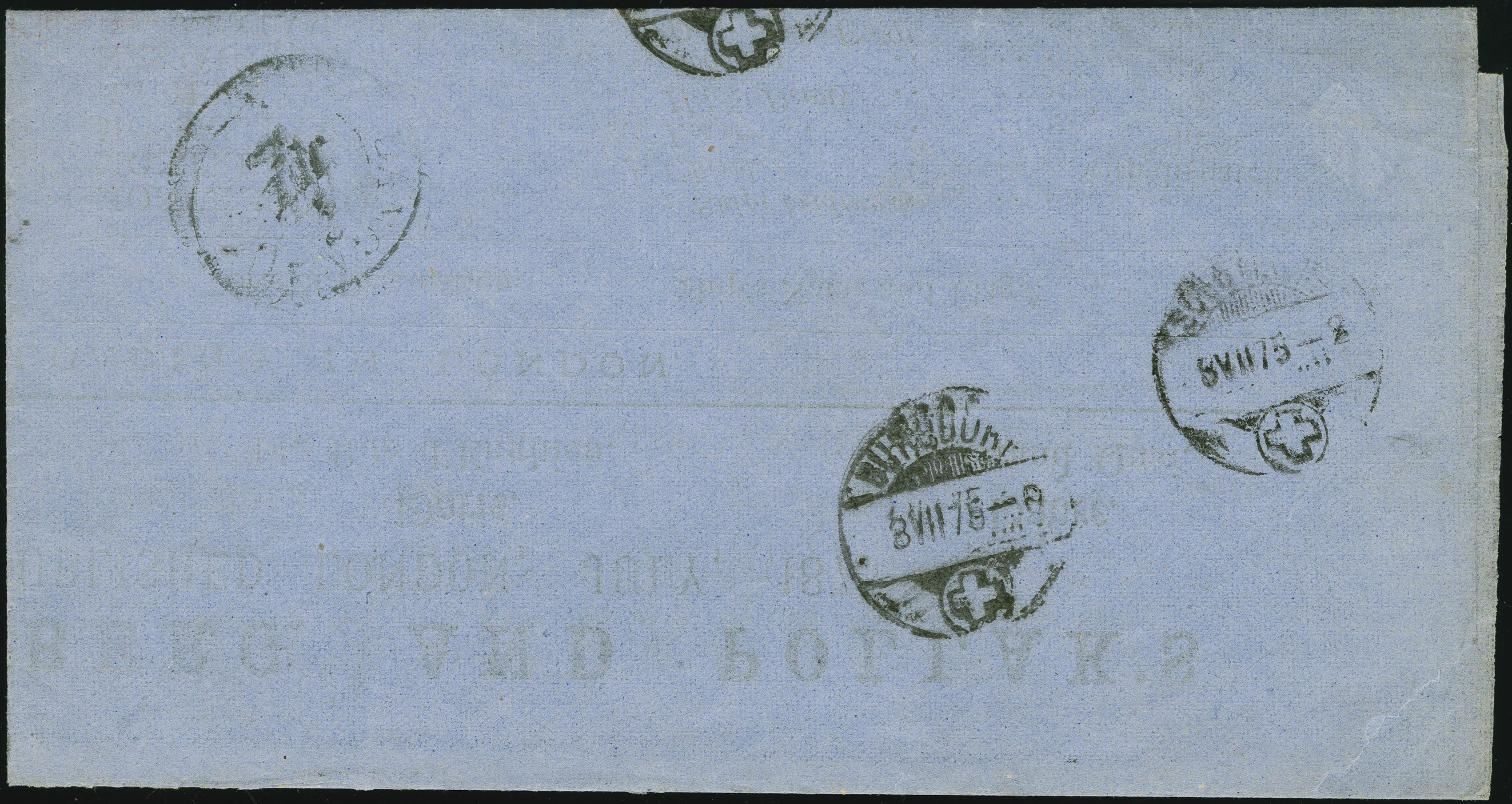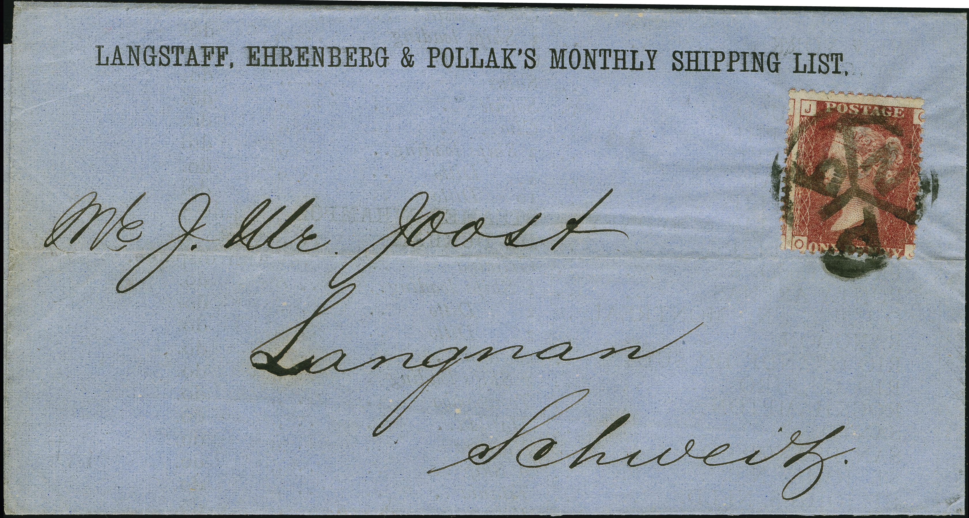 90030 cover image1864: Line-Engraved 1 penny red, plate 150, good colour and perforations mostly fine, tied by undated newspaper branch “NPB” handstamp to printed shipping circular sent to Langnau, Switzerland. Reverse, two transit marks “BURGDORF 3 VII 75”, “SOLOTHURN 3 VII 75” and arrival “LANGNAU 3 VII 75”. Filing fold well clear of adhesive. A good example, sent in the open mails (transit marks to back), via railway 1 July 1875; the first day of the GPU (Image 1) (Image 2)
