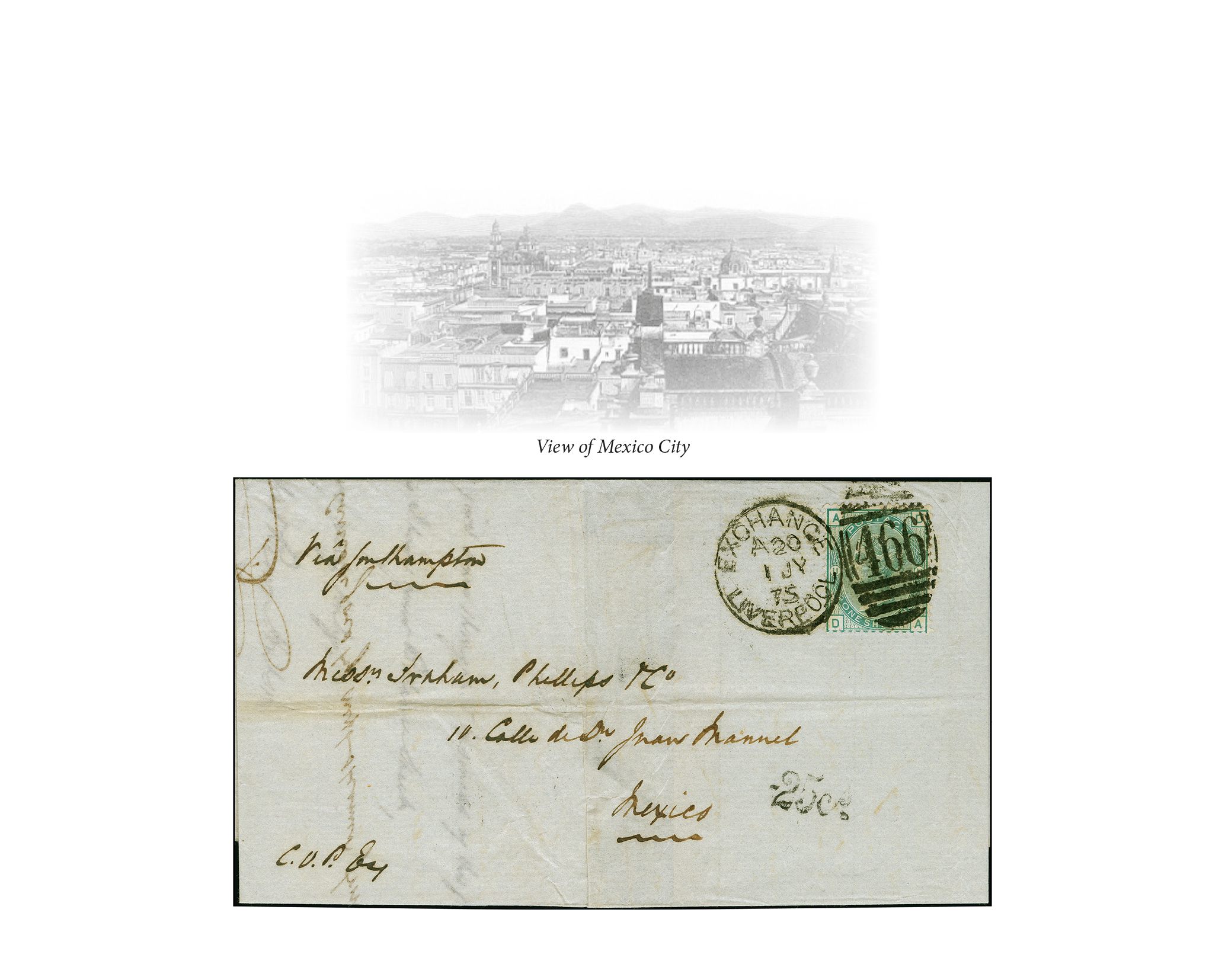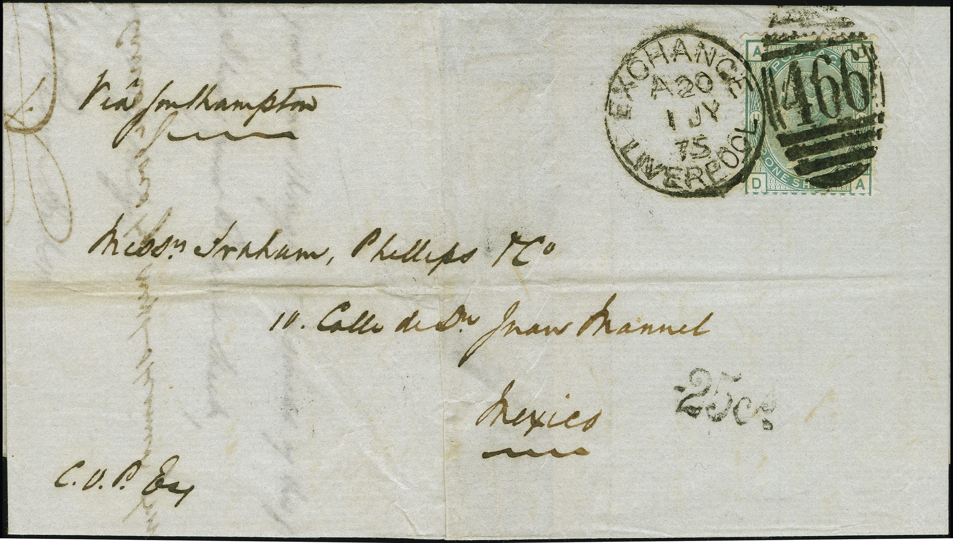 90039 cover image1873: Surface-Printed 1 shilling green, plate 11, Spray wmk., perf. 14, fresh colour and good perforations, tied by duplex “466 EXCHANGE LIVERPOOL 1 JY 1875” to a lettersheet sent to Mexico City, Mexico, endorsed “via Southampton”, with Mexican postage due mark “-25c.” in black alongside. Reverse, faint and blurred Vera Cruz cds dated 28 July 1875. Filing folds well clear of adhesive. A fine First Day of GPU usage to a non-member country. Rare; only recorded mail from UK to non-member on 1 July 1875. Note: The rate was very expensive and remained unchanged, and especially so with the internal postage change on arrival (Image 1) (Image 2) (Image 3)