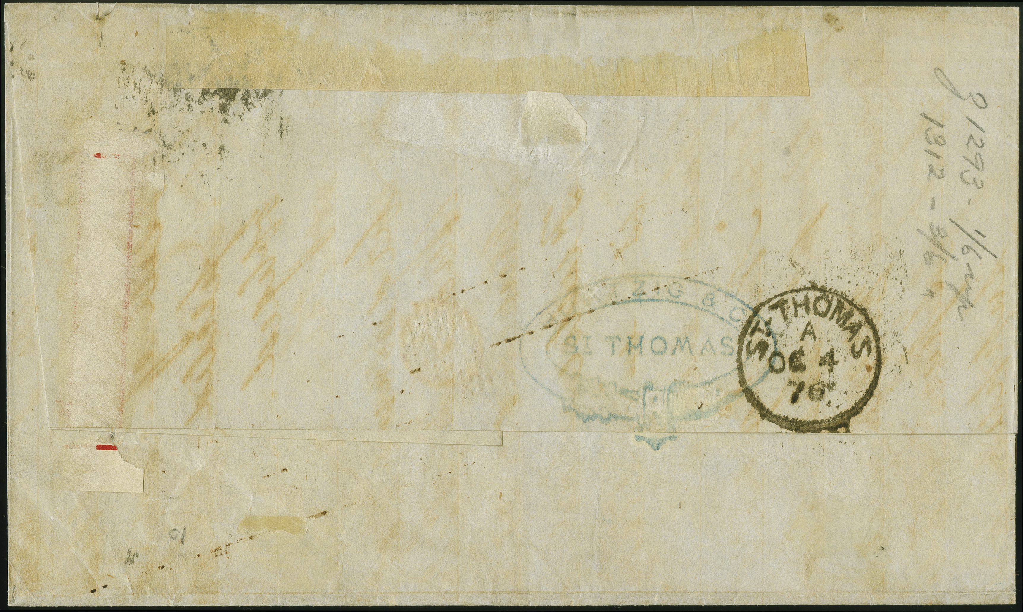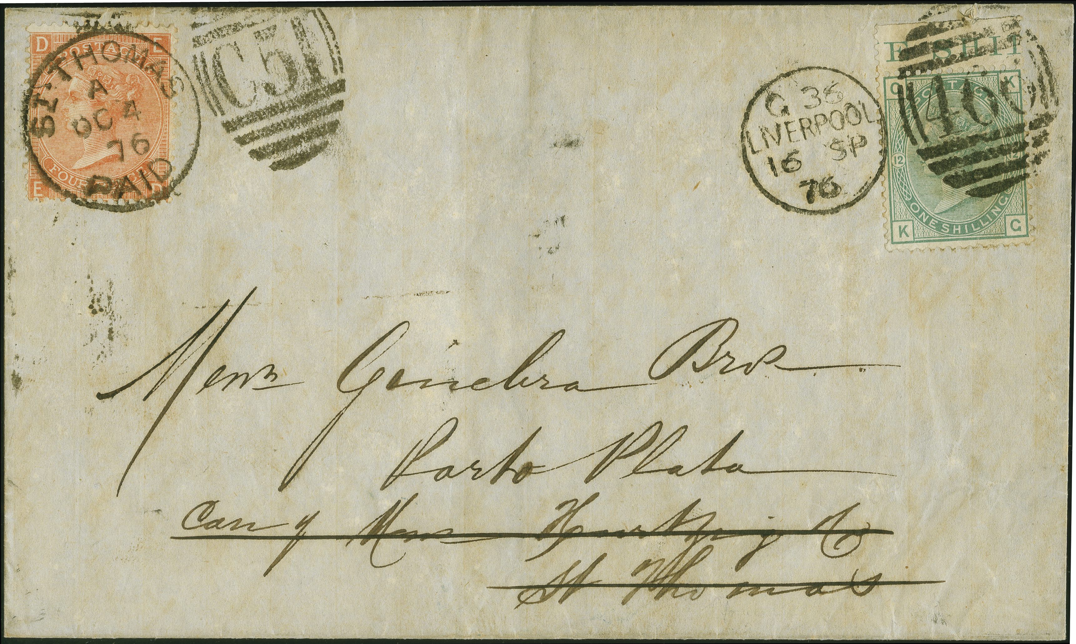 90041 cover image1873: Surface-Printed 1 shilling green, plate 12, lettered KG, Spray wmk., perf. 14, top marginal single, good colour and perforations, tied by duplex “466 LIVERPOOL 16 SP 76” to a lettersheet sent to St. Thomas, forwarded to Porto Plata (Dominican Republic) with additional 1865 4 pence vermilion, plate 14, lettered ED, Large Garter wmk., perf. 14, fresh colour and good perforations, tied by duplex “C51 ST. THOMAS OC 4 76". Reverse, arrival cds ”ST. THOMAS OC 4 76". Some climactic discolouration as is usual and small fault top right into margin of 1 shilling. Scarce combination. Remark: Only one similar franking on a forwarded cover from GB via D.W.I. to Porto Plata recorded in the Karl Louis Card Index.Note: The sender is apparently unaware that the British PO at Porto Plata had recently reopened; this cover being sent from the UK at the 1 shilling pre-GPU rate to St. Thomas for conveyance to Porto Plata. This forwarding was done at the intra-Caribbean British rate of 4 pence, because these British offices abroad were outside the GPU framework, thus forwarding required additional postage. #### ERROR #### Unterschiedliche Eintr ge in den beiden Sprachversionen der Provinienz (Image 1) (Image 2)