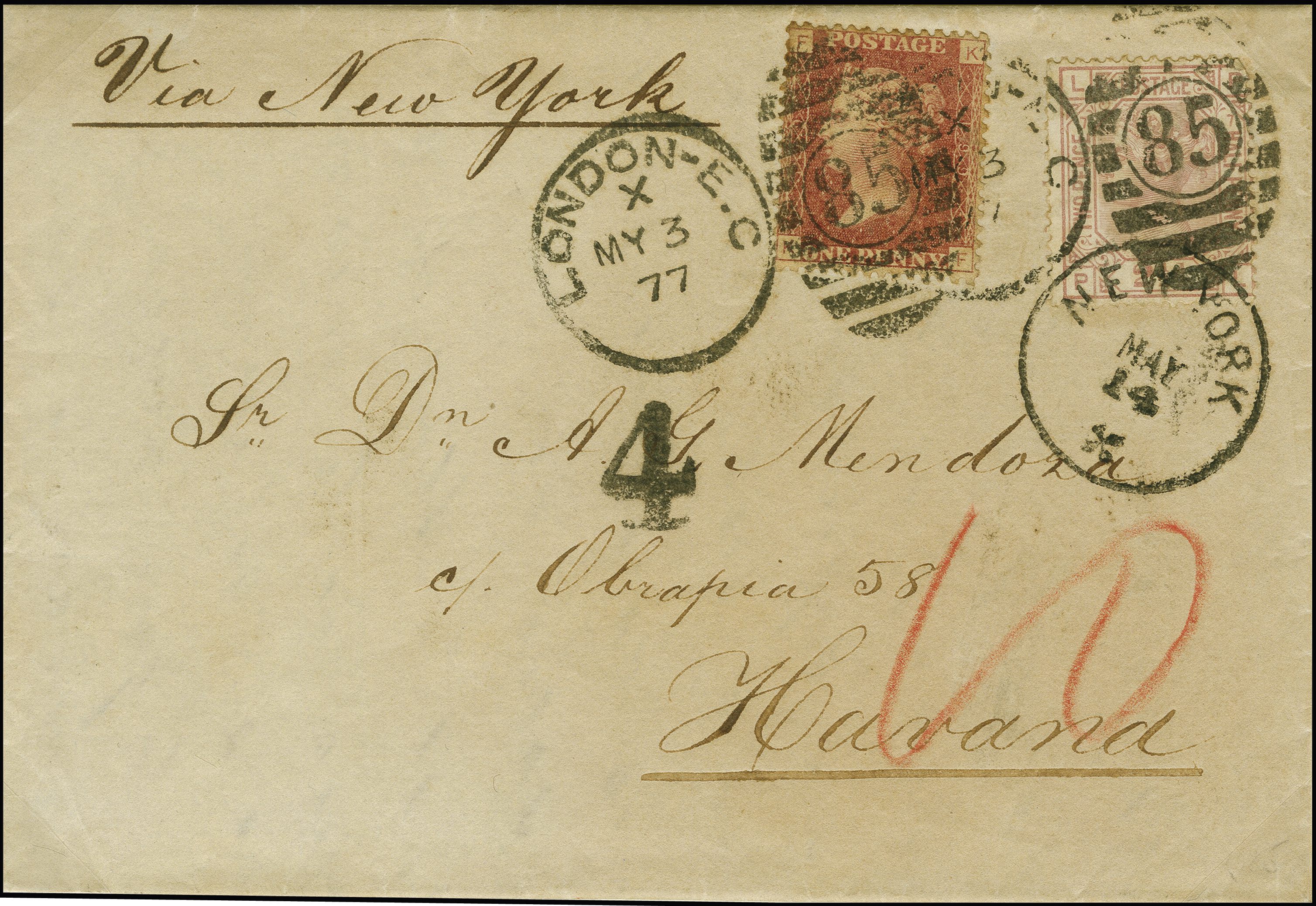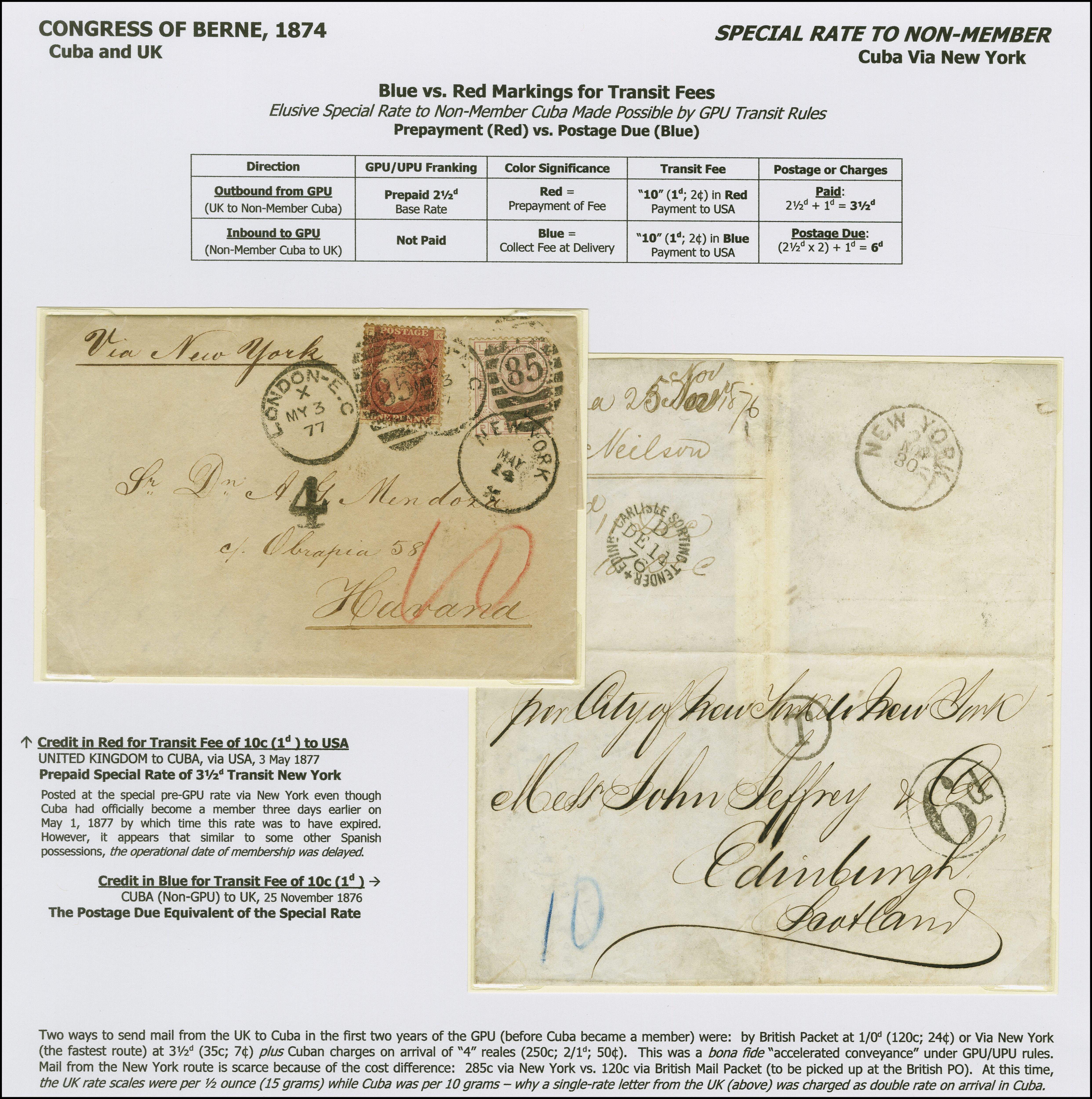 90027 cover image1874: Congress of Berne Special rate to and from Cuba and UK. Two covers, mounted on an exhibition page, informatively presented, illustrating the elusive Special rate to non-member Cuba, made possible by GPU transit. Comprising an 1876, unpaid stampless lettersheet from Havana to Edinburgh (Scotland), bearing a manuscript “10” in blue, and the handstamps “T” and “6d” in circle in black. Reverse, New York cds and a railway transit cds “CARLISLE SORTING TENDER EDINr. DE 11 76”. Some soiling and creasing. Second example; 1864, 1 penny red and 1876, 2½ pence rosy mauve, plate 7, tied to an entire from London to Havana, with handstruck “4” in black and manuscript “10” in red, sent via New York at the 3½ pence rate. Minor imperfection. Scarce duo (Image 1) (Image 2) (Image 3)