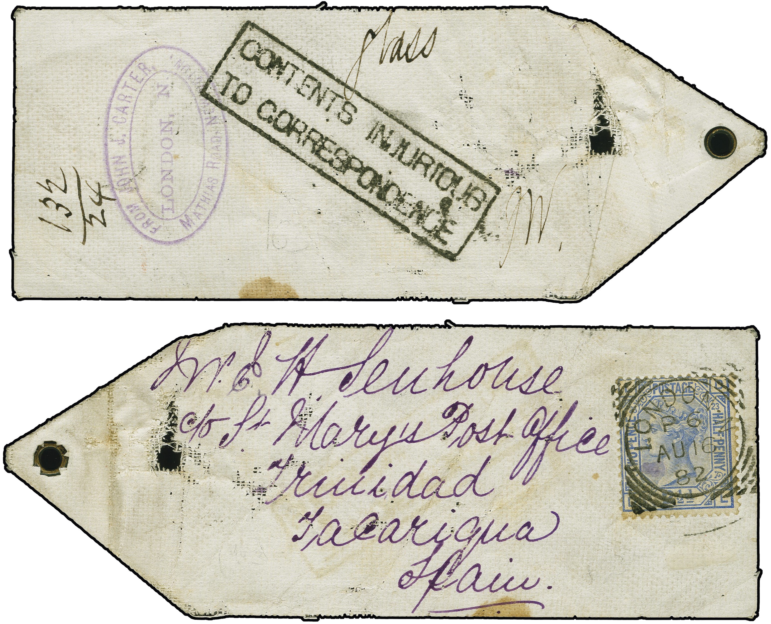 90044 piece image1881: Surface-Printed 2½ pence blue, Crown wmk., perf. 14, of good colour and fine perforations, tied by a squared circle “LONDON AU16 82” to a parcel tag sent to Port of Spain, Trinidad. Reverse, endorsed “glass” with rectangular boxed “CONTENTS INJURIOUS/TO CORRESPONDENCE” alongside a sender's cachet “FROM JOHN J. CARTER MATHIAS ROAD NEWNHAM LONDON”. Tag showing signs of wear and degradation from its transmission, although damage well clear of adhesive and minor tone marks to be expected. Remains visually appealing. Unusual example, illustrating the base rate for sending samples without value. Rare instructional mark (Image 1) (Image 2)