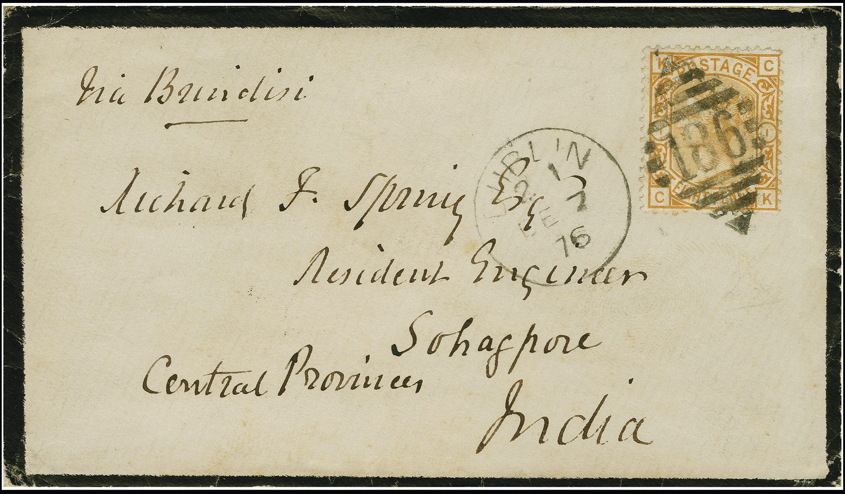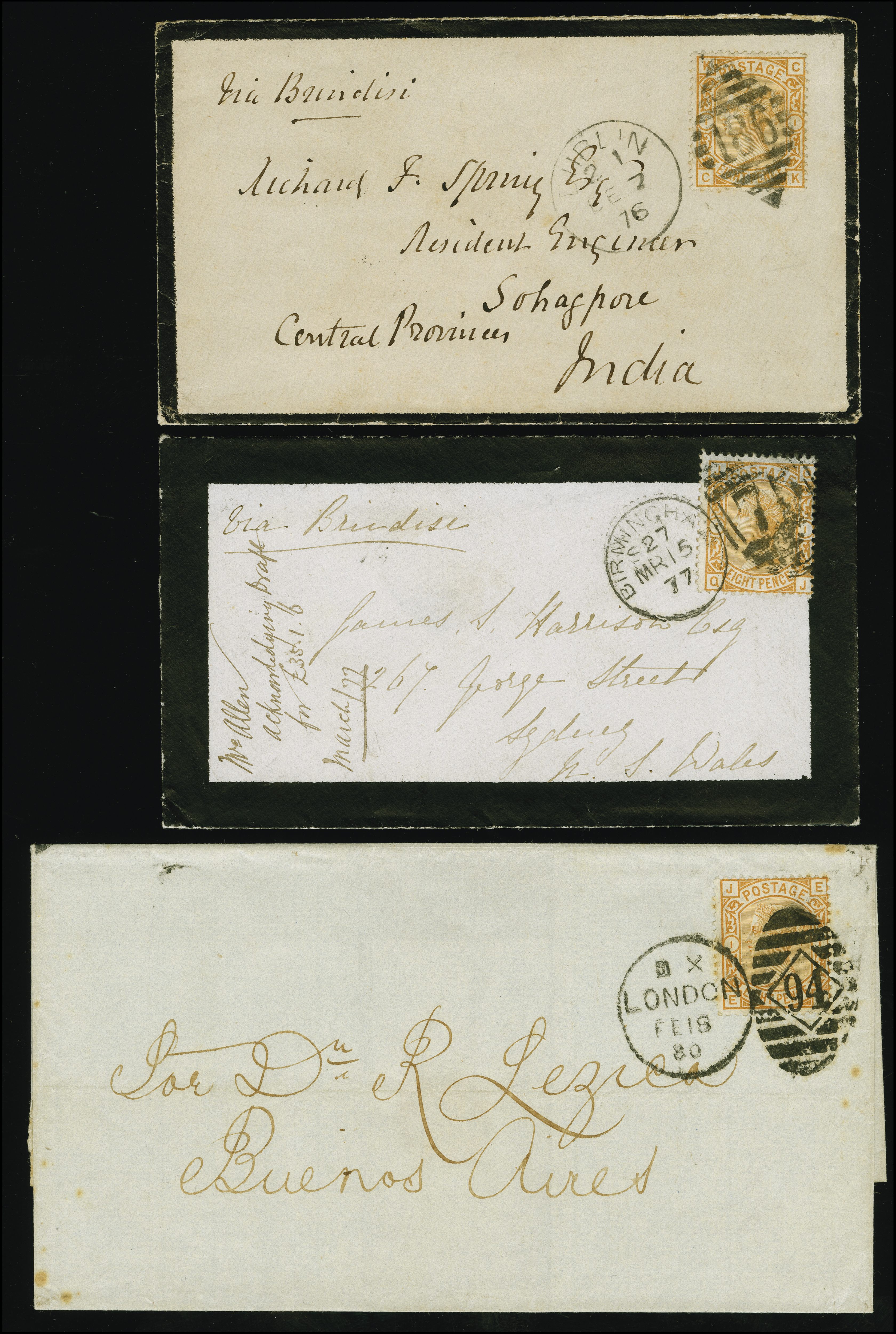 90042 cover image1876: Surface Printed 8 pence orange, plate 1, lettered CK, Large Garter wmk., perf. 14, good colour and perforations, tied by Irish duplex “186 DUBLIN DE 7 76” to a mourning envelope, sent to Sohagpur, India, endorsed “Via Brindisi”. Reverse, transit cds “SEA POST OFFICE 15 DEC” and arrival “SOHAGPUR JAN 2”. Fine and scarce. Additionally, comes with two other examples franked with the 1876 8d, comprising an example of the 8 pence rate to Australia sent from Birmingham and the other an illustration of the maritime rate sent from London to Buenos Aires, Argentina. Some imperfection. Rare trio, the Irish envelope particularly fine (Image 1) (Image 2)