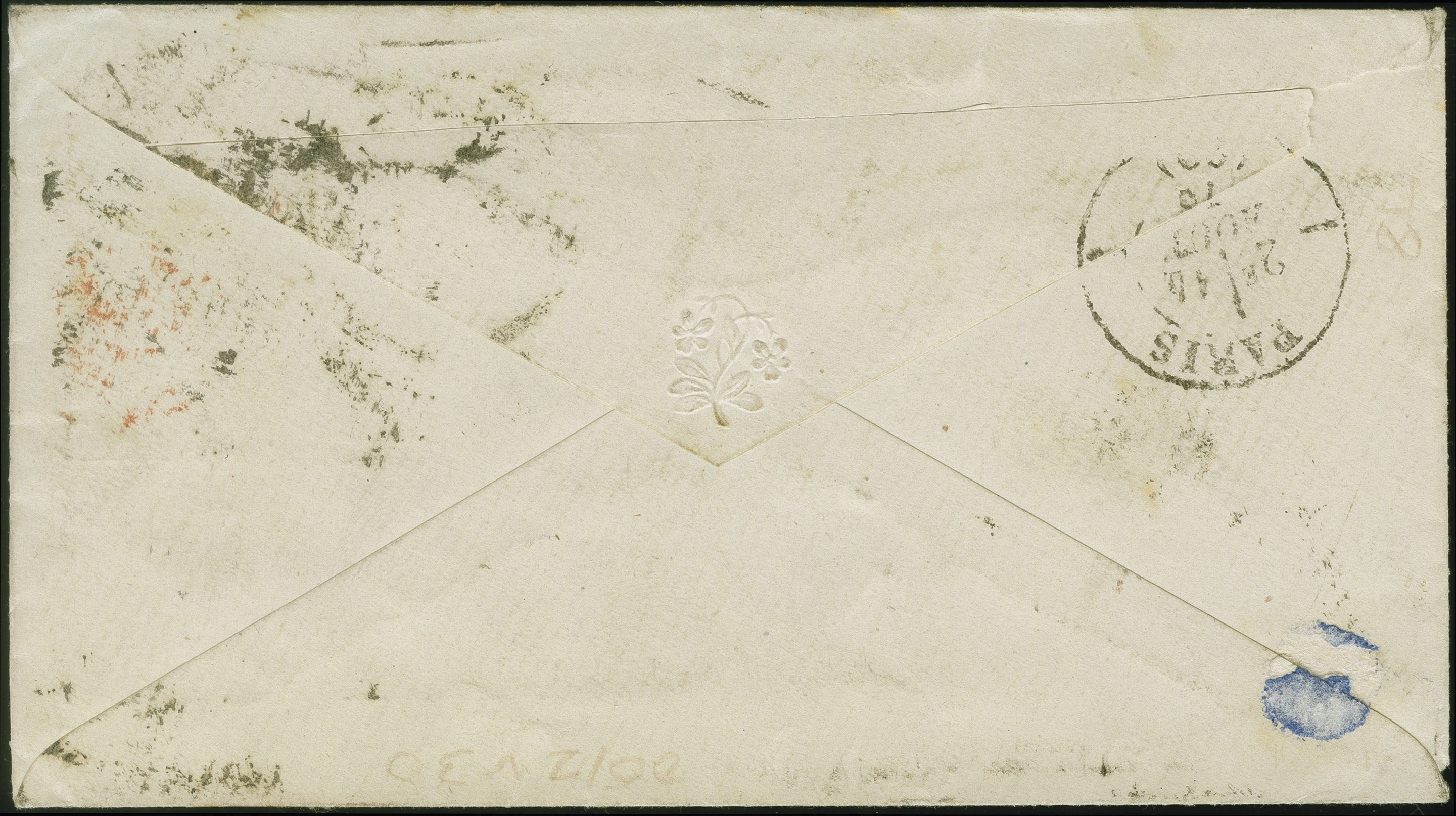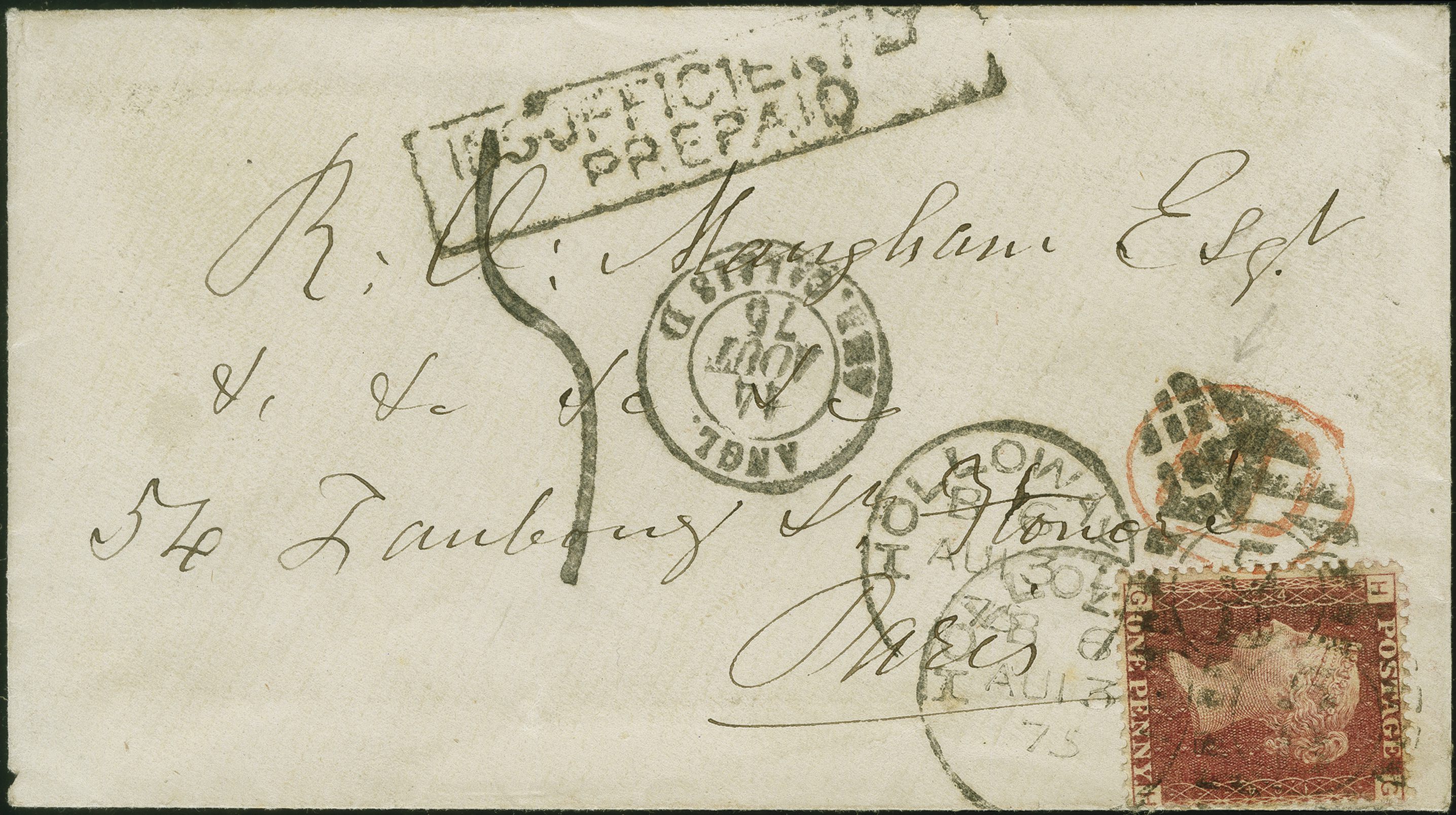 90028 cover image1864: Line Engraved 1 penny red, plate 124, lettered GH, good colour and perforations mostly fine, tied by two strikes of a duplex “HOLLOWAY AU 13 75” to a small envelope sent to Paris, with framed “INSUFFICIENTLY PREPAID”, handstruck “5”, an inspector's cork handstamp cancelling the red oval “PD” and a transit cds “ANGL CALAIS 14 AOUT 75”. Reverse, arrival cds “PARIS 15 AOUT 75”. One or two perforations affected by edge, although remains appealing. An interesting and rare cover from the French Interim period between 1 July 1875 (begin of UPU period) and 1 January 1876 (begin of France's membership).The postage due marking “5” was a pre-GPU calculation (Image 1) (Image 2)