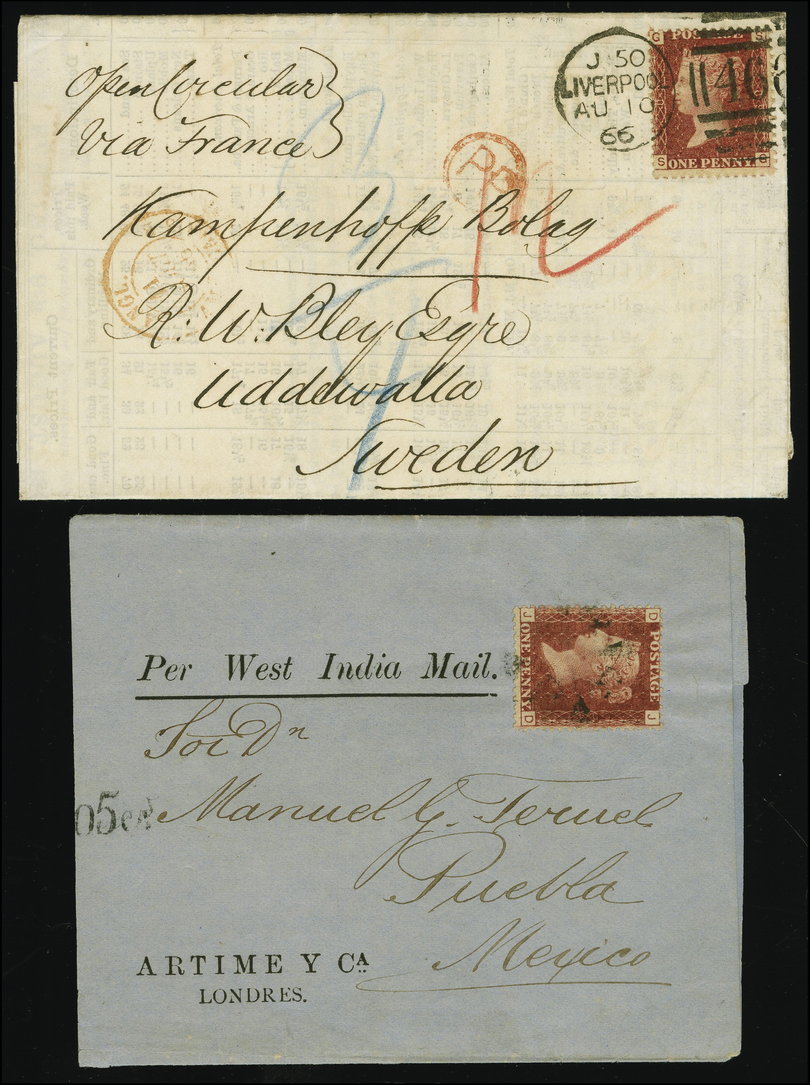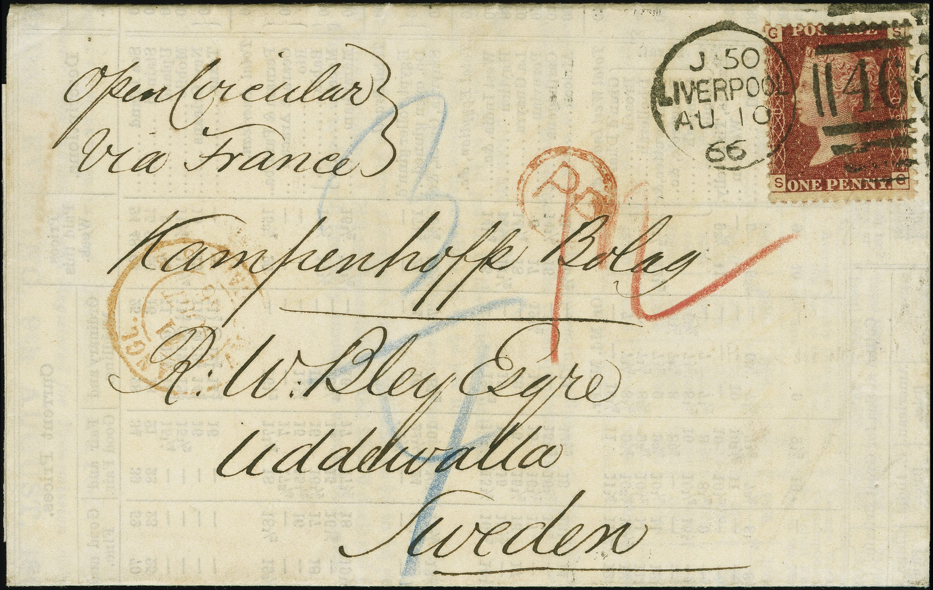 90029 cover image1864: Line Engraved 1 penny red, plate 89, lettered SG, fresh colour and good perforations, tied by duplex “466 LIVERPOOL AU 10 66” to a printed weekly circular entire sent to Uddevalla, Sweden, with red oval “PP” indicating prepayment, over-marked by manuscript “12” (Ore) alongside a blue charge "¾" (groschen), endorsed “open Circular via France”, transit cds in red “ANGL. CALAIS 7 OUT 66”. Reverse, blue manuscript “4/1” and indistinct arrival cds “10 8 66”. Very fine example and scarce with the charge markings. Comes with large part of a wrapper franked with 1 penny red sent to Mexico and with printed endorsement “Per West India Mail.” (Image 1) (Image 2)