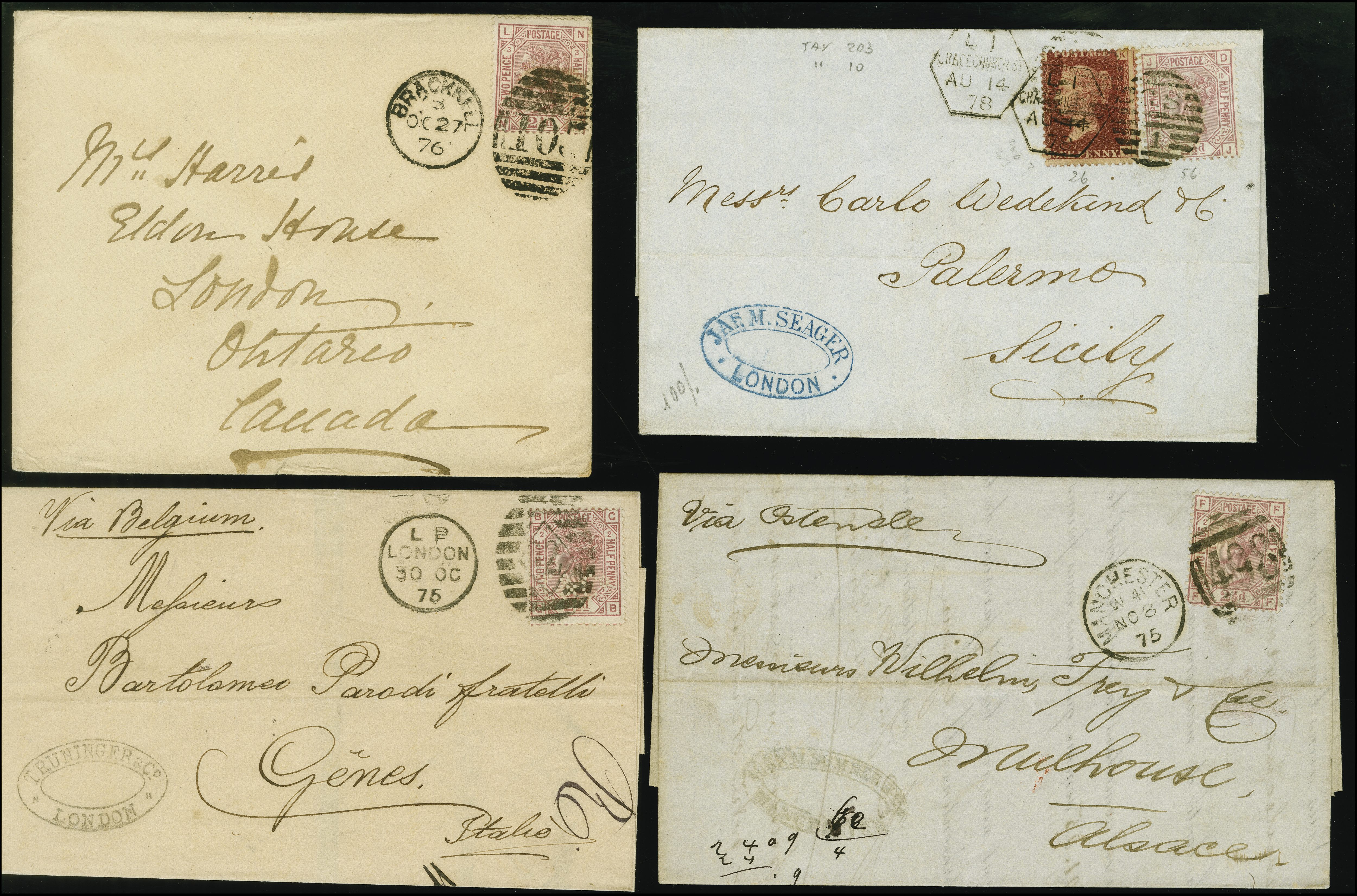 90034 cover image1875/78: Group of four destination covers all with 1875 2½ pence rosy mauve frankings. Comprising two sent in 1875; one to Germany and one to Italy, an example sent in 1876 to Canada (Bilateral Treaty rate) and an 1878 lettersheet to Sicily with the addition of a 1 penny red paying a late fee, both tied by the Gracechurch Street L1 late fee duplex. A fine selection (4) (Image 1) (Image 2)