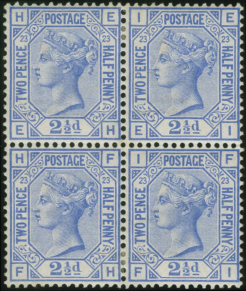 90043 */bof image1881: Surface Printed, 2½ pence blue, plate 23, lettered EH-FI, Crown wmk., perf. 14, block of four, unused, fresh colour, perforations fine, part og., fine appearance. Gi = £ 2'600. Provenance: Collection ‘Severin’, Corinphila, April 2012, lot 4068 (Image 1) (Image 2)