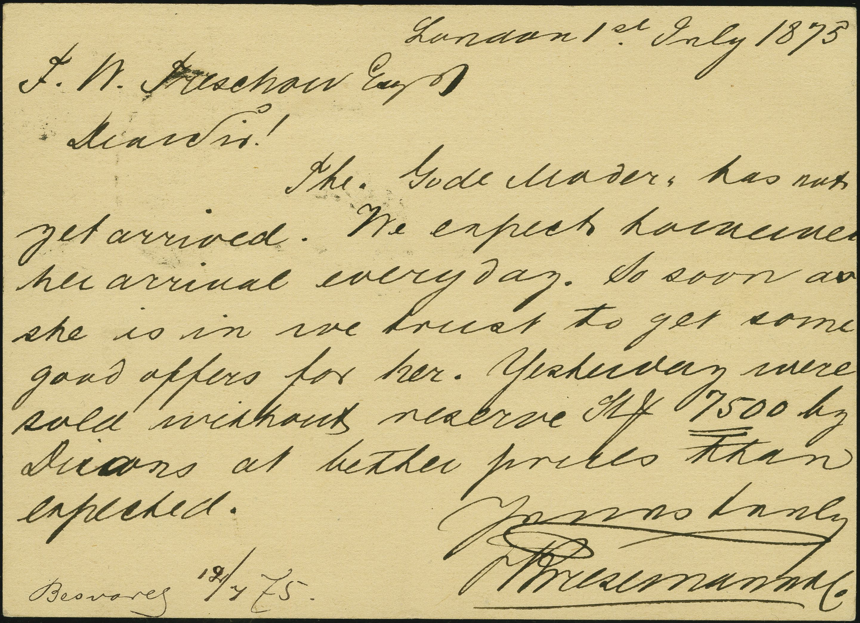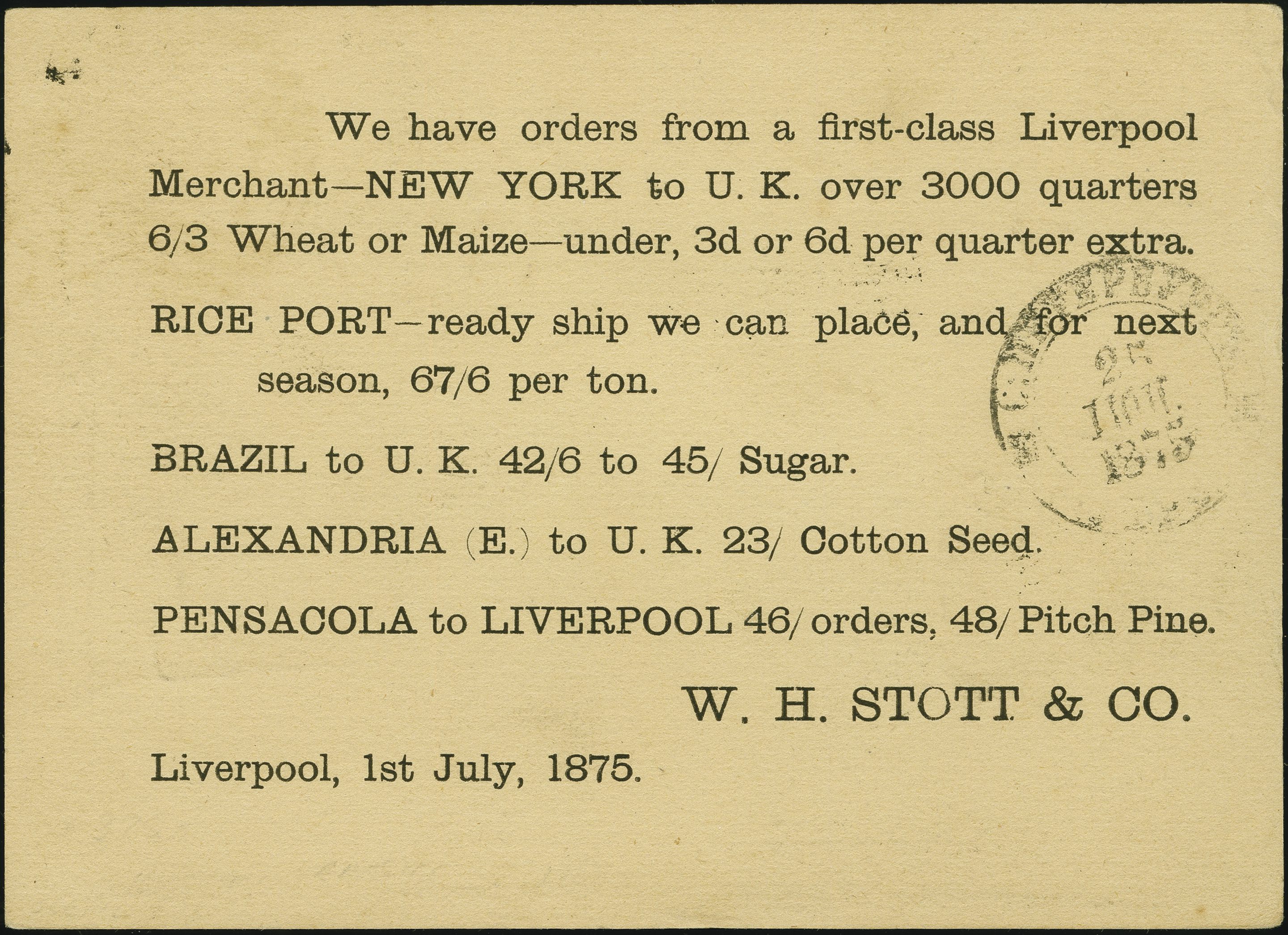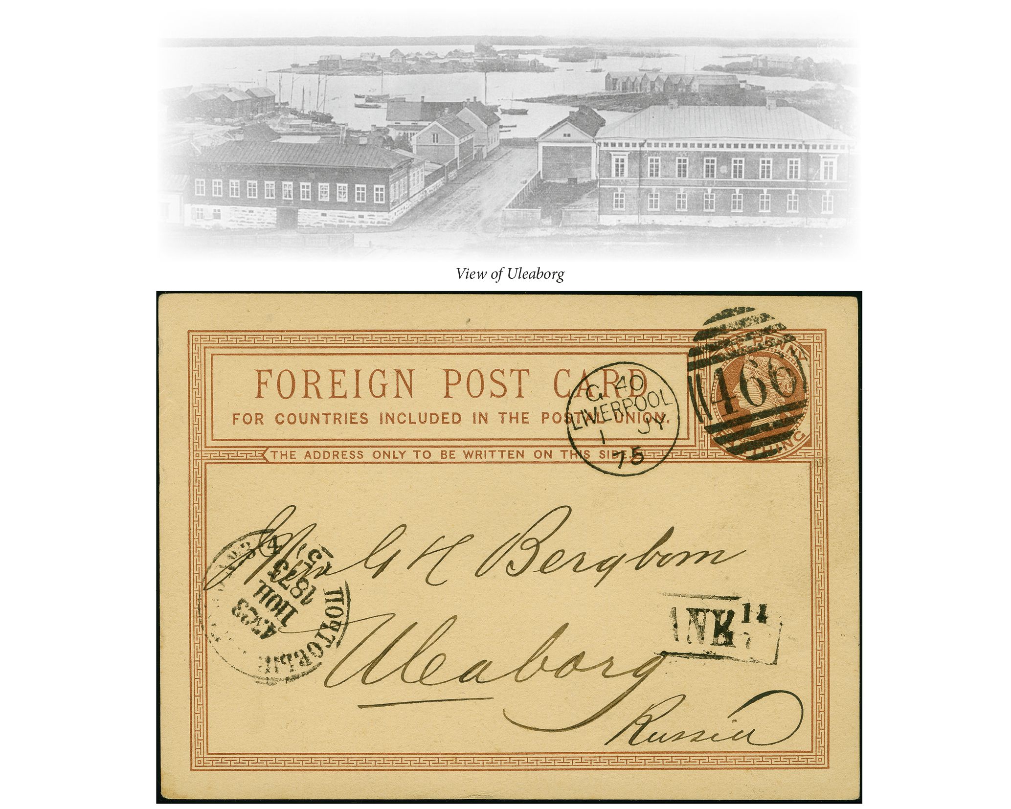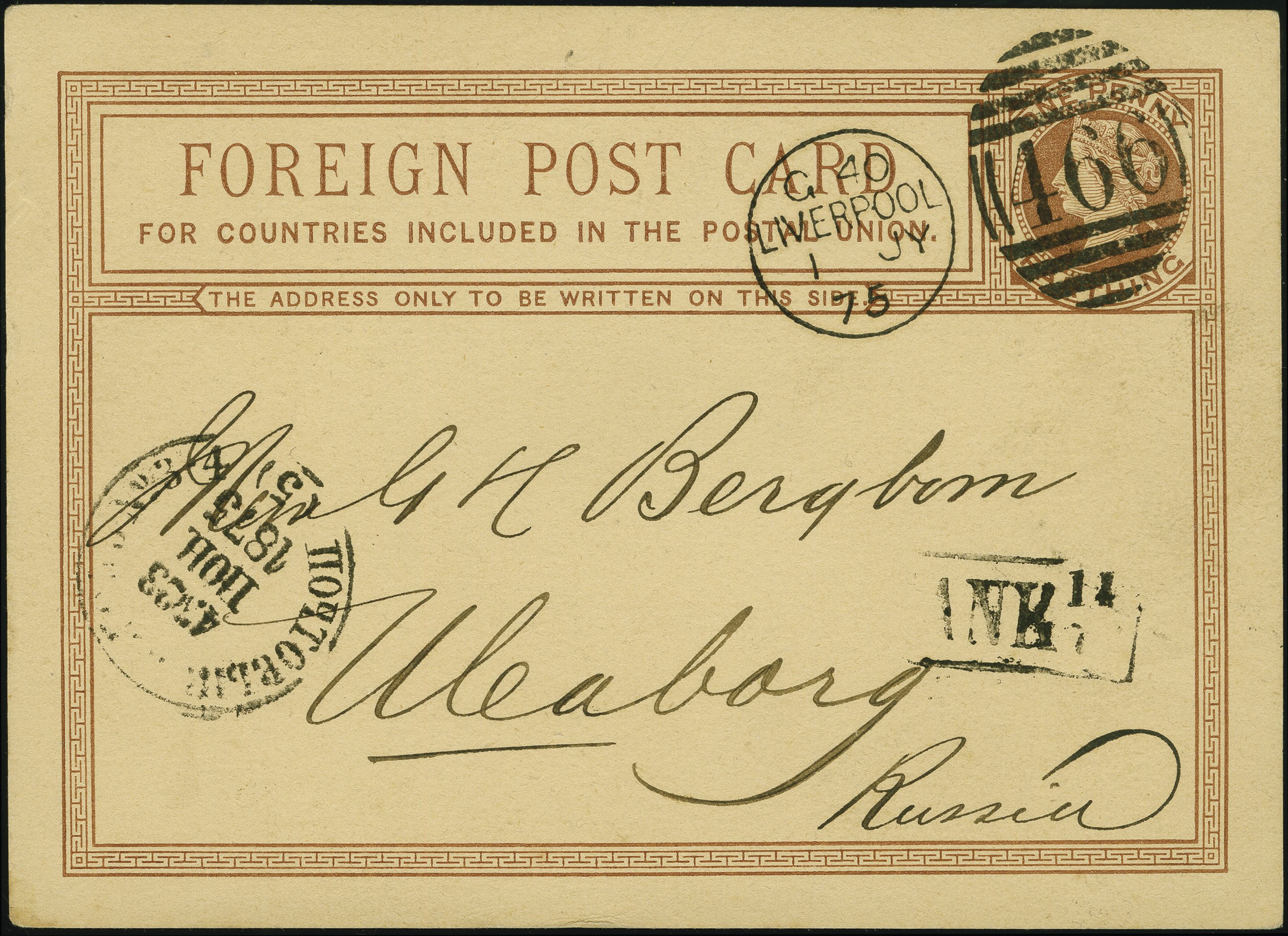90066 cover image1875: Foreign stationery postal card 1¼ pence brown, used with duplex “466 LIVERPOOL 1 JY 75”, sent to Sveaborg, Finland (then a Grand Duchy within the Russian Empire). Reverse, Saint Petersburg transit mark and a printed commercial message which refers to wheat and maize sales. A well preserved and important First Day use; with a clear postmark. (H&G 4)Note: This card reflects three important ‘First Day’ milestones; 1) First Day of the General Postal Union, 2) First Day of issue of the 1¼ pence brown foreign postal card, and 3) First Day that post cards could be sent from the UK to Foreign destinations. Reference: The Postal History of the Universal Postal Union: The Postal Card, Worldwide 1869-1975, Volume 1, illustrated pg. 241 (Image 1) (Image 2) (Image 3)