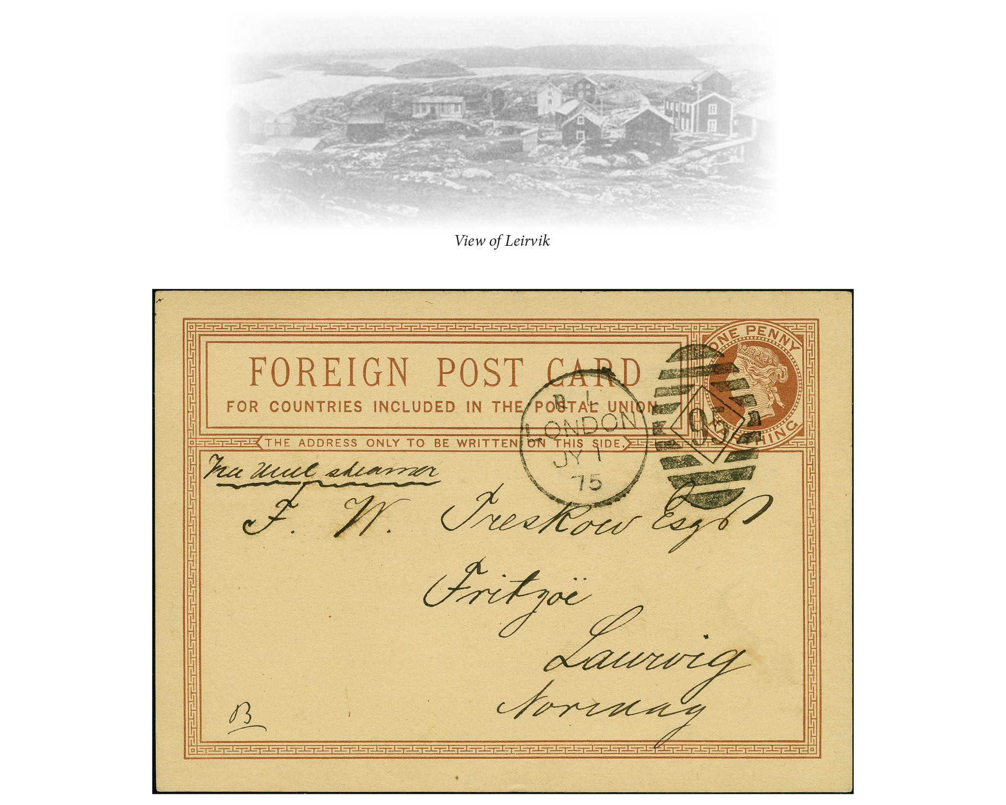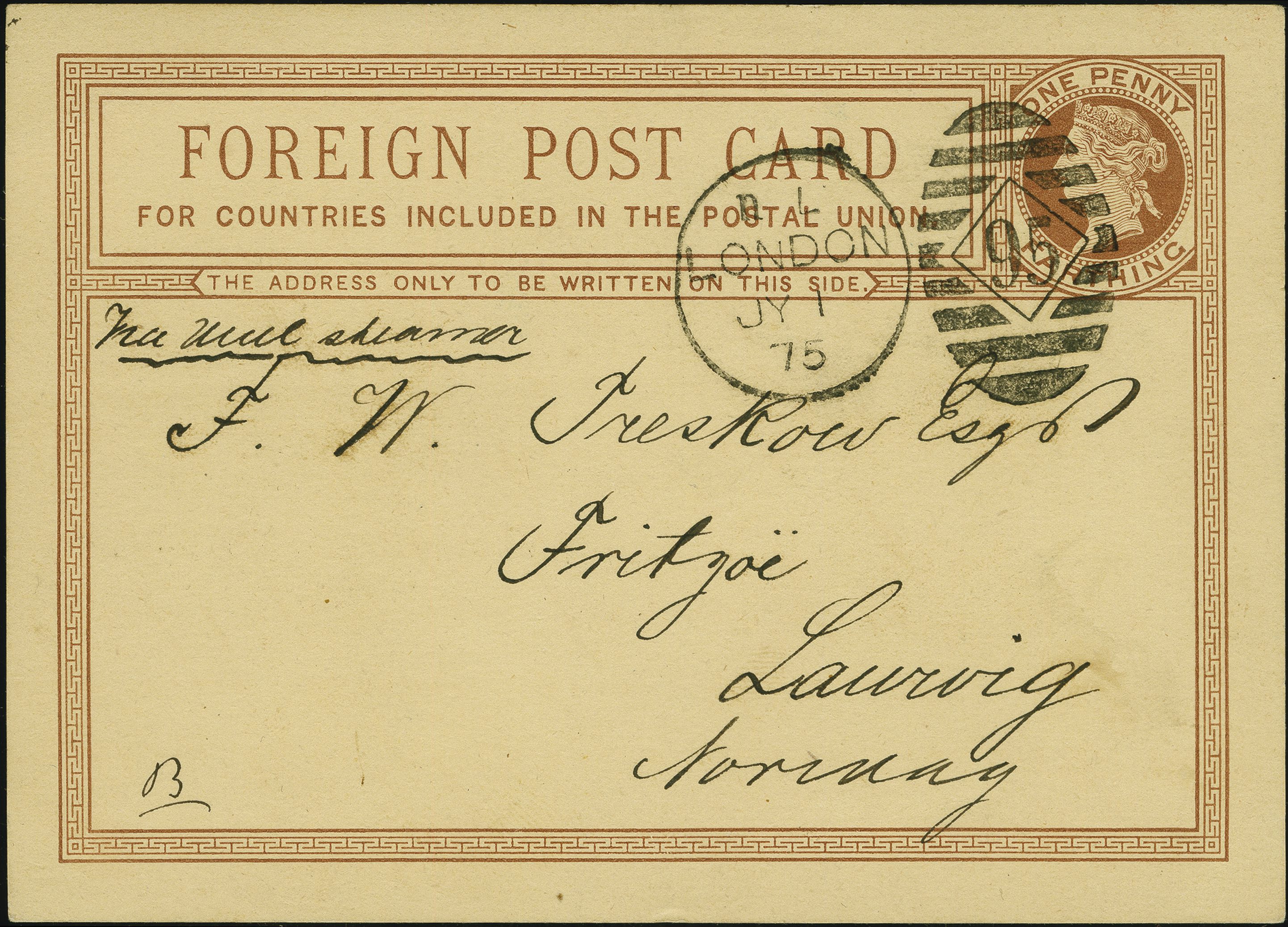 90065 cover image1875: Foreign stationery postal card 1¼ pence brown, used with duplex “95 LONDON JY 1 75”, sent to Leirvik, Norway on the First Day of issue, endorsed “via mail steamer”. A clean and fresh example. Scarce; one of 12 first ay examples, this with a clear postmark. (H&G 4)Note: This was the first British foreign-rate post card issued specifically for the GPU day. Previously, post cards could not be sent from the UK to foreign destinations even if paid at the letter rate (although five are known). Six of nine founding members had a proper rate post card in time for the GPU day, but had issued them before the Congress of Berne 1874 (Image 1) (Image 2) (Image 3)