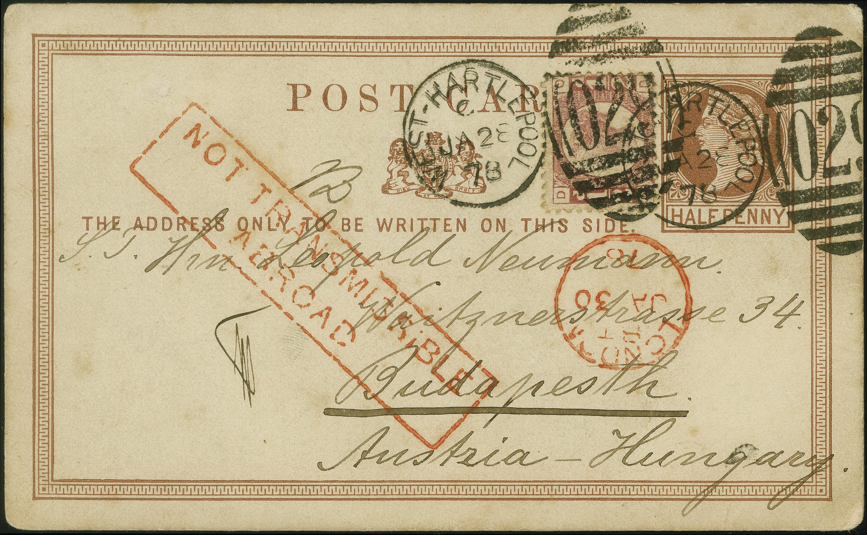 90064 cover image1875: Stationery postal card ½ penny brown, uprated with Line-Engraved 1874 ½ penny rose, plate 11, fine colour and perforations, tied by barred duplex “029 WEST HARTLEPOOL 28 JA 78”, sent to Budapest, Hungary, with “LONDON 30 JA 78” cds and instructional boxed rectangular “NOT TRANSMISSIBLE / ABROAD”, both in red, alongside. Faint diagonal crease top left and minor soiling. Very rare survivor of a post card not forwarded abroad as per GPU rules. Normally destroyed by the British Post Office. Note: The domestic ½ penny postal card, uprated with an additional ½ penny, is deficient by a ¼ of a penny for the full GPU rate of 1¼ pence. Although, the UK issued a farthing coin, it did not issue a farthing stamp.Reference: The Postal History of the Universal Postal Union: The Postal Card, Worldwide 1869-1975, Volume 1, illustrated pg. 253 (Image 1) (Image 2)