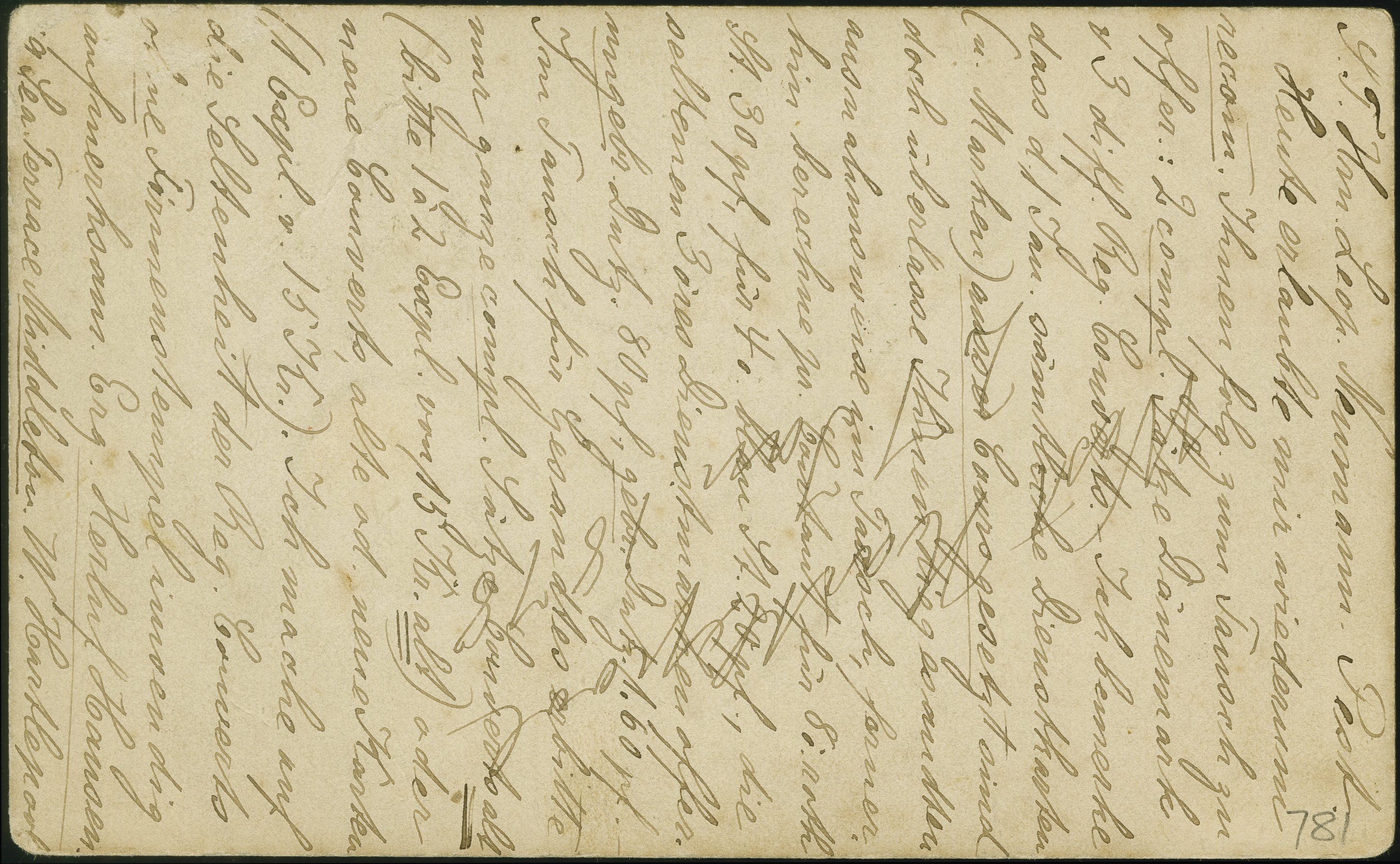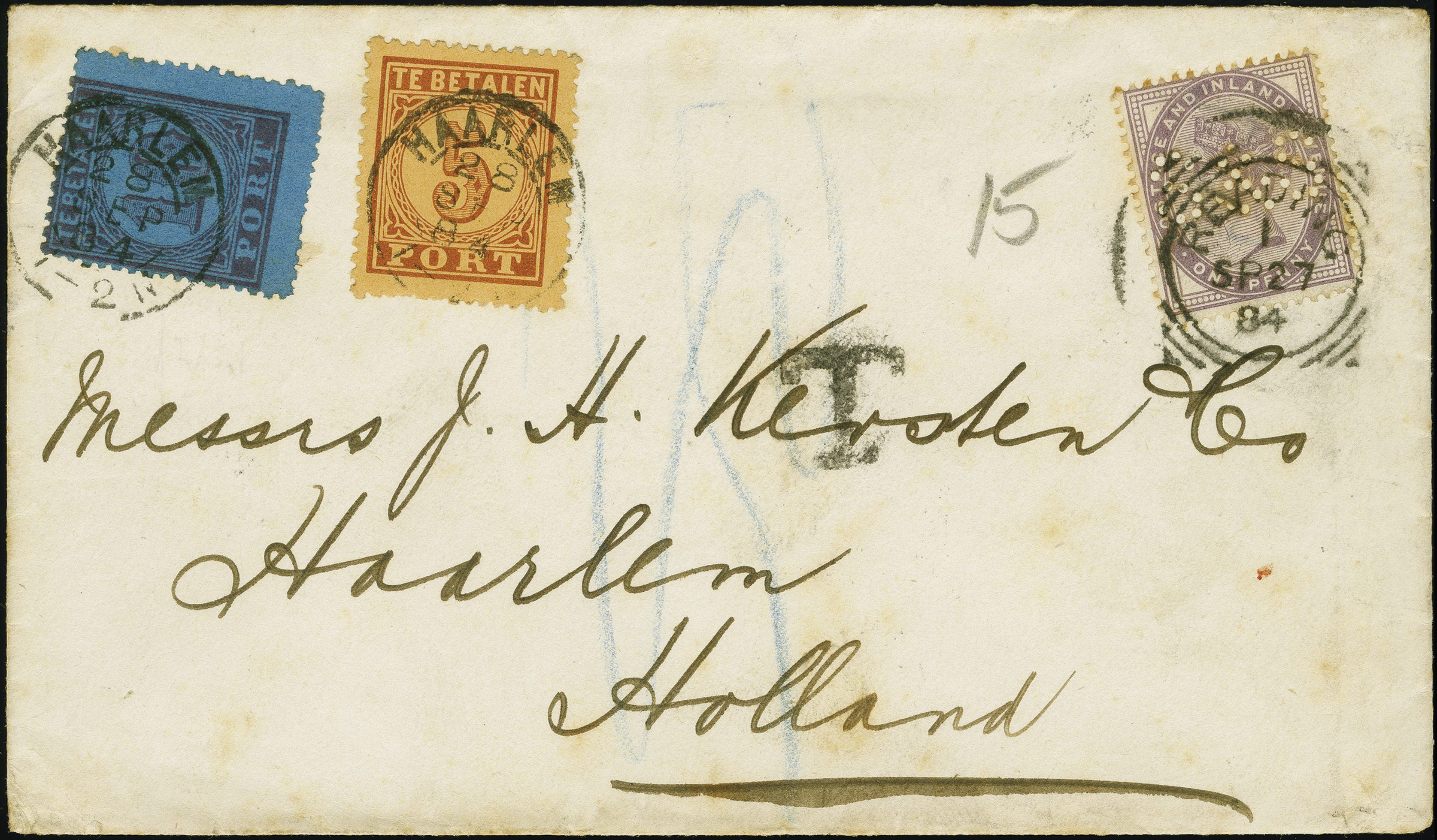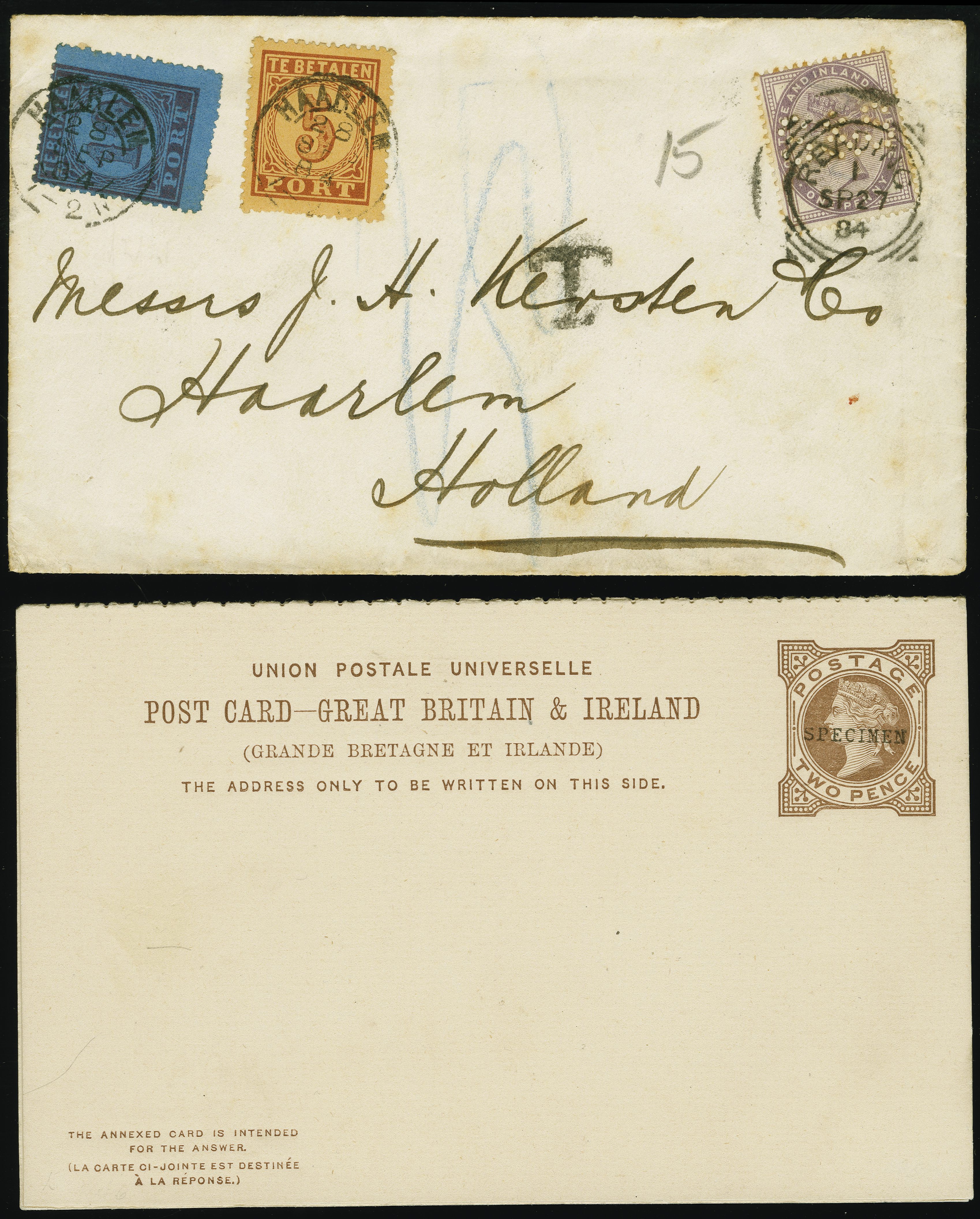 90047 cover image1881: Surface Printed 1 penny lilac, perfin ‘S&S’, in combination with Netherlands 1870, postage due 5 cents brown on orange and 10 cents violet on blue, in the main good colour and perforations, the former tied by squared circle “READING SP 27 84”, the latter by cds “HAARLEM 28 SEP 84” to an envelope sent to Haarlem, Netherlands, with handstruck “T” in black and manuscript “15”. Tone spots and soiled. Scarce combination of GB with Netherlands first postage dues. Additionally, comes with a Specimen example of the 1883 2 pence brown stationery reply card, with both imprints handstruck with SPECIMEN (H&G15s). Fresh and fine. Reference: The Postal History of the Universal Postal Union: The Postal card, Worldwide 1869-1975, Volume 1, illustrated pg. 579 (specimen card) (Image 1) (Image 2)