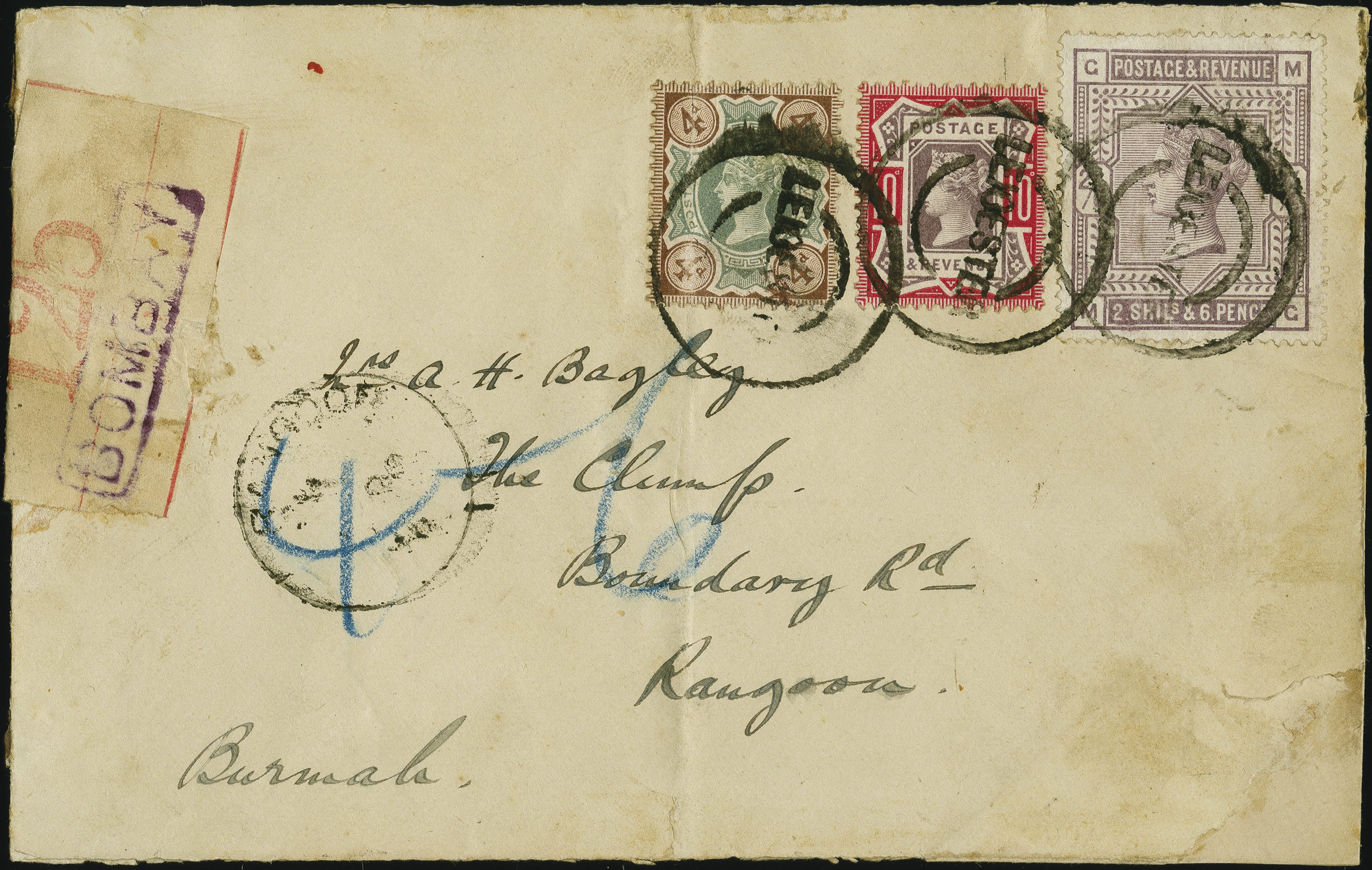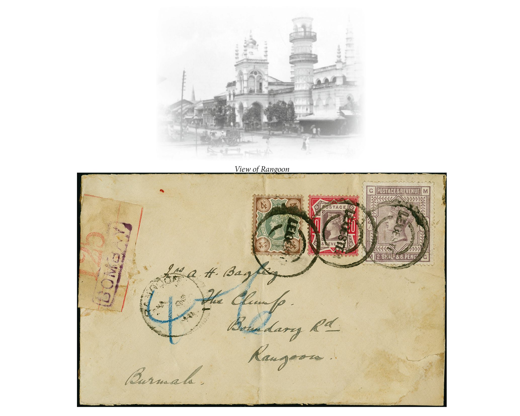 90051 cover imageParcel Post 1884: Surface-Printed 2 shilling 6 pence lilac, used with Jubilee 1887, 4 pence green & brown and 1890, 10 pence dull purple & carmine, all of fresh colour and mainly good perforations, tied by undated circular “LEOMINSTER” to a parcel envelope sent to Rangoon, Burma, with manuscript British parcel number “46” in blue crayon, and an arrival cds in Rangoon (indistinguishable date). In addition, the India PO have removed the envelope from the parcel and applied a Parcel Control Label numbered “125” with “BOMBAY” boxed handstamp in purple. Heavy vertical filing fold through 4 pence and the corners of the envelope repaired from contemporary damage. Rare combination; only recorded example of an Indian “Parcel Control Label” on incoming mail. Note: The UK began its parcel post service on 1 August 1883, three years after signing the Special Convention on Parcel Post (Paris 1880). The British opted for parcel labels glued onto parcels, even though parcels were irregular in shape, being wrapped in brown paper and held together by twine - joined under wax or lead seals. Cardboard boxes at the time were flimsy and rarely used. The British parcel system was modeled on its registry system, negating the need for the double-tracking of parcel envelopes used by most countries and adopted by the UPU. However, when sending parcels abroad, the British PO had to use parcel envelopes within the UPU parcel operating system (Image 1) (Image 2) (Image 3)