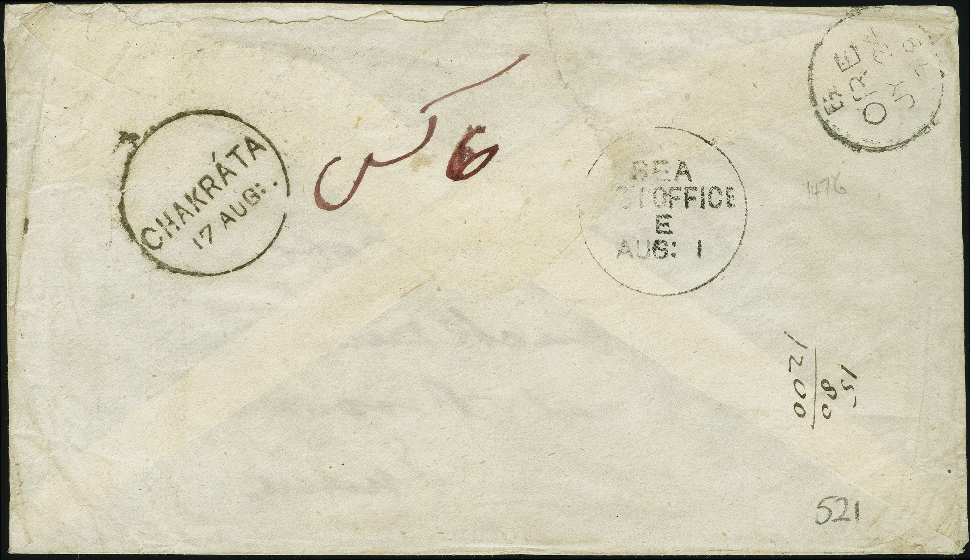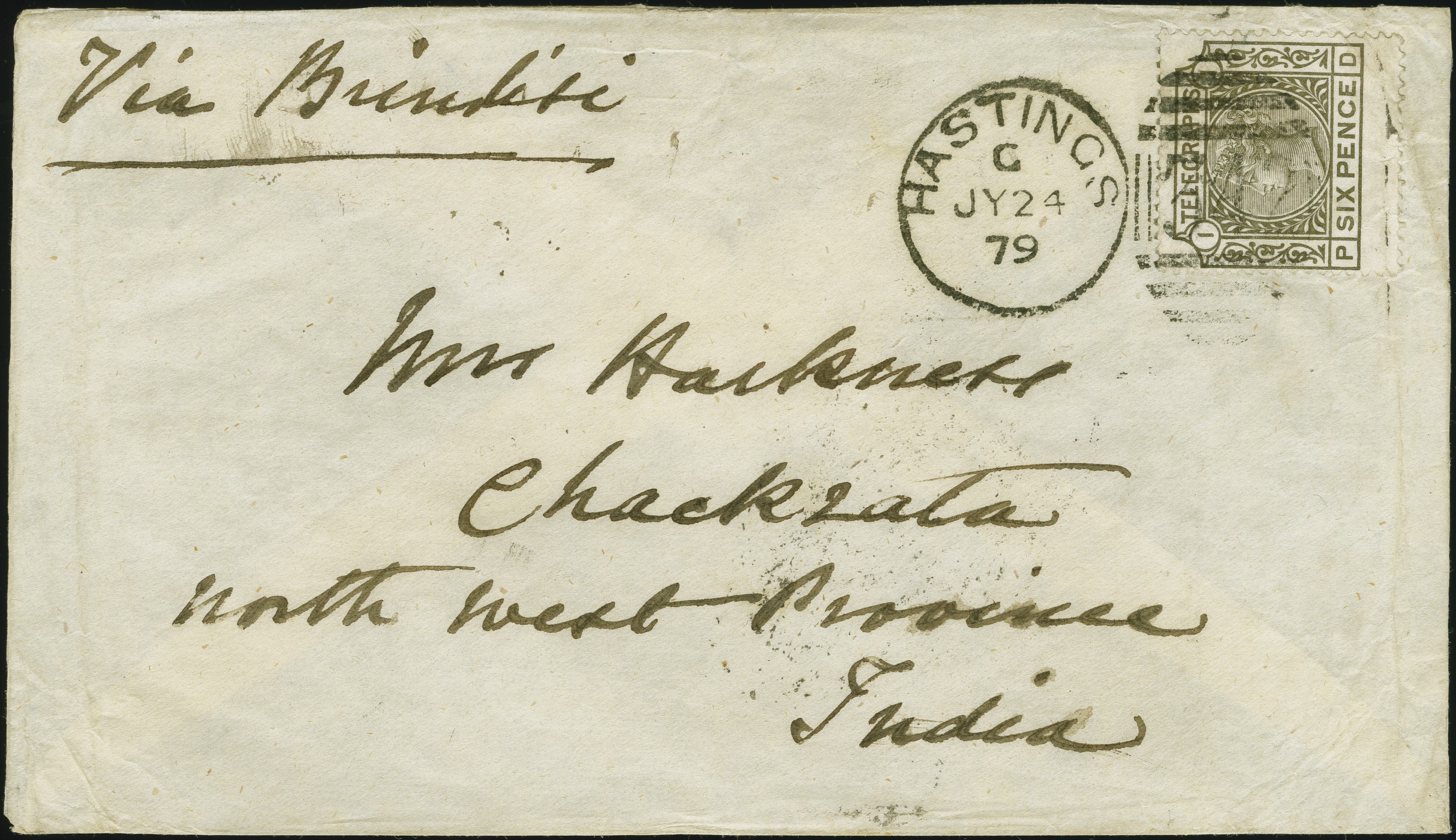 90059 cover image1877: Telegraph 6 pence grey, plate 1, lettered PD, Spray wmk. sideways, perf. 14, good colour and perforations mostly fine, tied by duplex “HASTINGS JY 24 79” to an envelope sent to Chakrata, India, endorsed “Via Brindisi”. Reverse, transit cds “ORE JY 24 79”, “SEA POST OFFICE AUG 1” and arrival “CHAKRATA 17 AUG”. Minor wrinkling to envelope slightly affecting adhesive and a couple of short perforations at top. Fine and scarce transitional 6 pence India & Far East rate; the use of a Telegraph stamp as postage is uncommon. Note: UK granted a special concession transitional rate of 6d for such mail directed via Brindisi from 1 April 1879 to 31 January 1880. #### ERROR #### Unterschiedliche Eintr ge in den beiden Sprachversionen der Provinienz (Image 1) (Image 2)