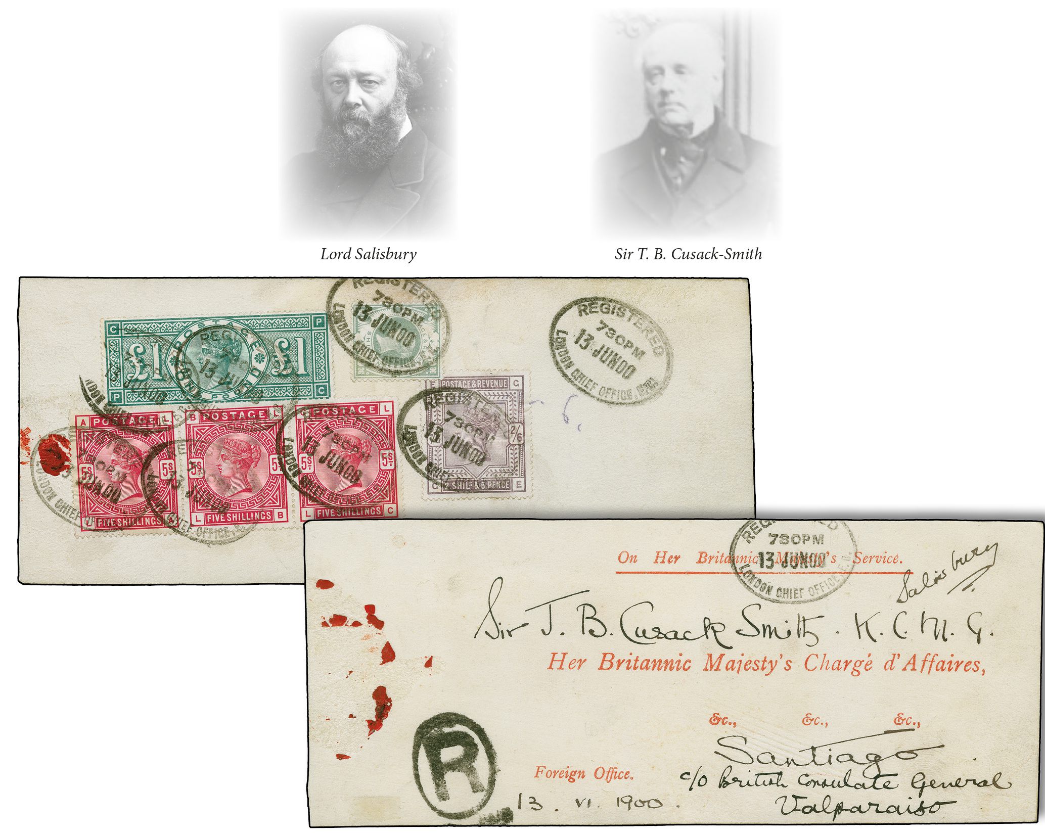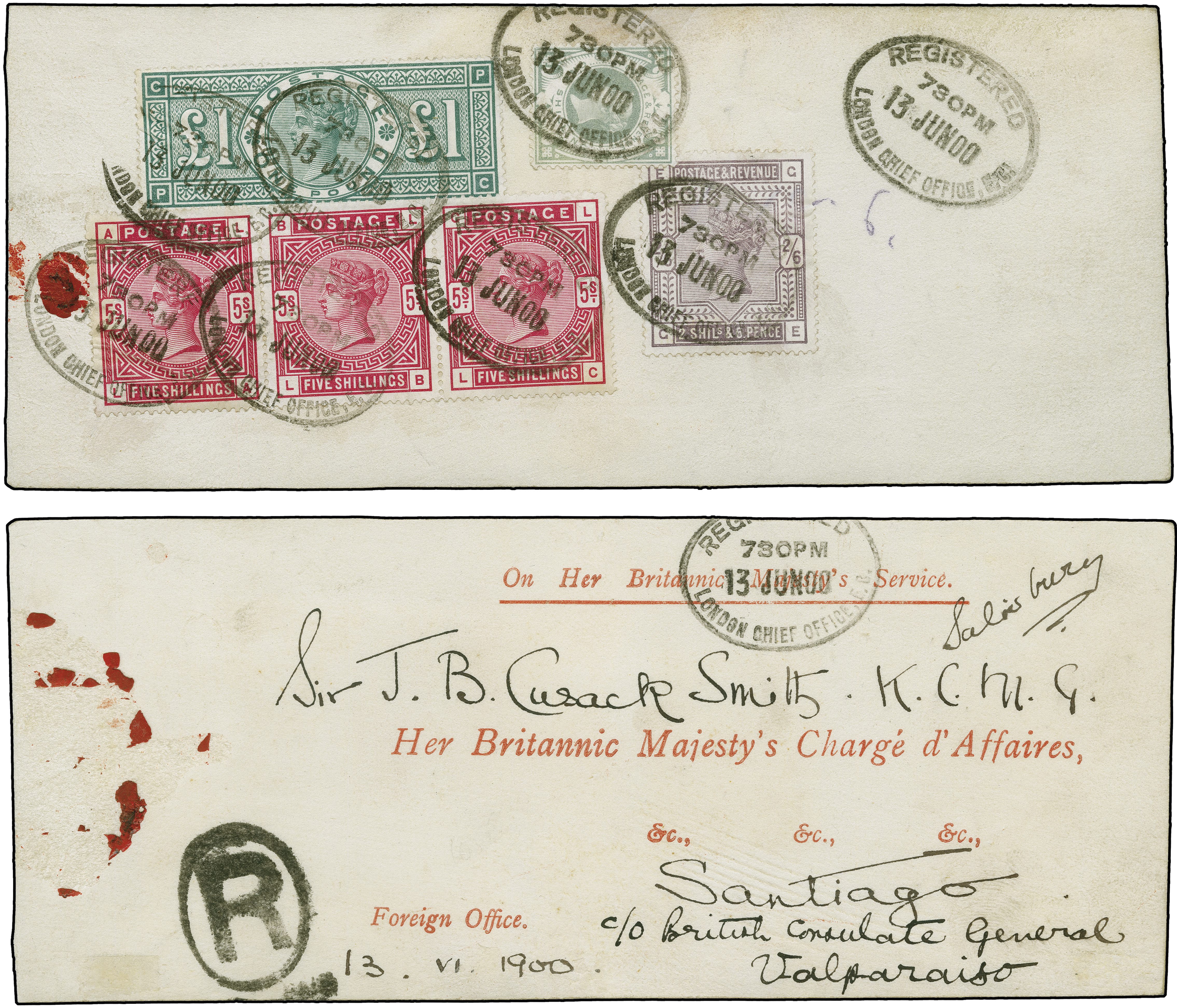 90050 cover imageParcel Post 1884: De La Rue High-Values 2 shilling 6 pence lilac and 5 shilling rose strip of three, in combination with Jubilee 1887, 1 shilling dull green and 1891, £1 green, all of fresh colour and perforations mainly fine, tied by oval “REGISTERED LONDON CHIEF OFFICE 13 JUN 00” to the reverse of a registered “On Her Britannic Majesty's Service” parcel tag, sent to Santiago, Chile, by the British Prime Minister Lord Salisbury (signed at top), addressed to Sir T. B. Cusack Smith and c/o British Consulate General, Valparaiso, with handstruck oval “R” in black and an additional “REGISTERED LONDON CHIEF OFFICE 13 JUN 00”. First 5 shilling has a prefix wrinkle south-east corner which doesn't detract. Remarkably well-preserved. Very rare franking, the Queen Victoria £1 green is exceedingly rare, much more so than the KEVII £1 green which is also a rarity. Sent at a Letter Postage rate plus 2d registration of £1.18.06, via the Diplomatic Pouch. Note: Robert Gascoyne-Cecil, 3rd Marquess of Salisbury (1830 to 1903), known as Lord Salisbury, served as Prime Minister of the United Kingdom three times for a total of over thirteen years. In office; 23 June 1885 – 28 January 1886, 25 July 1886 – 11 August 1892 and 25 June 1895 – 11 July 1902. Reference: Illustrated in “Collectors Club Philatelist”, New York, Jan./Febr. 2011 Provenance: Spink, 24 May 2002, lot 1055 (Image 1) (Image 2) (Image 3)