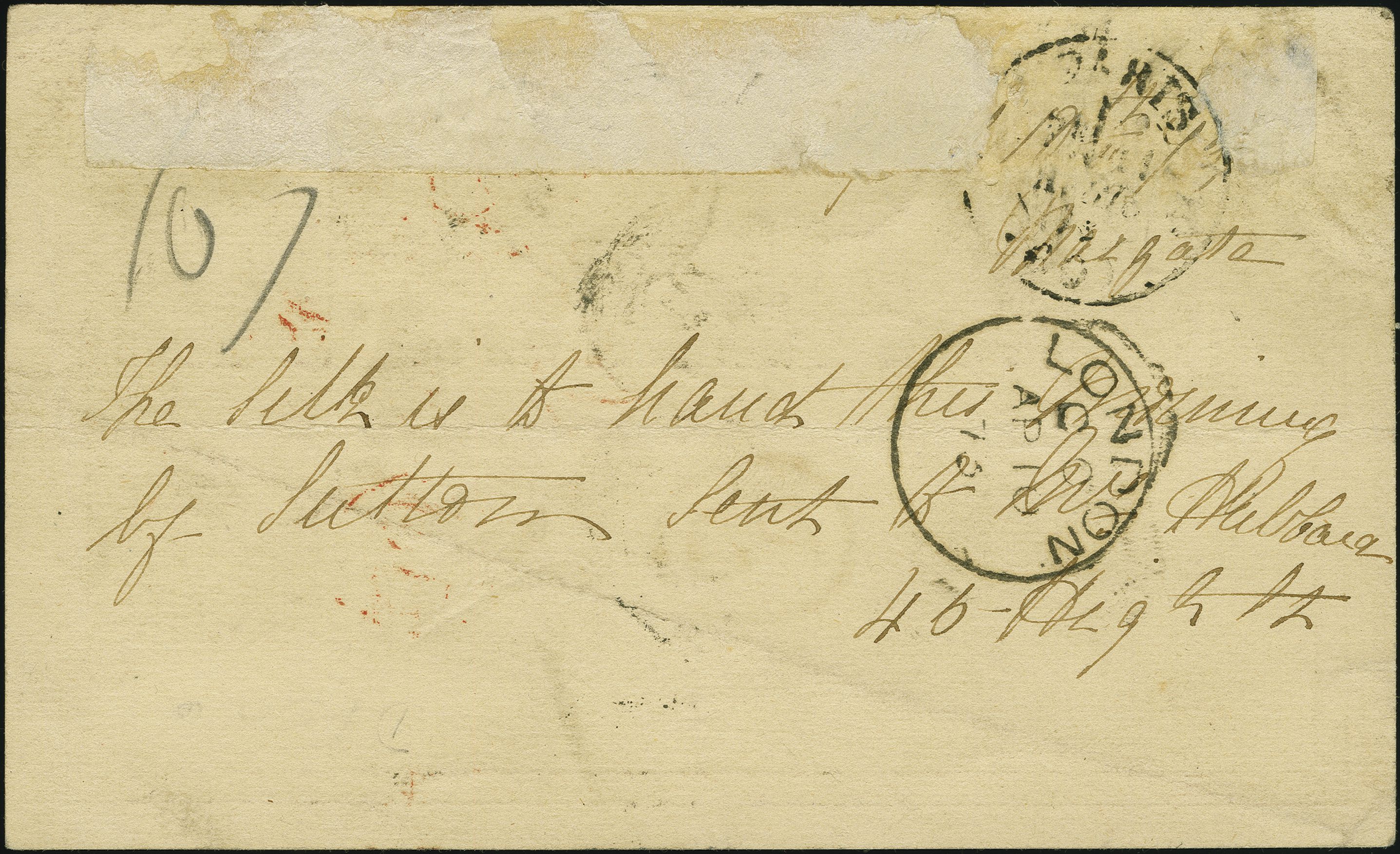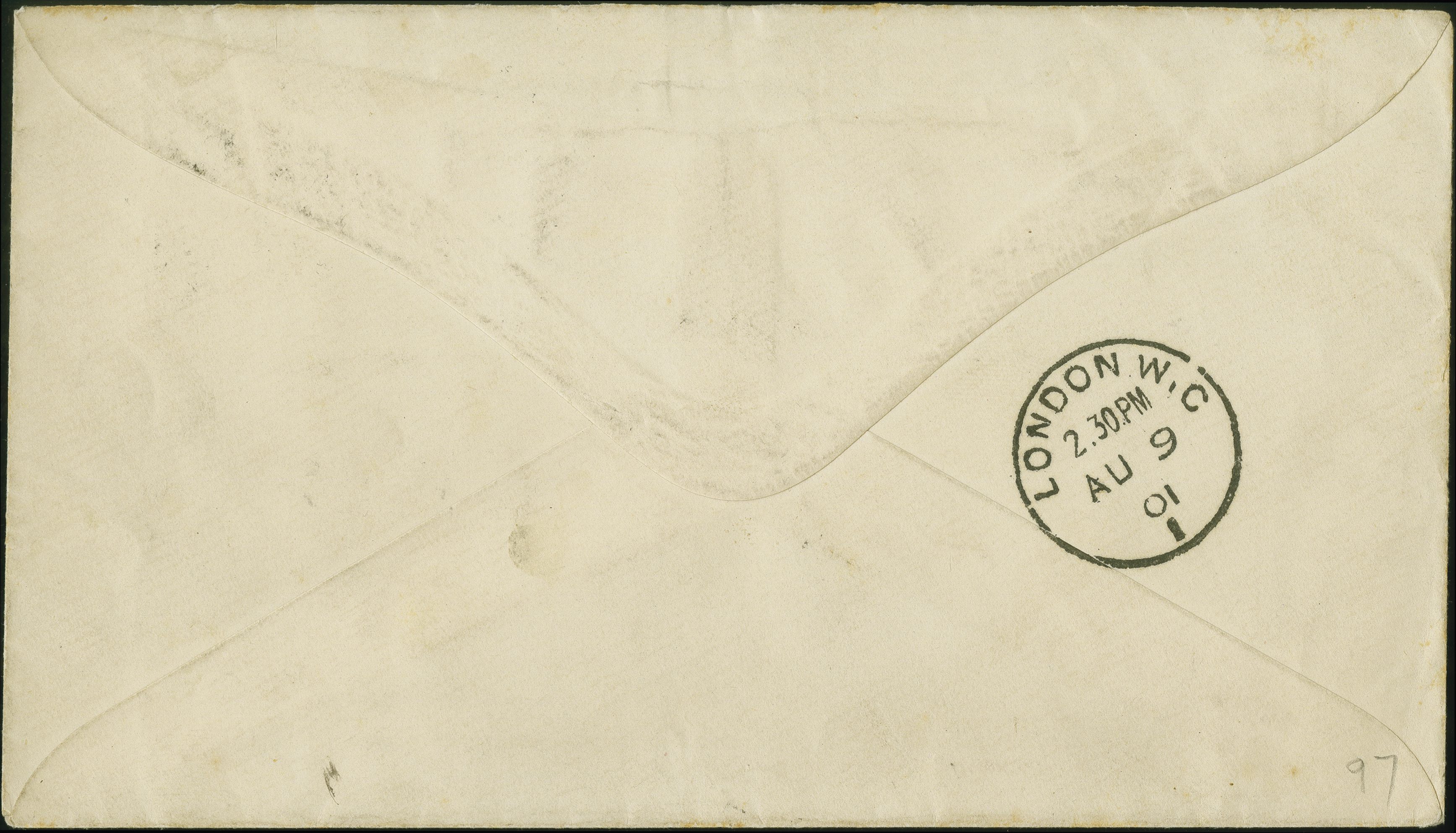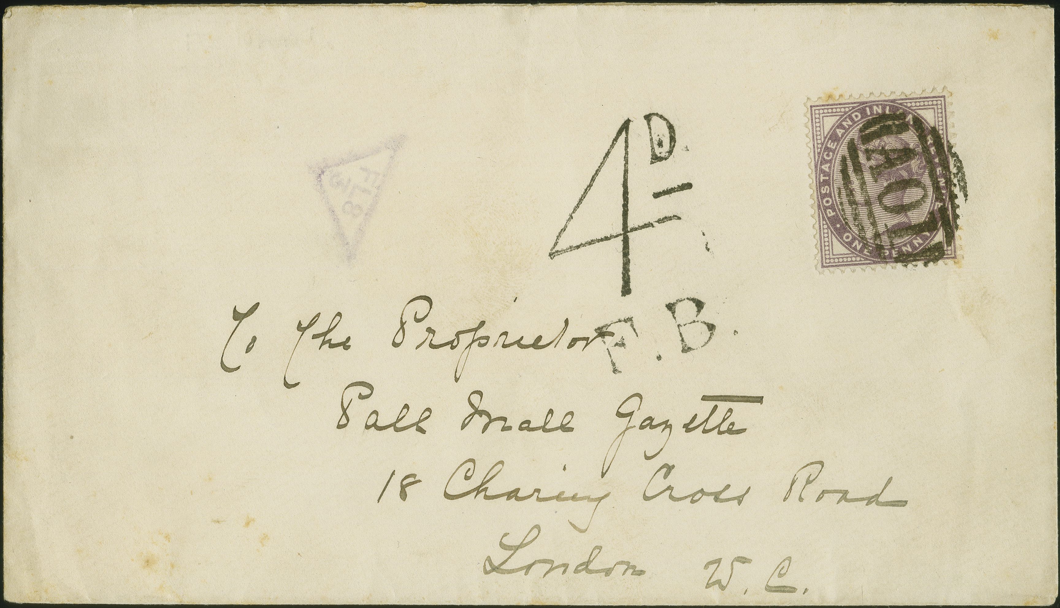 90046 cover image1881: Surface-Printed 1 penny lilac, die II, Crown wmk., perf. 14, good colour and fine perforations, tied by the barred oval “A01” to an envelope sent to London, with handstamp “4d/F.B.” charge mark in black and alongside small triangle “FLB / 3” in purple. Reverse, an arrival cds "LONDON “W.C. AU 9 01”. A few tone spots, which don't detract. Fine and interesting example of a British stamp used abroad and unaccepted.Note: The “A01” was previously assigned to the British PO in Jamaica, but redeployed to the Foreign Branch in the UK, and used by inspectors from early 1900s. The country of origin did not mark the cover as unpaid, although it had to have been put into the postage due mailbag or wrapper to be noticed and charged at the London Foreign Branch for an improper use of a British stamp abroad. Reference: Illustrated in “Collectors Club Philatelist”, New York, Jan./Febr. 2011 (Image 1) (Image 2)