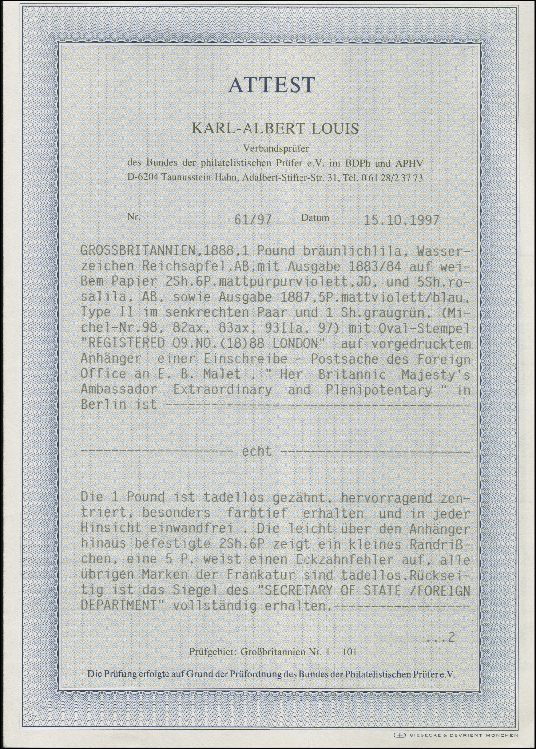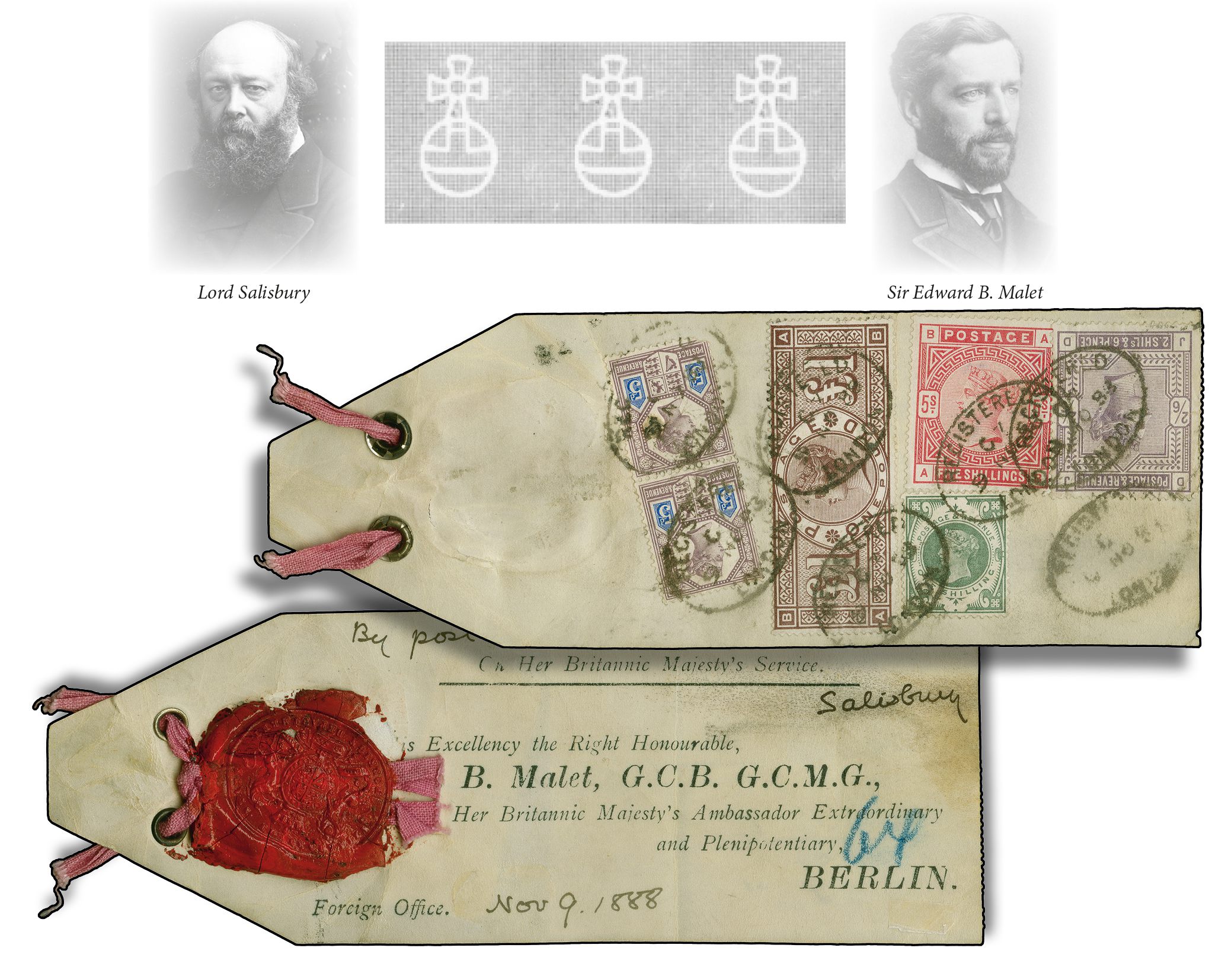 90049 cover imageParcel Post 1884: De La Rue High-Values, 2 shilling 6 pence lilac and 5 shilling rose, in combination with Jubilee 1888, 5 pence dull purple & blue vertical pair and 1887, 1 shilling dull green together with 1888, £1 brown-lilac, Three-Orbs wmk., all of good colour, perforations mainly fine, tied by oval “REGISTERED LONDON 9 NO 88” to the reverse of a “On Her Britannic Majesty's Service” parcel tag, sent to Berlin, Germany, by the British Prime Minister Lord Salisbury (signed at top), addressed to “Sir Edward B. Malet, Ambassador Extraordinary and Plenipotentiary”. Front, signed “Salisbury", endorsed ”By post registered" and dated “Nov. 9 1888” with Foreign Office wax seal. Soiling and creasing as might be expected, not affecting adhesives. The odd short perforation, and the lower 5 pence has a clipped corner lower left. The 2 shilling 6 pence side is affected by its proximity to the edge of the tag. A most spectacular franking and great rarity of Great Britain philately. A unique piece. Cert. Louis (1997). Note: This Parcel Post Label bearing the £1 watermark “Three Orbs” was a “New Find” by a German collector and is the only known franking of the £1 “Three Orbs” watermark on either cover or parcel tag. Provenance: “SEVERIN”, D. Feldman, 13 April 2010, lot 20321 (Image 1) (Image 2) (Image 3)