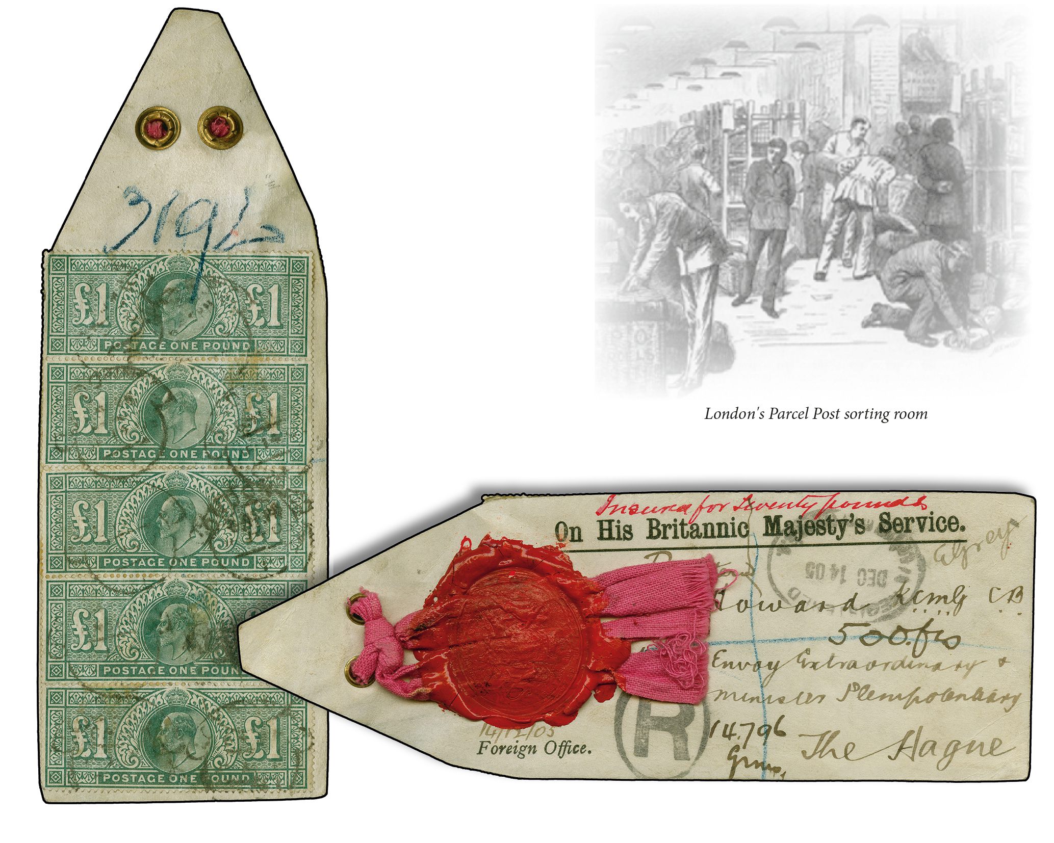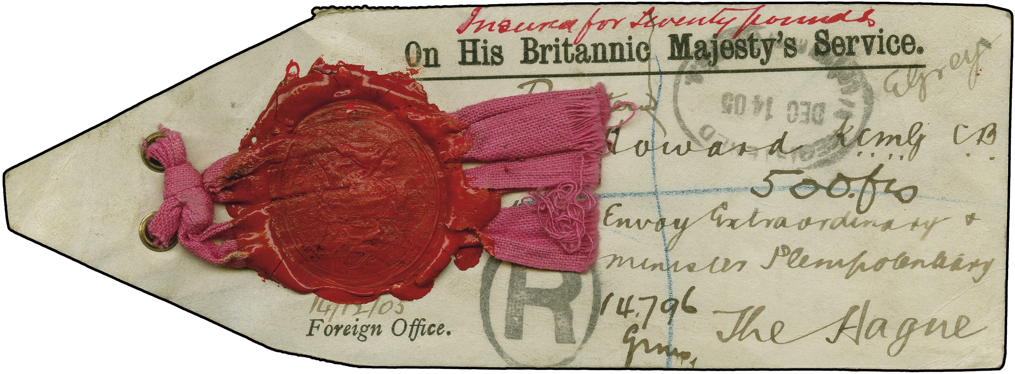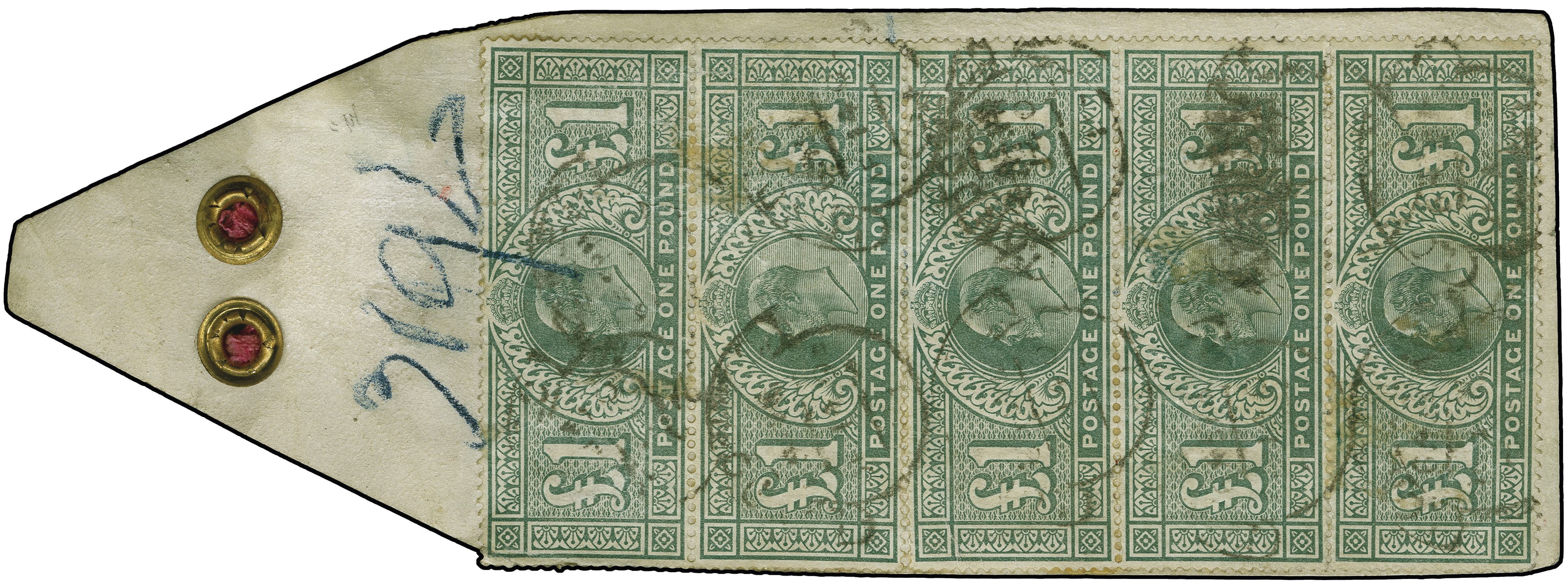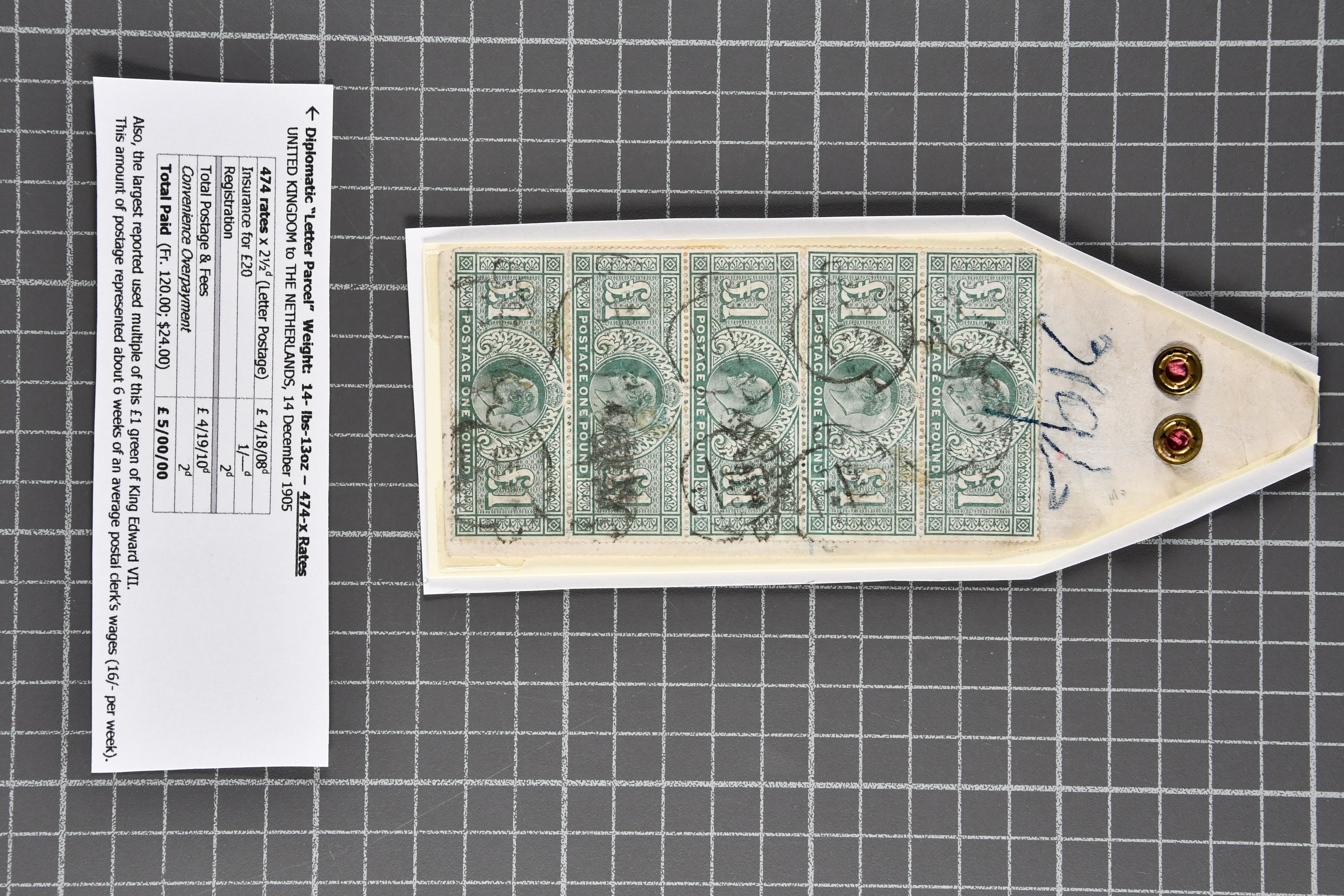 90052 cover image1902/11: De La Rue, £1 green, vertical strip of five, good colour and perforations mainly fine, tied by hooded circle “LONDON E.C. DE 14 05” to the reverse of a “On His Britannic Majesty's Service” parcel tag, sent registered to ‘The Hague’, Netherlands, endorsed on front “Insured for seventy pounds” with oval “REGISTERED DEC 14 05” alongside and the Foreign Office wax seal. Remarkably well preserved for a parcel tag. Spectacular franking. Rare. Largest recorded multiple of this issue. Note: This amount of postage represents about 6 weeks of an average postal clerk's wages (16 shillings per week) (Image 1) (Image 2) (Image 3) (Image 4)
