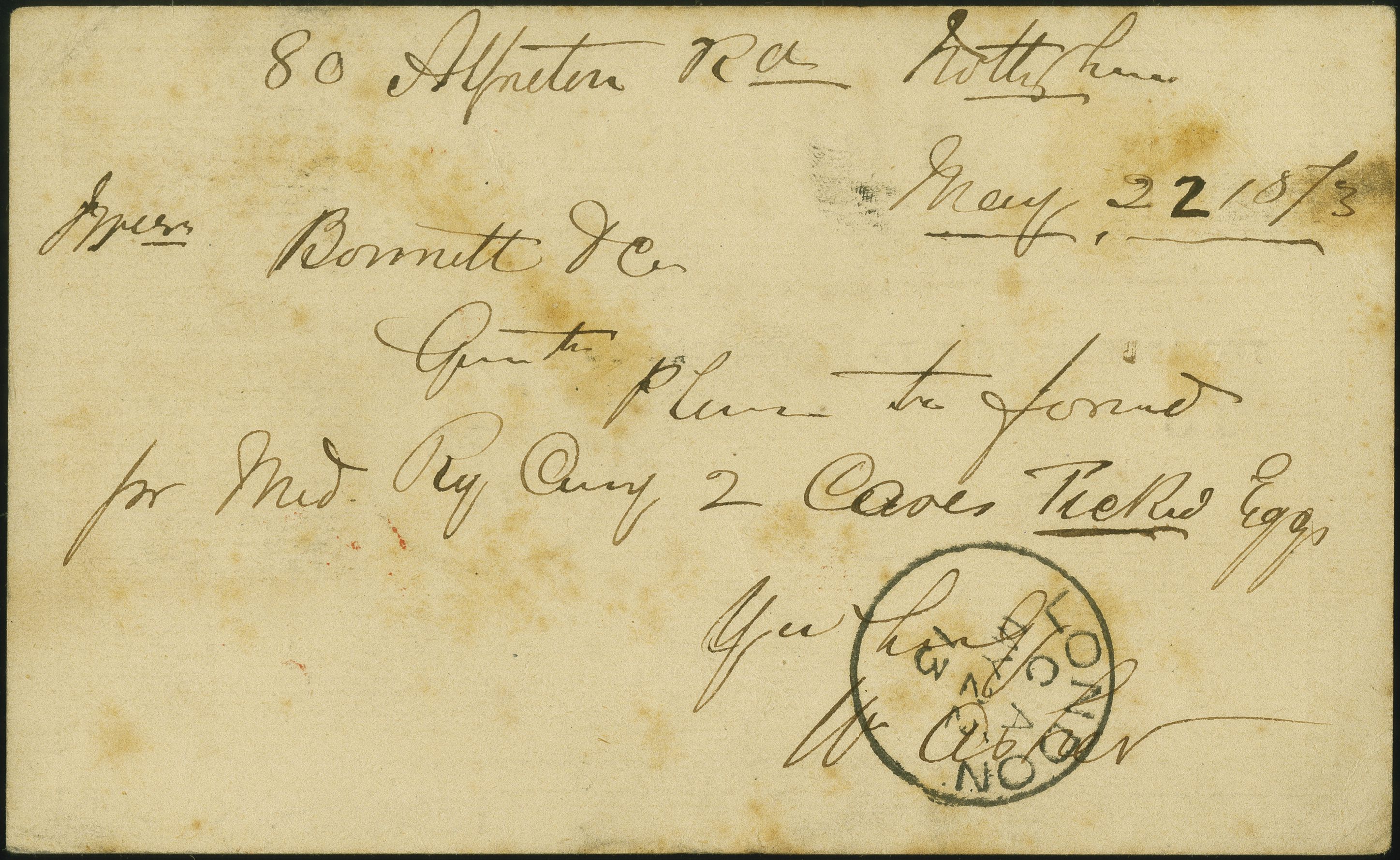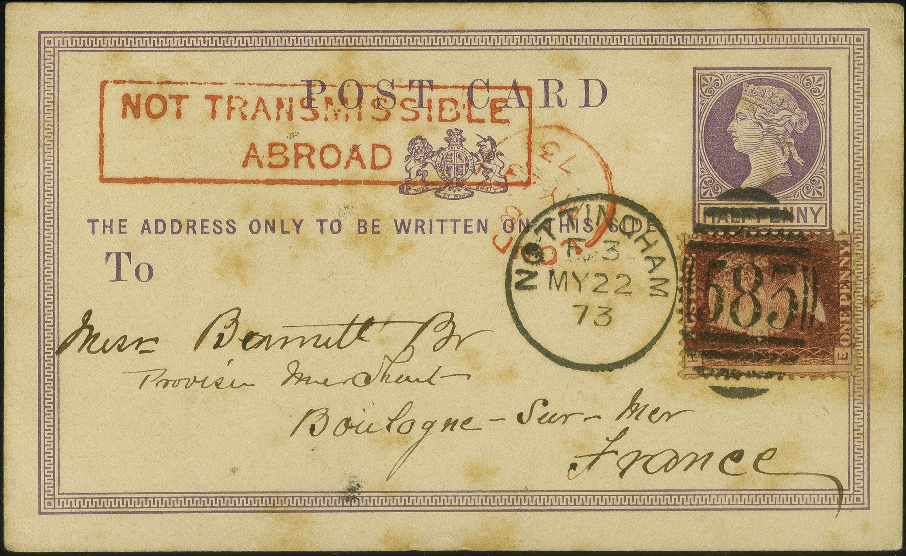 90060 cover image1870: Stationery postal card ½ penny lilac, uprated with 1864, 1 penny red, tied by duplex “583 NOTTINGHAM MY 22 73”, sent to Boulogne-Sur-Mer, France, with instructional boxed rectangular “NOT TRANSMISSIBLE / ABROAD” in red alongside a cds “LONDON MY 23 73”. Reverse, cds “LONDON MY 22 73”. Toning and minor crease. Rare. Earliest known use of this instructional and normally found on the latter 1875 ½ penny brown stationery cards (Image 1) (Image 2)