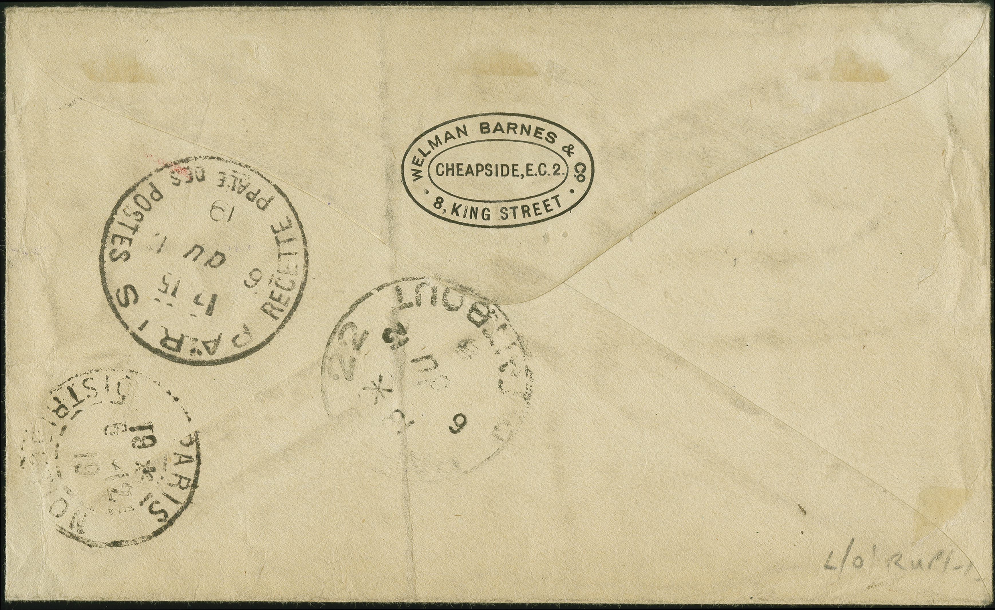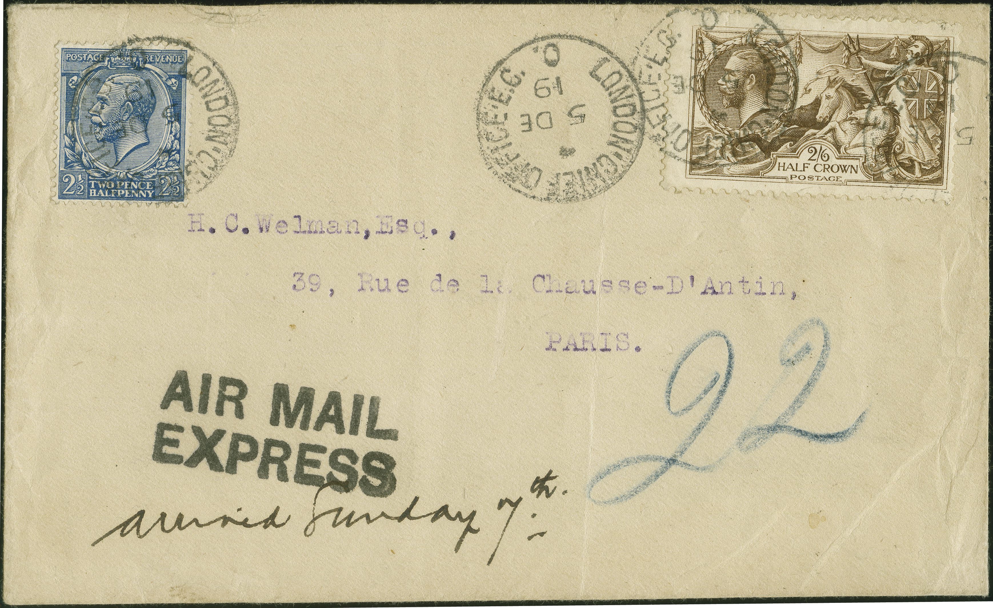 90055 cover image1918: Bradbury Seahorse, 2 shilling 6 pence dull sepia-brown, with 1912/14, 2½ pence blue, good colour, perforations mainly fine, tied by cds “LONDON CHIEF OFFICE E.C. 5 DE 19” to an envelope with handstamp “AIR MAIL EXPRESS” sent to Paris, France, with manuscript “22” in blue crayon and endorsed “arrived Sunday 7th”. Reverse, three Paris arrival cds “PARIS RECETTE PPALE DES POSTES 6 DU 19”, “PARIS DISTRBUTION 6 12 19”. Minor soiling. Seahorse has some dulled perforations across top. Fine. Illustrating the high-price paid for Express delivery, although the cover took 2 days to arrive (Image 1) (Image 2)