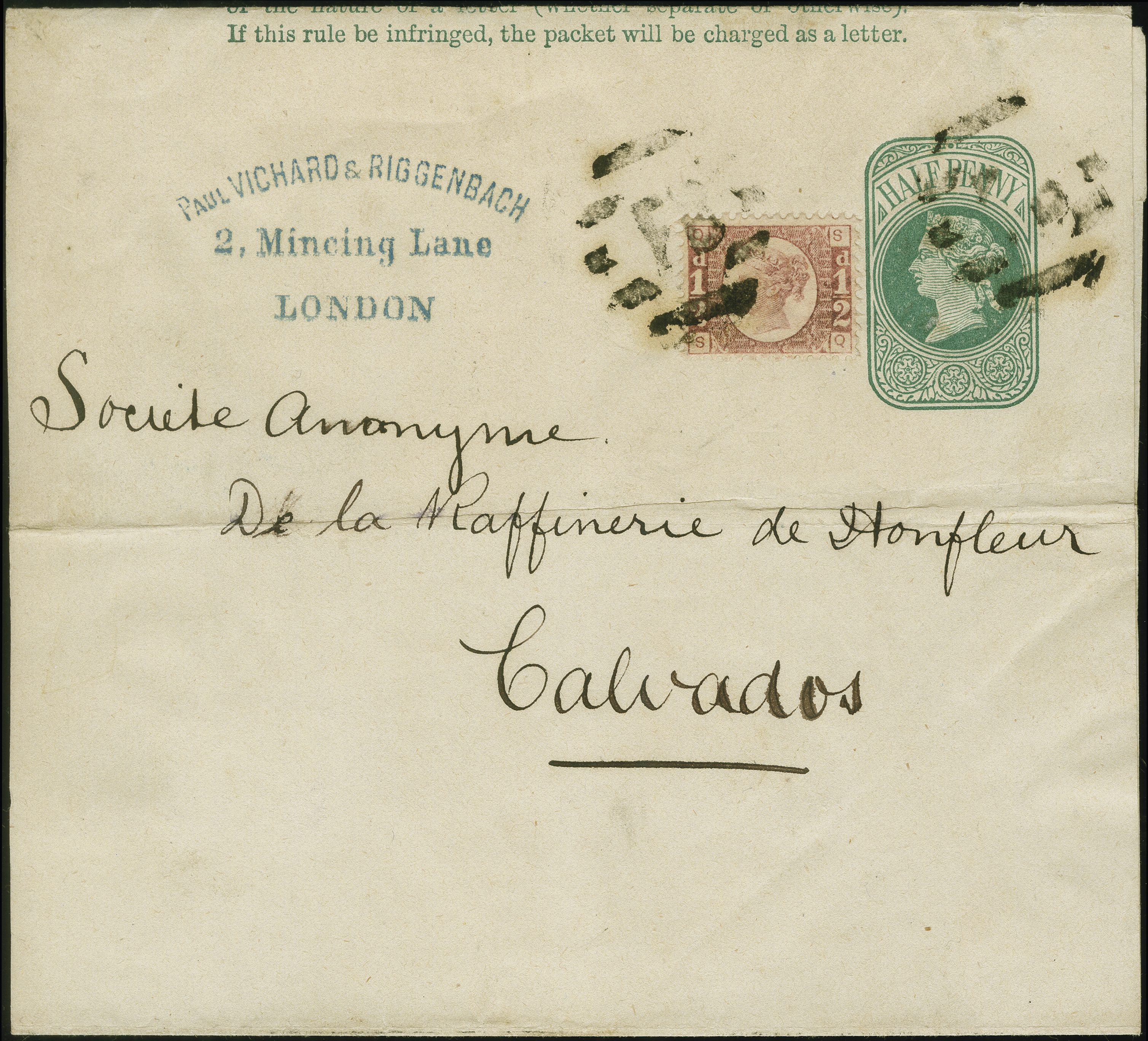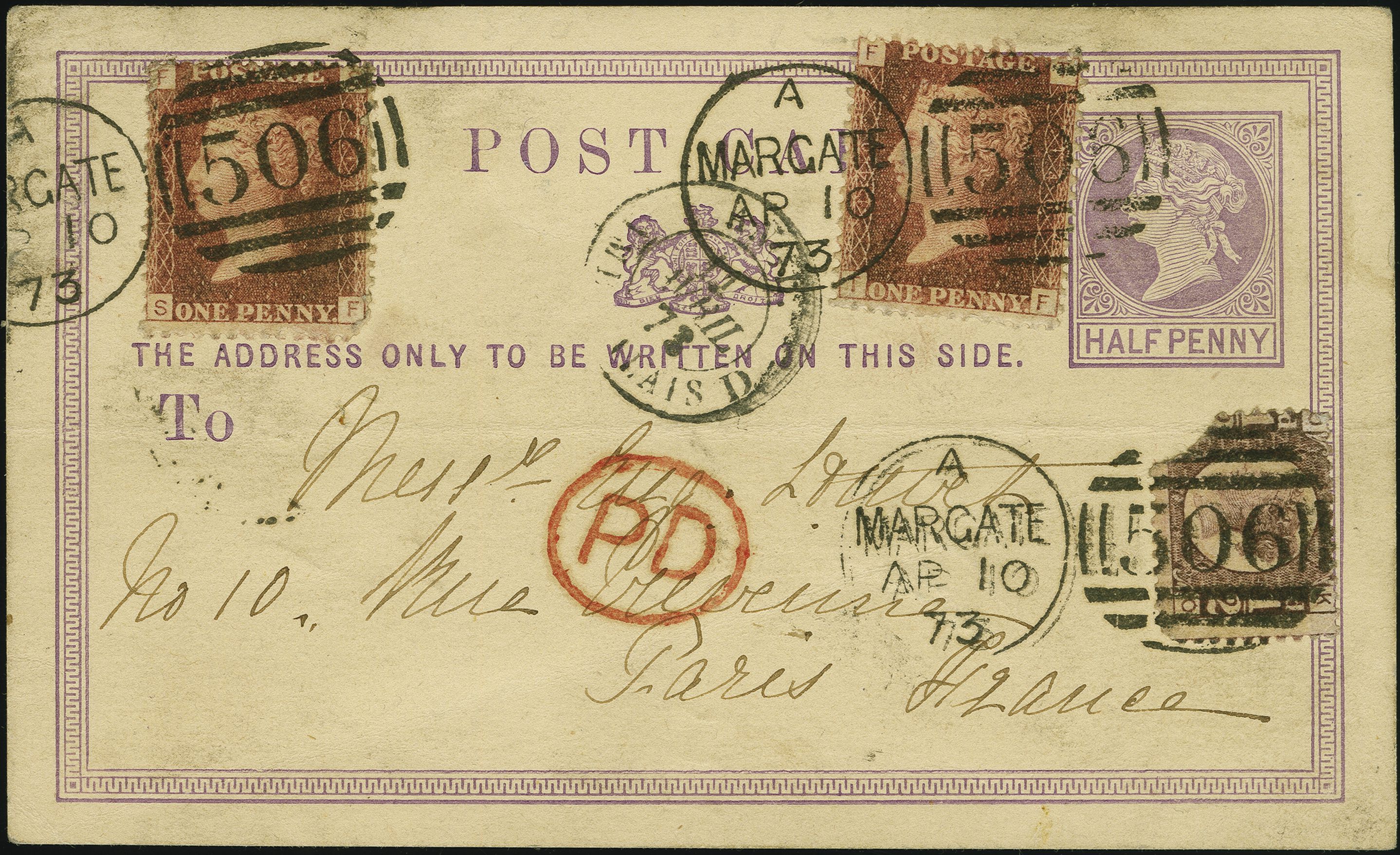 90062 cover image1875: Stationery postal card ½ penny bright lilac, uprated with Line Engraved 1864 1 penny red, two singles and a 1869 ½ penny rose-red (corner fault), all of good colour, some perforation faults, tied by duplex “506 MARGATE AP 10 73” in black, sent to Paris, France, with red oval “PD” and transit cds “CALAISE 11 AP 83. Reverse, cds ”LONDON AP 10 73" and faint arrival “PARIS 11 AP 73”. Creased and soiled. Scarce example illustrating a ‘paid at the letter rate to France’ but despatched contrary to regulations. Note: The card uprated to 3d letter rate to France, whilst violating the regulations against the use of postal cards for foreign destinations, being fully franked at the default rate for all things being sent in the mail, the clerk dispatched it to France. There is a lack of an inspector's mark, so the decision could have been different if this obvious violation had been referred to that officer. Reference: The Postal History of the Universal Postal Union: The Postal Card, Worldwide 1869-1975, Volume 1, illustrated pg. 154. Which states Dr Alan Huggins believes there are no more than 10 such usages of foreign destinations before 1 July 1875, when the British Post Office lifted the ban on the use of postal cards to foreign destinations (Image 1) (Image 2)