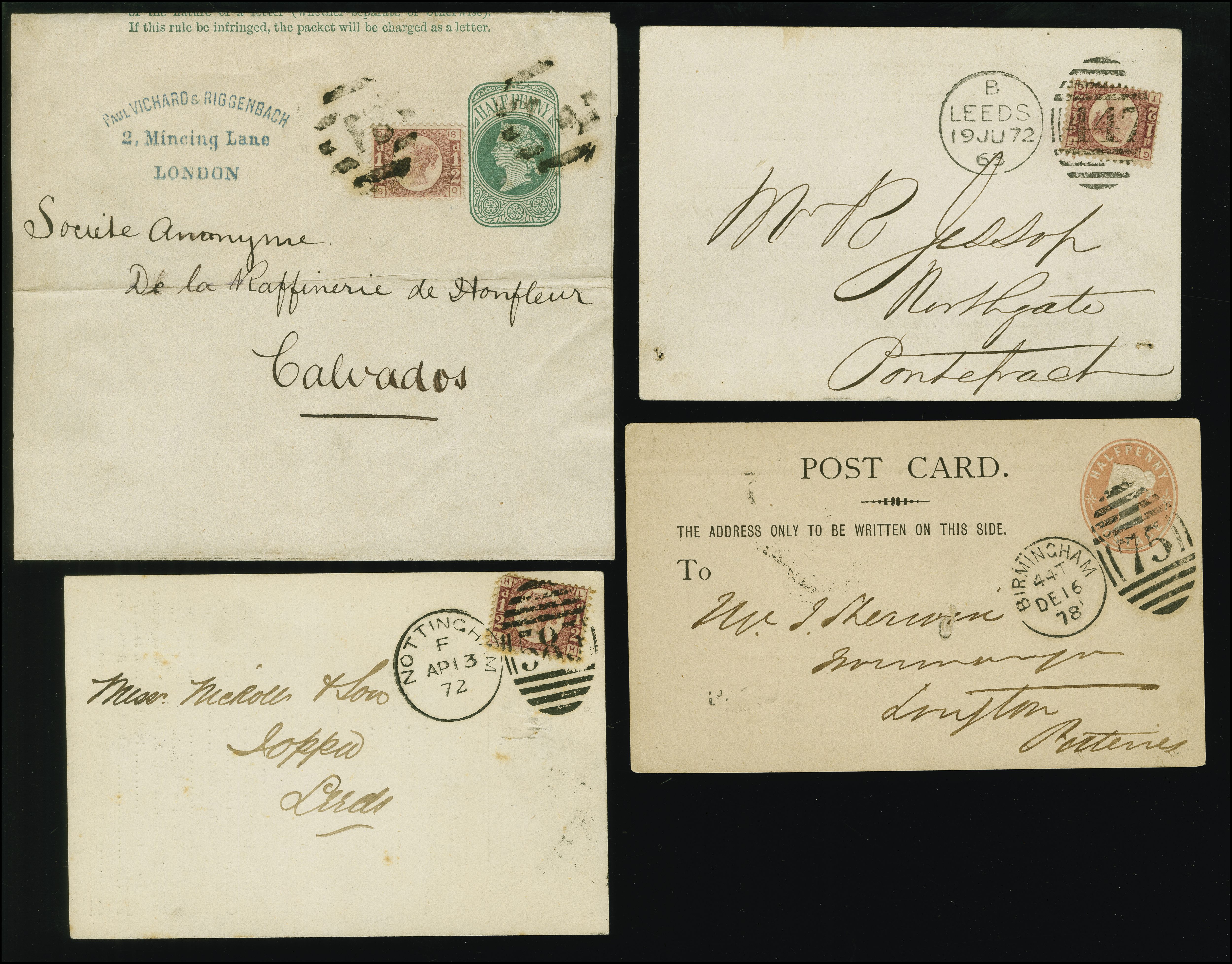 90061 cover image1872/78: Group of three stationery examples, comprising two early private commercial post cards 1872 and franked with Line Engraved 1870, ½ penny rose-red, one sent from Leeds to Pontefract, the other from Nottingham to Leeds. Both with printed reverse. Also, a 1877, newspaper wrapper ½ penny green uprated with 1870, ½ penny rose-red sent to Calvados. Mostly fine. Scarce, the private cards surprisingly hard to locate, especially in good condition. (H&G 5)Two private printed cards:-Reference: The Postal History of the Universal Postal Union: The Postal Card, Worldwide 1869-1975, Volume 1, illustrated pg. 114 (Leeds) & 114 (Nottingham) (Image 1) (Image 2)